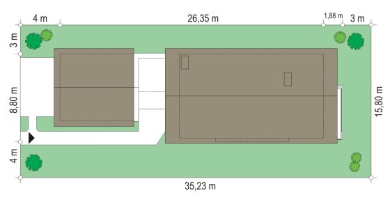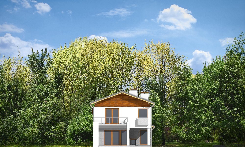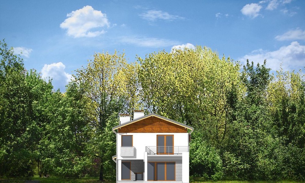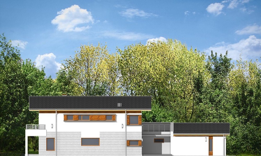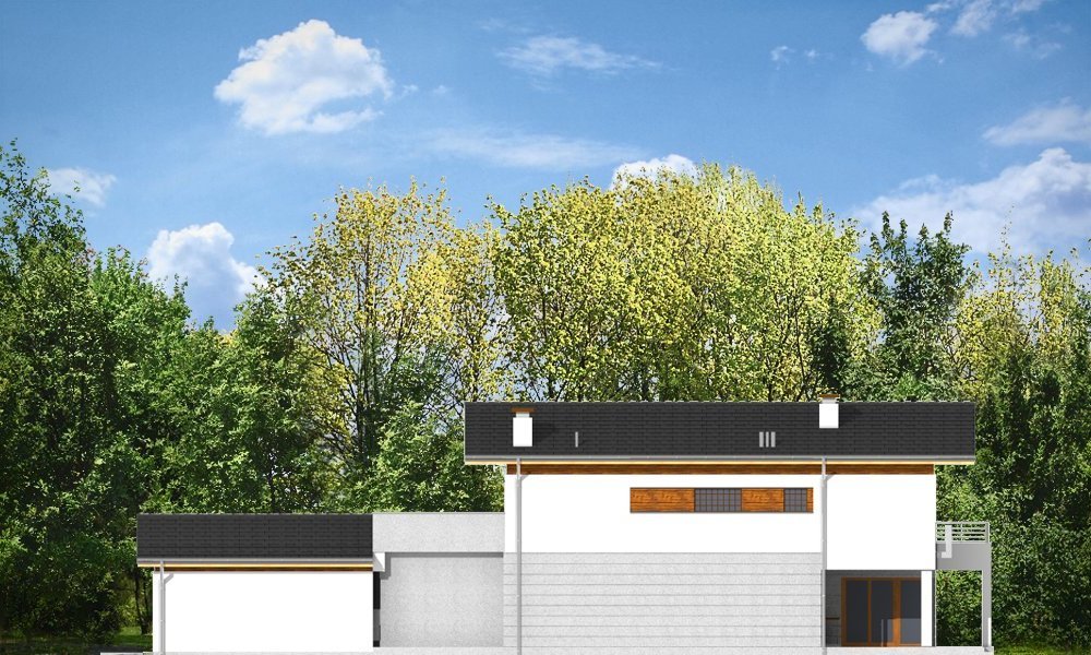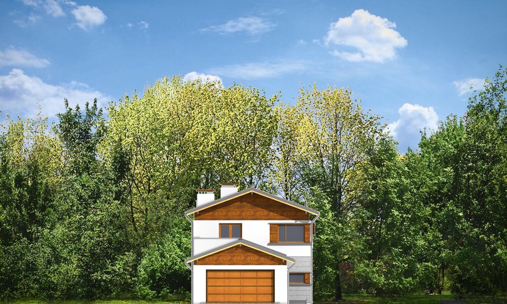 Lugano to willa jednorodzinna dla rodziny cztero-pięcioosobowej. Piętrowy budynek przykryty został dwuspadowym symetrycznym dachem z dachówki ceramicznej. Dom ma nowoczesny charakter, zaprojektowany został z przeznaczeniem dla wąskich działek, na których budynek musi mieć formę długiego wąskiego prostopadłościanu. Część garażowa parterowa została wyciągnięta przed główną bryłę budynku, urozmaicając w ten sposób część frontową. Od strony ogrodu bryłę domu ozdabia narożne okno salonu, podcień i taras piętra na bocznych słupach. Dwuspadowy łagodny dach z dużymi okapami dodaje całemu budynkowi dynamiki. Wnętrze podzielono na jednoprzestrzenną część dzienną na parterze, z ciekawymi, jednobiegowymi schodami, stanowiącymi niewątpliwą ozdobę salonu, oraz część nocną piętra z czterema sypialniami i dużą rodzinną łazienką. Domek pomimo niewielkiej powierzchni jest zaprojektowany funkcjonalnie, a same pomieszczenia są słusznej wielkości. Na parterze obok salonu swoje miejsce znalazł dodatkowy pokój - gabinet lub sypialnia gościnna. Garaż połączono z resztą domu przez duże pomieszczenie techniczne. Z pokoju dziennego można podziwiać ogród przez duże przeszklone otwarcie, połączone z podcieniem z kominkiem zewnętrznym i tarasem. Projekt dostępny jest również w wersji odbicia lustrzanego.