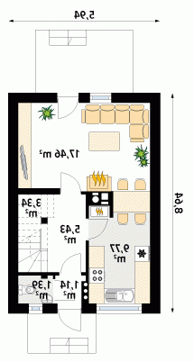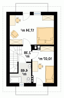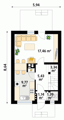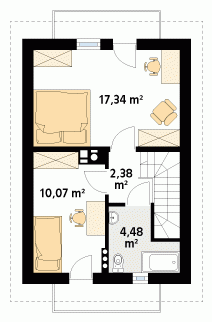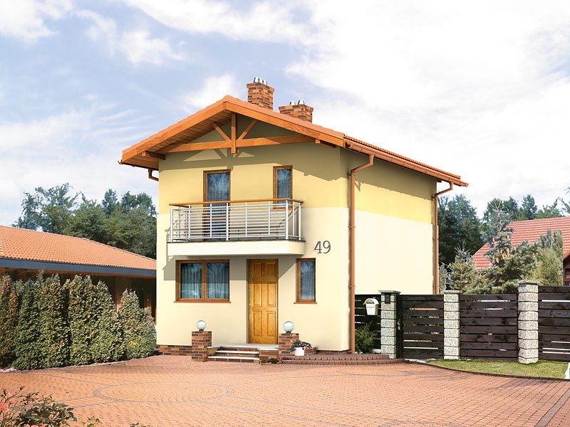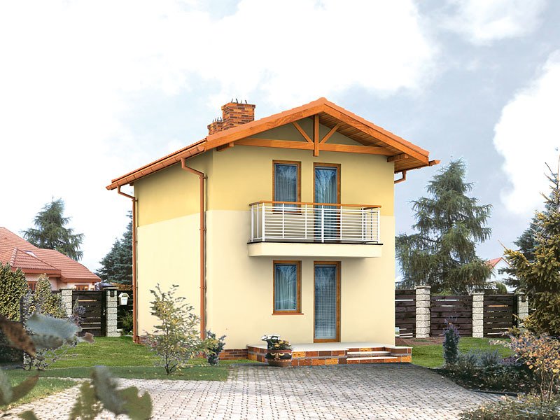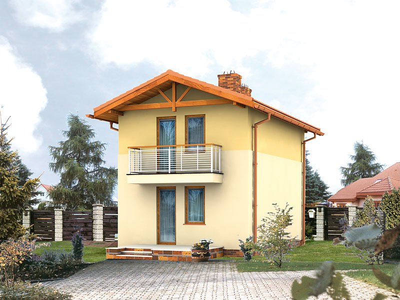 Mały, funkcjonalny domek jednorodzinny dla 2 – 3-osobowej rodziny. Dwie pełne kondygnacje. Idealny na wąską działkę.