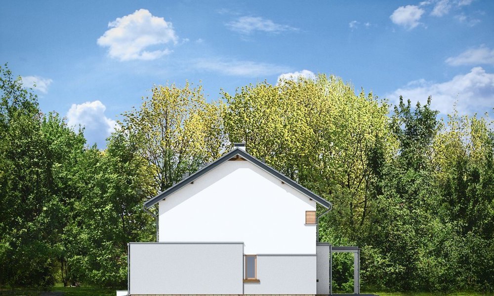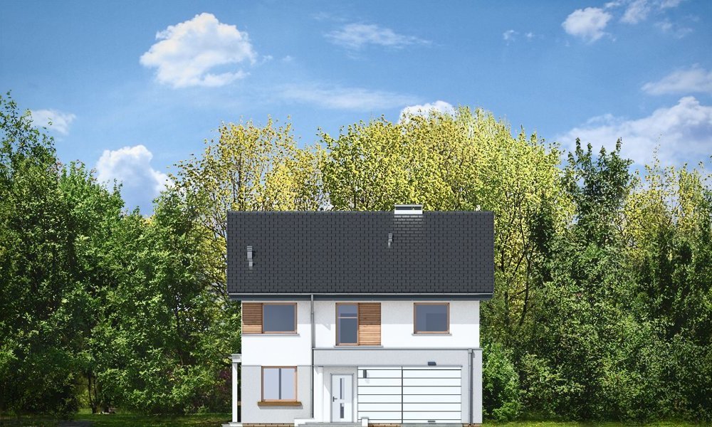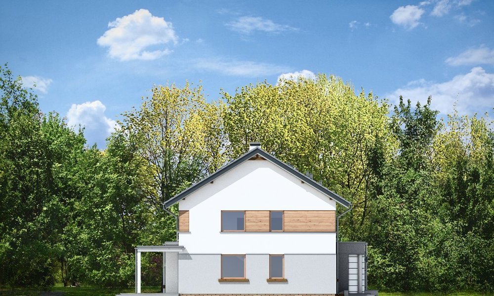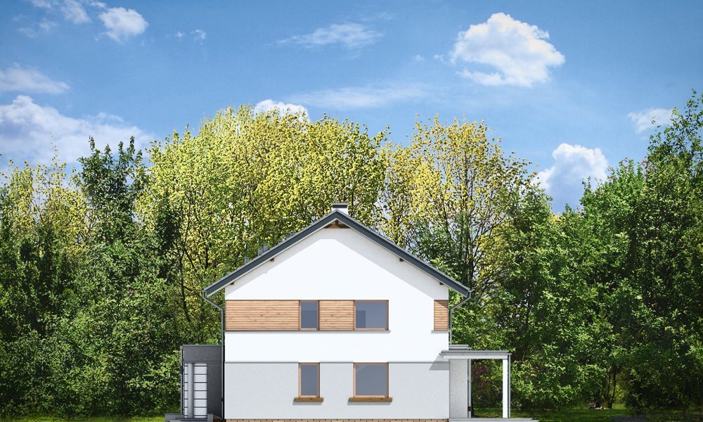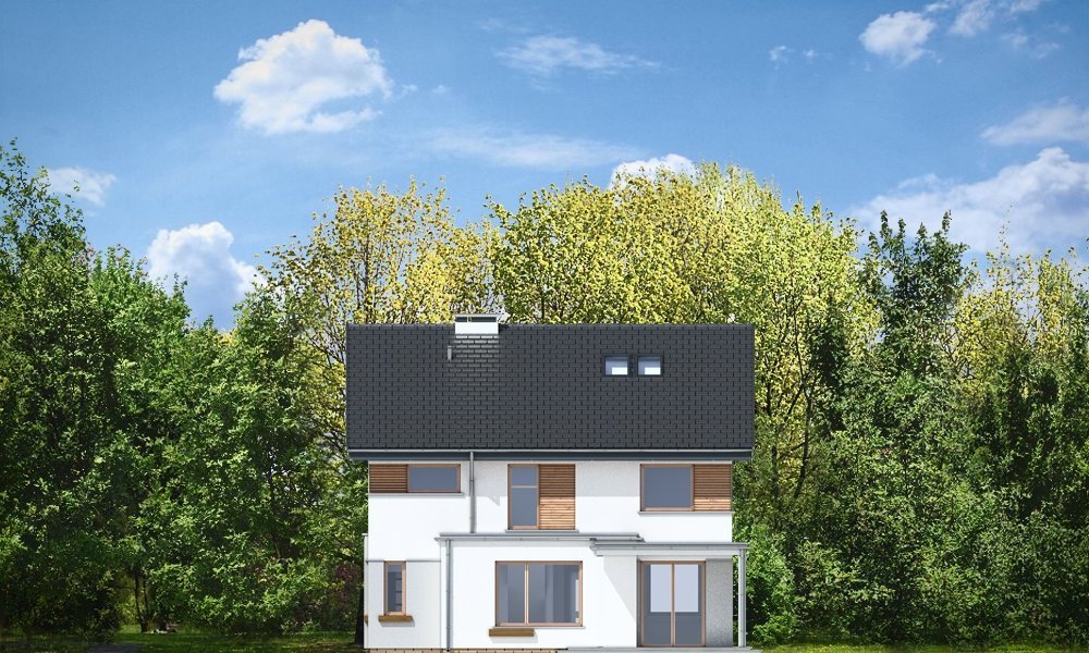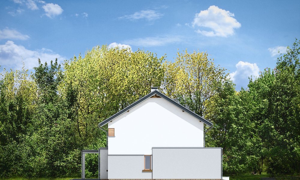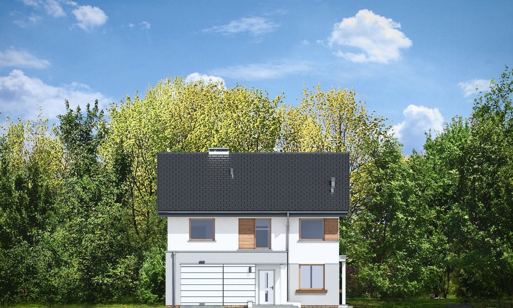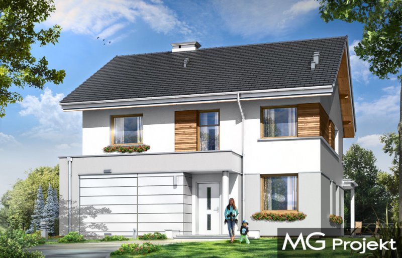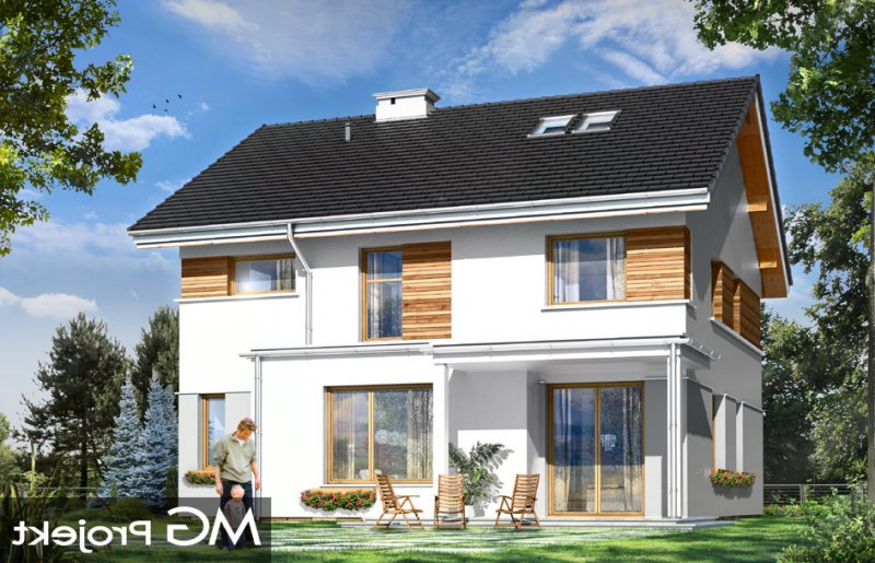 Miranda to nieduży piętrowy domek dla czteroosobowej rodziny. Budynek charakteryzuje się zwartą, prostą w budowie bryłą i nowoczesną architekturą. Dom stworzono na planie kwadratu, przekryto go dwuspadowym dachem. Lekko wystający garaż z podcieniem wejściowym, zadaszenie nad tarasem ogrodowym, okładziny naścienne wokół okien - wszystkie te elementy urozmaicają sylwetkę nadając jej atrakcyjny wygląd. Wnętrze domu podzielono na część dzienną i gospodarczą na parterze, oraz sypialnie na piętrze. Salon połączony został z aneksem jadalnym, holem z wyeksponowanymi schodami i otwartą kuchnią, tworząc w ten sposób jednoprzestrzenne wnętrze dzienne. Garaż dostępny z przedsionka, oraz duża kotłownia stanowią część gospodarczą budynku. Zaprojektowane trzy wygodne sypialnie na piętrze, z garderobą w sypialni rodziców, oraz łazienka z pralnią, to część nocna. Domek, choć o niewielkiej powierzchni, mieści w sobie wszystkie potrzebne pomieszczenia. Pokoje są obszerne, a dzięki piętru - nie ma skosów. Nad piętrem znajduje się strych do ewentualnej adaptacji. Pracownia posiada również wersję w odbiciu lustrzanym.