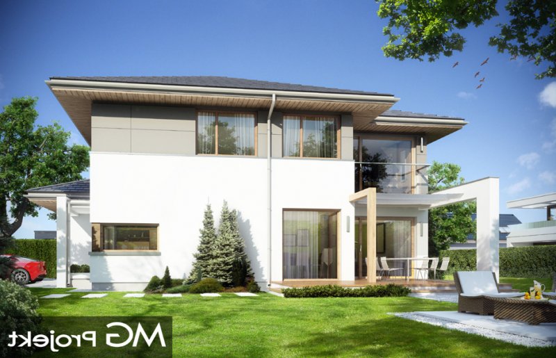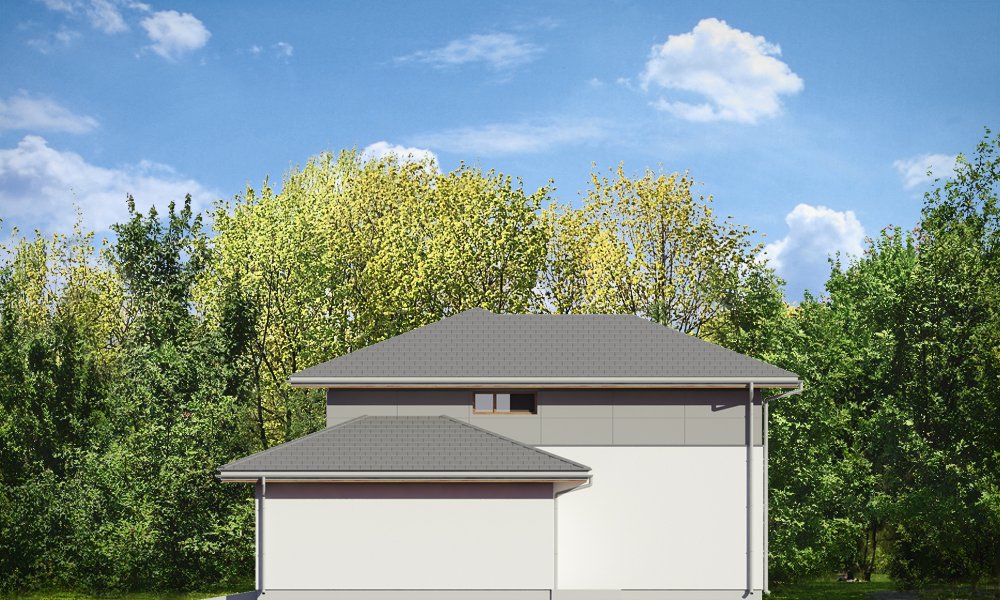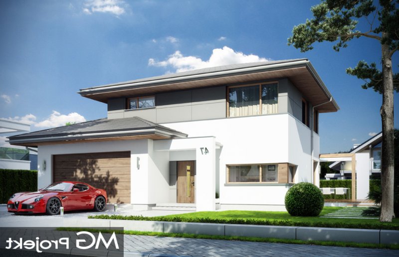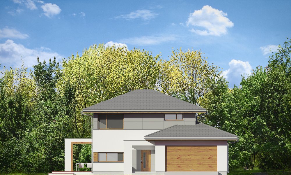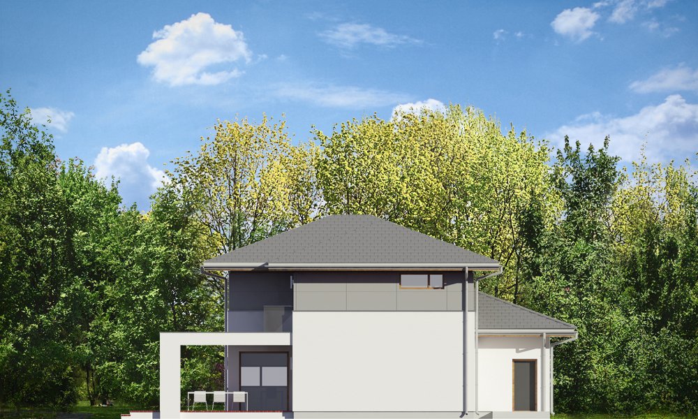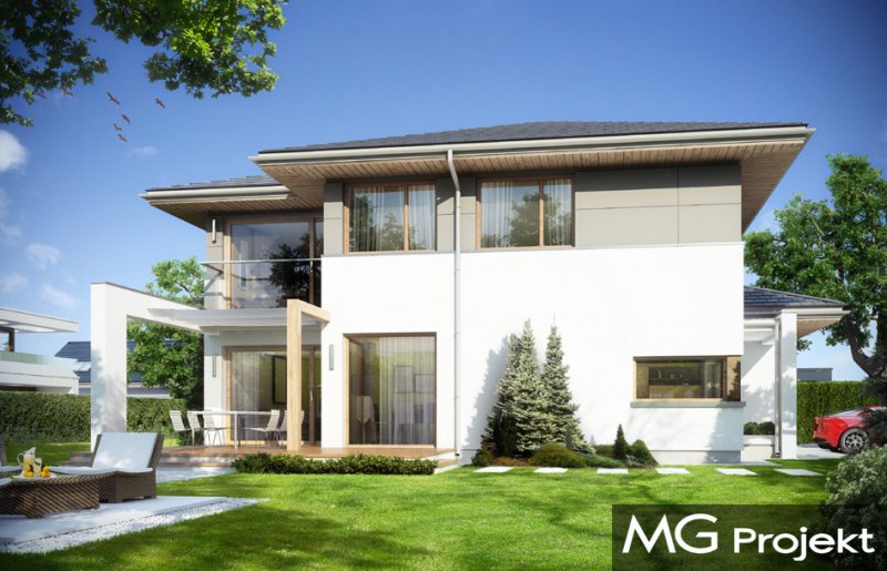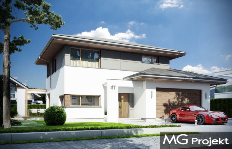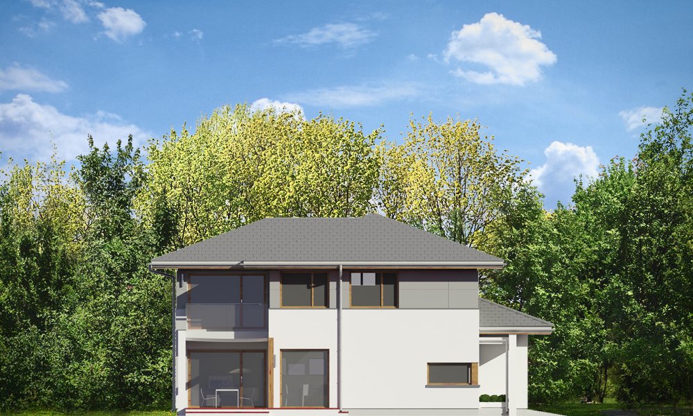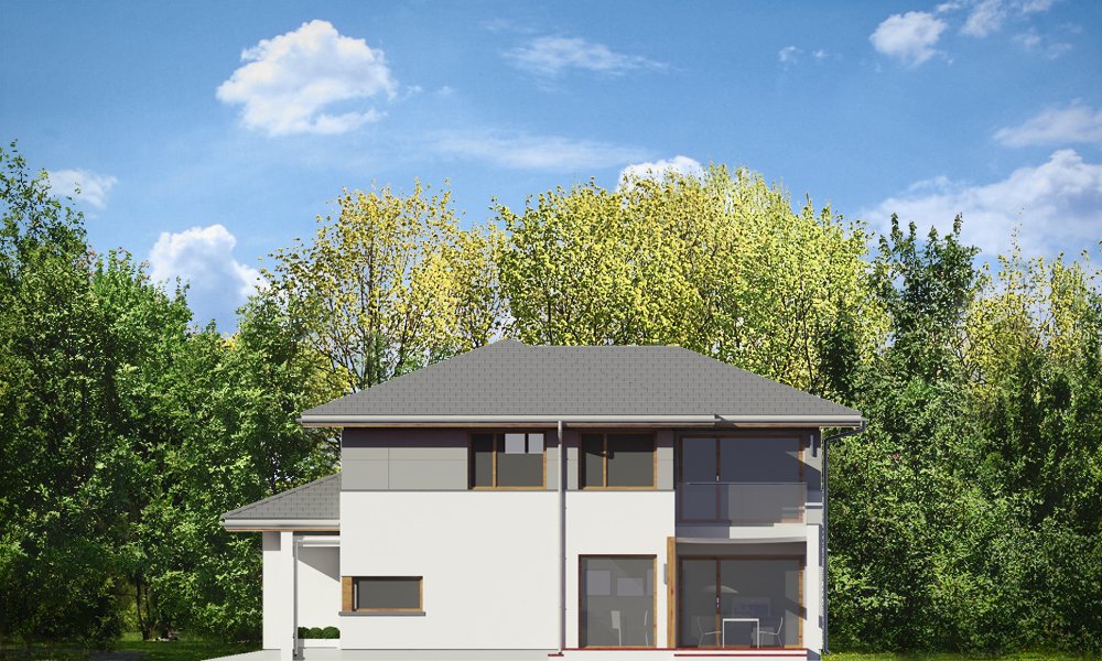 Modena to uroczy i energooszczędny piętrowy dom dla cztero-pięcioosobowej rodziny. Jest to propozycja dla Inwestorów lubiących nowoczesną architekturę, którzy nie rezygnują z funkcjonalności i komfortu swojego domu. Dom swoim stylem stara się nawiązać do charakteru efektownych miejskich willi. Piętrowa bryła budynku została przekryta wielospadowym dachem. Dobrze dobrane detale architektoniczne, ciekawie rozmieszczone okna, włókno cementowe okładziny na ścianach - wszystko to tworzy atrakcyjny wygląd zewnętrzny domu. Wnętrze to otwarta część dzienna na parterze, z salonem, holem z ładnie wkomponowanymi schodami, jadalnią i kuchnią, oraz sypialnie na piętrze domu. Duże przeszklenia w salonie i jadalni pozwalają cieszyć się widokiem ogrodu z wnętrza budynku. Na parterze wygospodarowano podręczną spiżarnię bezpośrednio przy kuchni. Duża kotłownia za garażem znakomicie może pełnić również rolę pomieszczenia gospodarczego w którym schowamy narzędzia ogrodowe. Na piętrze znajduje się apartament rodziców z własną łazienką i garderobą, sypialnie dziecięce z łazienką, oraz dodatkowy pokój i pralnia. Wnętrze domu jest przestronne, a poszczególne pokoje duże i kształtne. Projekt mimo niewielkiej powierzchni można uznać za komfortowy, wręcz luksusowy dom dla współczesnej rodziny. Pracownia posiada wersję odbicia lustrzanego projektu.