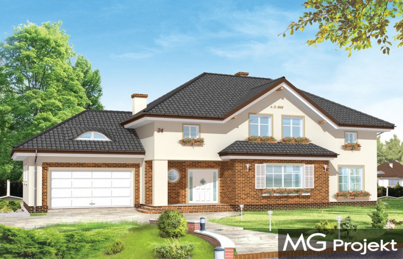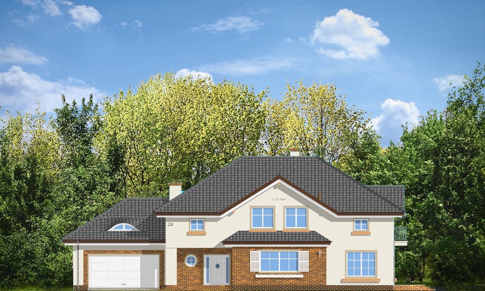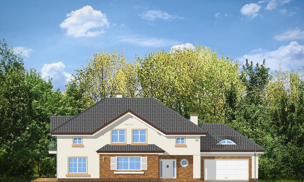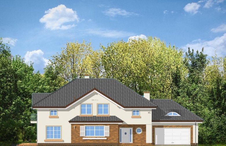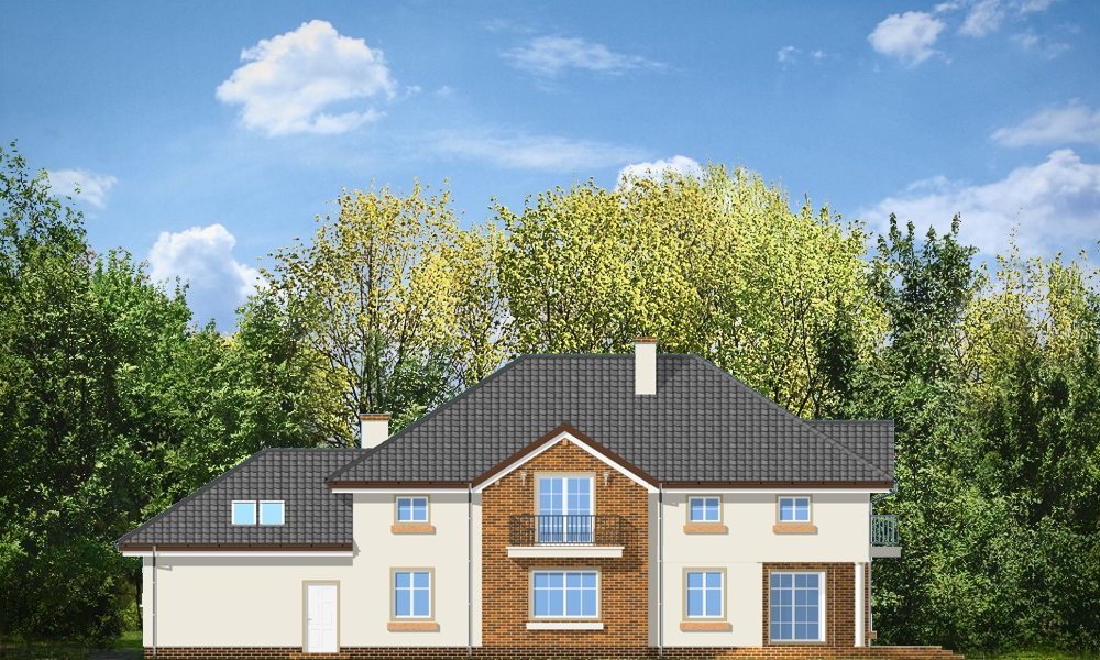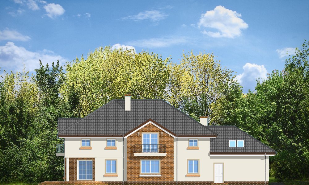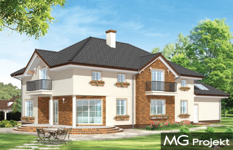 Okazały to duży, reprezentacyjny dom, dla rodziny 4-6 osobowej. Piętrowa bryła domu tworzy pełnowymiarowe pokoje na piętrze, bez skosów przy ścianach zewnętrznych. Na parterze zaprojektowano duży salon połączony z holem i aneksem jadalnym. Salon posiada piękne obniżone okno w ściętym narożniku, wychodzące na ogród. Jadalnia jest częściowo połączona z obszerną kuchnią ze spiżarnią. Na parterze zaprojektowano dodatkowy pokój-gabinet i dodatkowe pomieszczenie gospodarcze. Na piętrze zaprojektowano 4 sypialnie, w tym jedna - sypialnia rodziców - z własną łazienką i garderobą. Nad garażem zaplanowano strych - mogący służyć np. jako pokój z kinem domowym lub sala ćwiczeń. Wygląd zewnętrzny domu: frontowy narożny podcień z eleganckimi drzwiami wejściowymi, duże okno kuchenne, ciekawy tylny podcień ogrodowy wsparty na kolumnach, balkony od strony ogrodowej - wszystkie te elementy nadają bryle finezji i elegancji. Pracownia posiada odbicie lustrzane projektu.