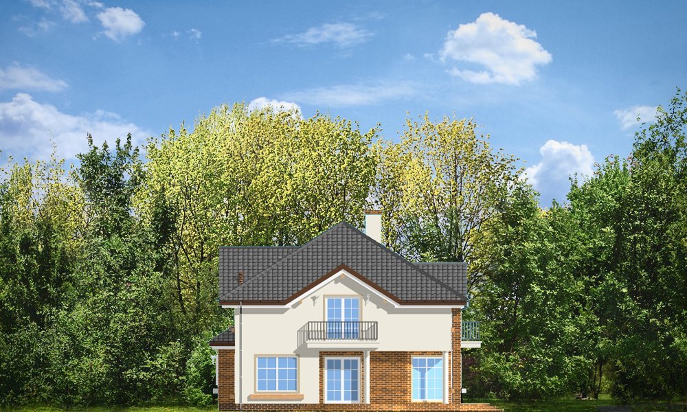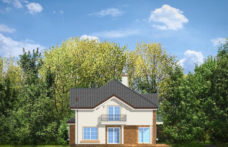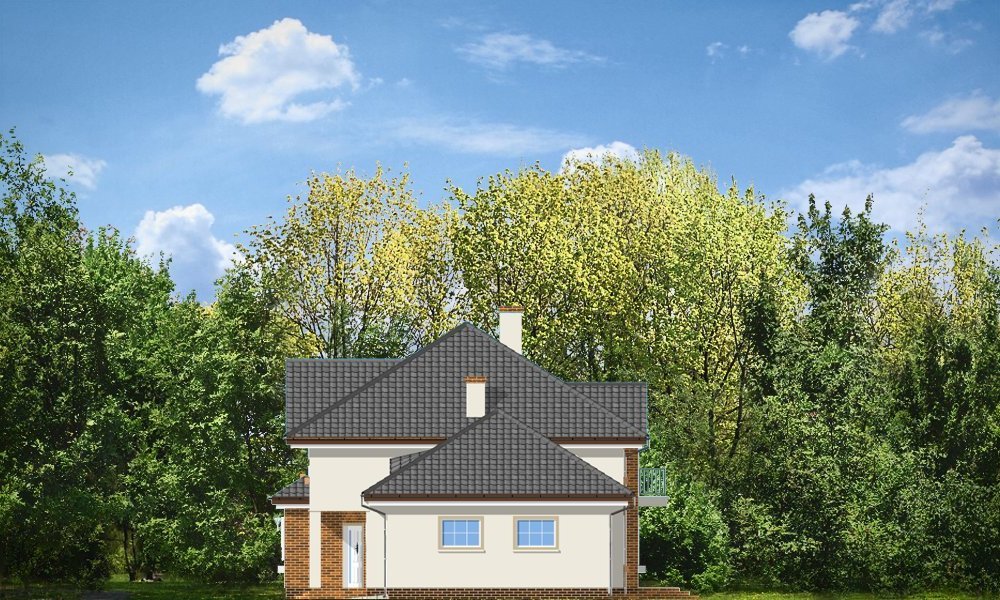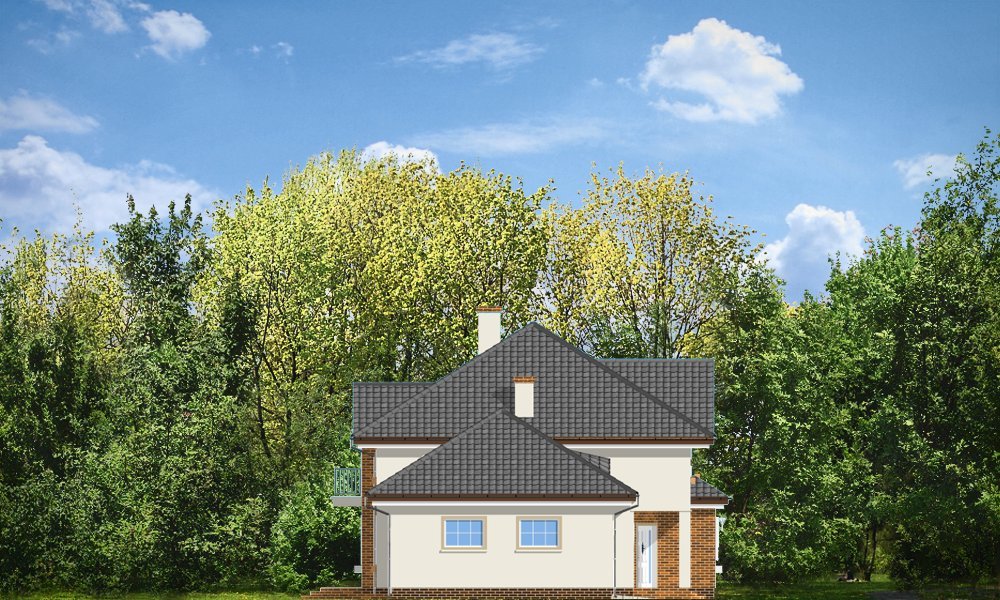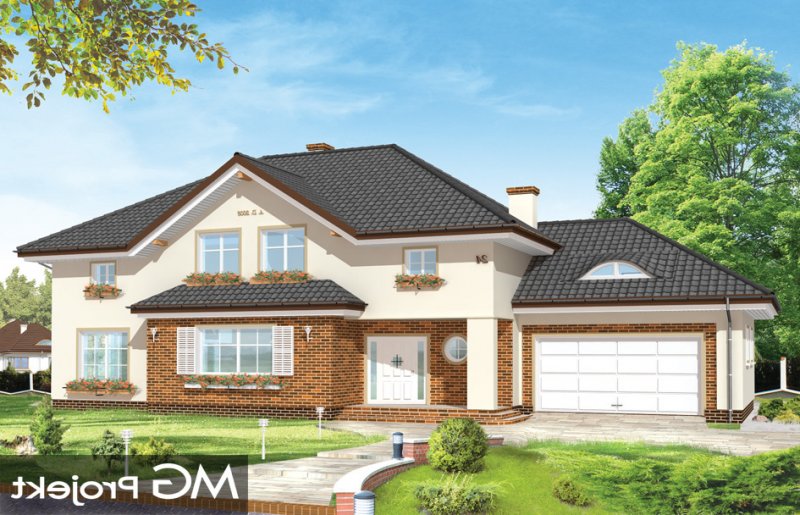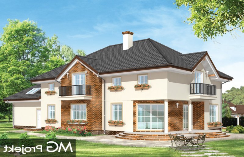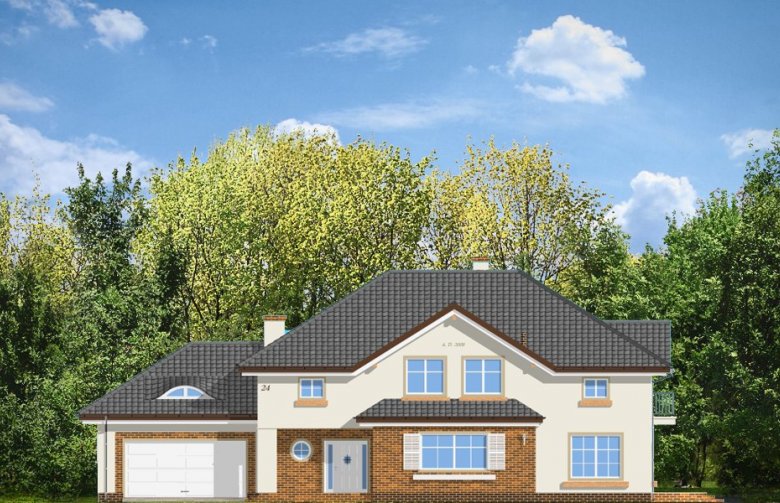 Okazały to duży, reprezentacyjny dom, dla rodziny 4-6 osobowej. Piętrowa bryła domu tworzy pełnowymiarowe pokoje na piętrze, bez skosów przy ścianach zewnętrznych. Na parterze zaprojektowano duży salon połączony z holem i aneksem jadalnym. Salon posiada piękne obniżone okno w ściętym narożniku, wychodzące na ogród. Jadalnia jest częściowo połączona z obszerną kuchnią ze spiżarnią. Na parterze zaprojektowano dodatkowy pokój-gabinet i dodatkowe pomieszczenie gospodarcze. Na piętrze zaprojektowano 4 sypialnie, w tym jedna - sypialnia rodziców - z własną łazienką i garderobą. Nad garażem zaplanowano strych - mogący służyć np. jako pokój z kinem domowym lub sala ćwiczeń. Wygląd zewnętrzny domu: frontowy narożny podcień z eleganckimi drzwiami wejściowymi, duże okno kuchenne, ciekawy tylny podcień ogrodowy wsparty na kolumnach, balkony od strony ogrodowej - wszystkie te elementy nadają bryle finezji i elegancji. Pracownia posiada odbicie lustrzane projektu.