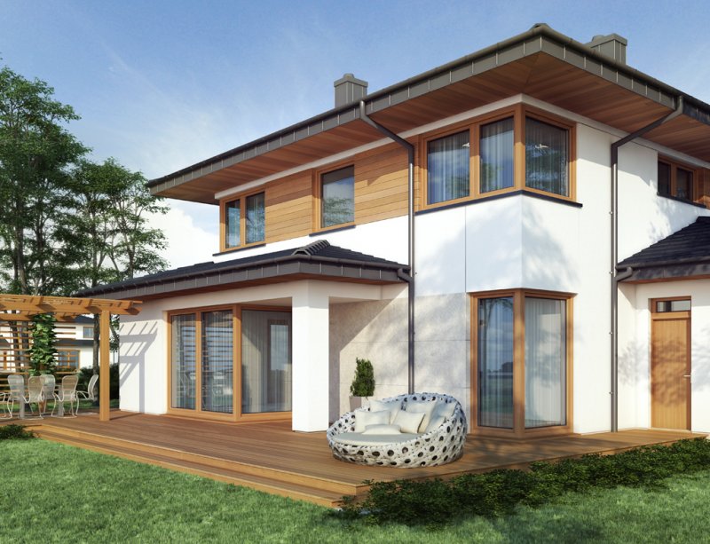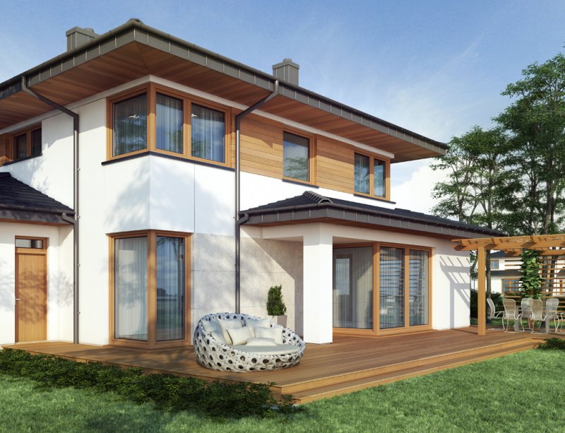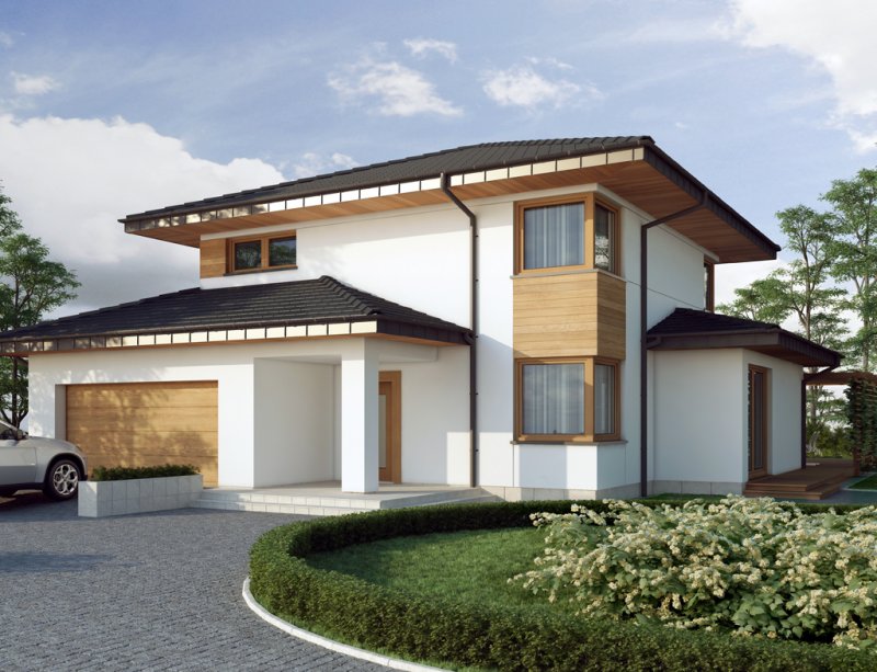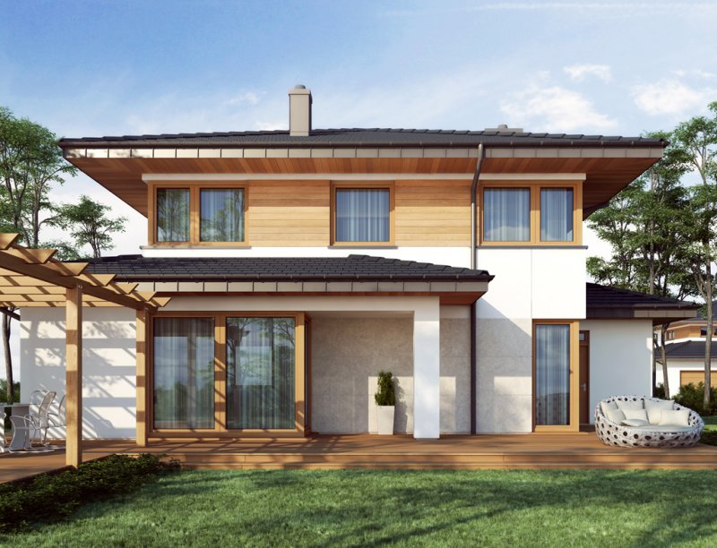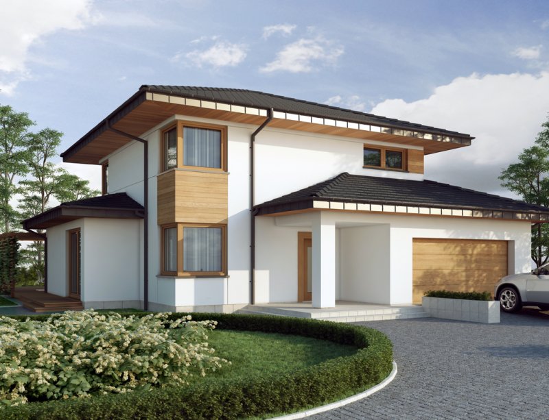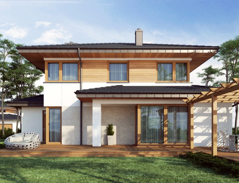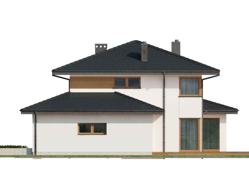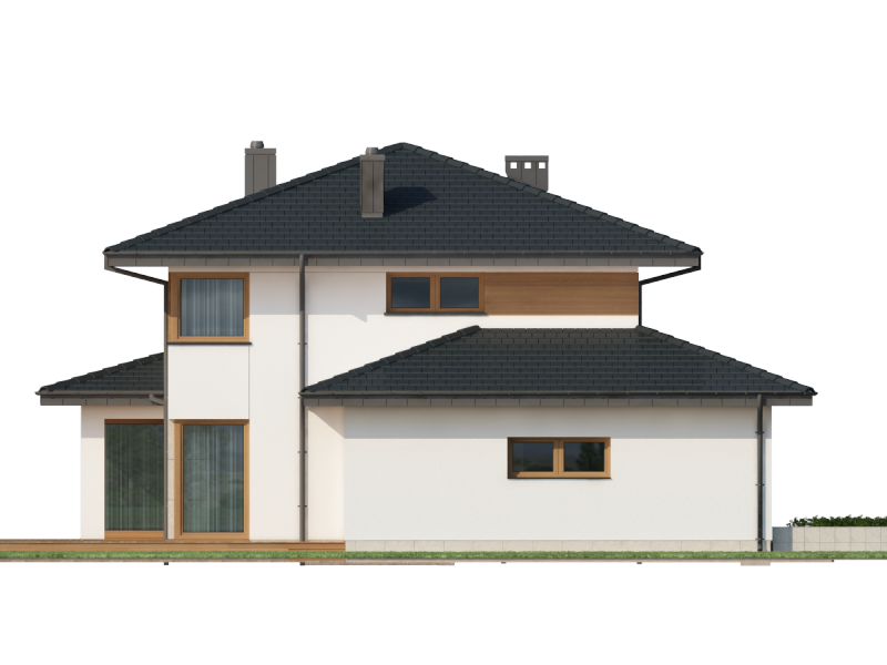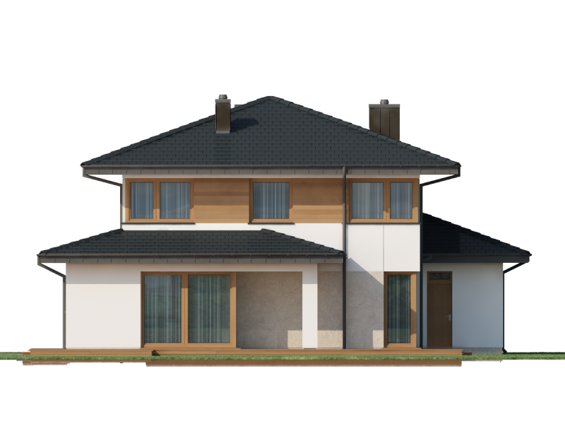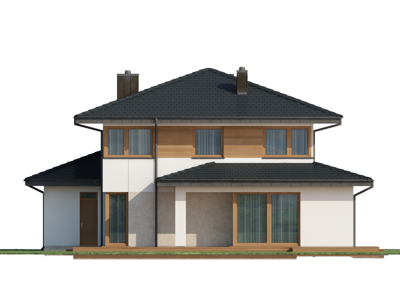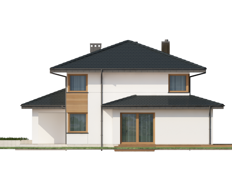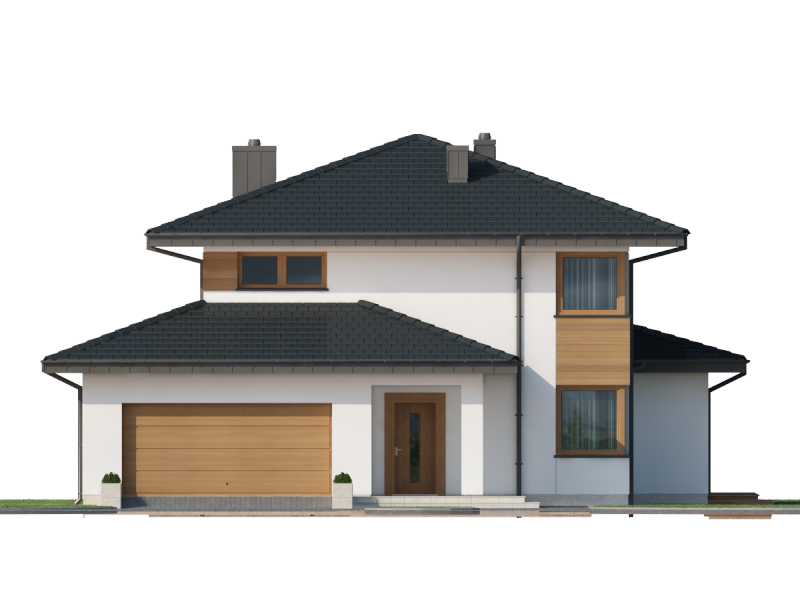 Współczesna bryła, elewacja z domieszką drewna i kamienia, duże przeszklenia – razem składają się na budynek świetnie wpisujący się zarówno w teren niezamieszkały jak i zabudowany. Poliklet to dom piętrowy, doskonały dla 4 – 5 osobowej rodziny. Na parterze znajduje się obszerny, bardzo dobrze nasłoneczniony salon z przytulnym kominkiem. W jego przestrzeni, zaraz przy kuchni, zarysowuje się strefa jadalni z bezpośrednim wyjściem na taras. Wspomniana kuchnia z kolei posiada dostęp do małej praktycznej spiżarki i może służyć jako zamknięta lub stanowić wspólną przestrzeń z salonem. Niedaleko wejścia głównego znajduje się pokój, mogący pełnić funkcję sypialni, gabinetu czy np. pokoju hobby. Zadaszenie nad strefą wejściową zabezpiecza przed opadami, natomiast to nad tarasem dodatkowo daje ochronę przed intensywnym letnim słońcem. Na pierwszym piętrze zaprojektowano 3 pokoje sypialne. Największy z nich jest wyposażony w osobną równie okazałą łazienkę i garderobę. Istnieje możliwość połączenia dwóch występujących na piętrze łazienek w jeden ekskluzywny salon kąpielowy. Podobnie można postąpić z pralnią i garderobą, zyskując tym samym dostępną z hallu dużą garderobę.