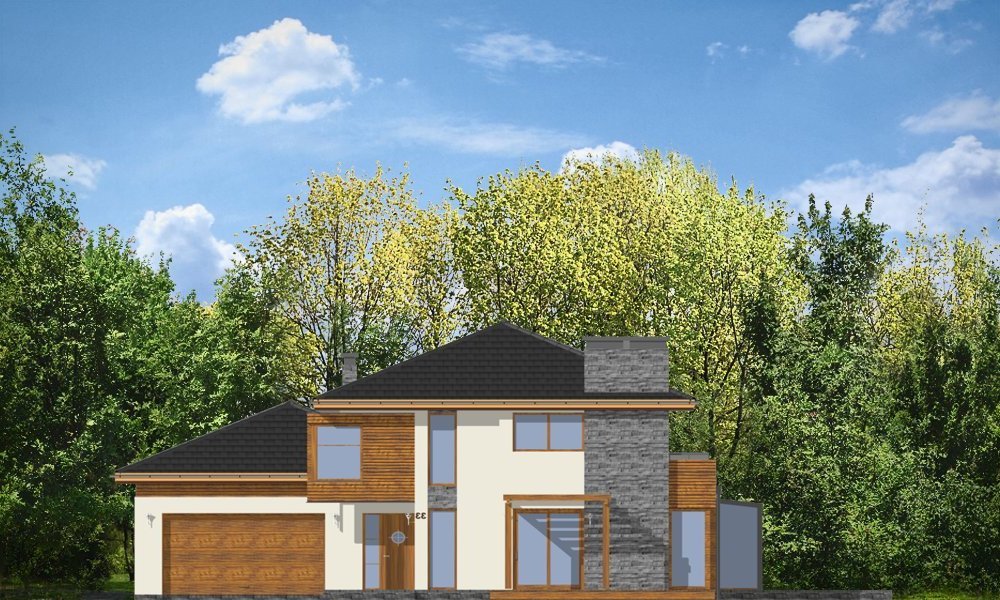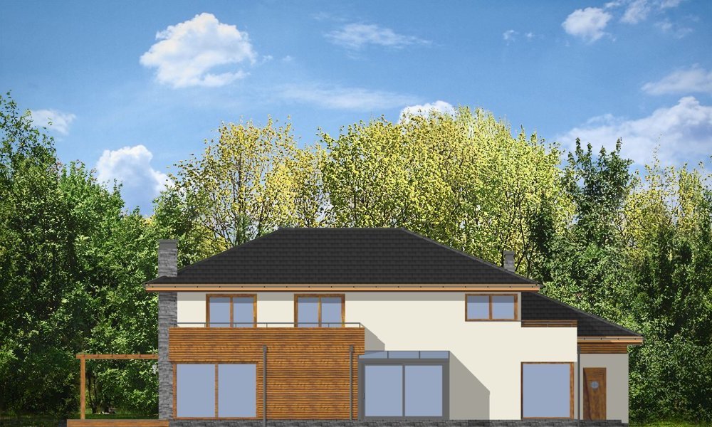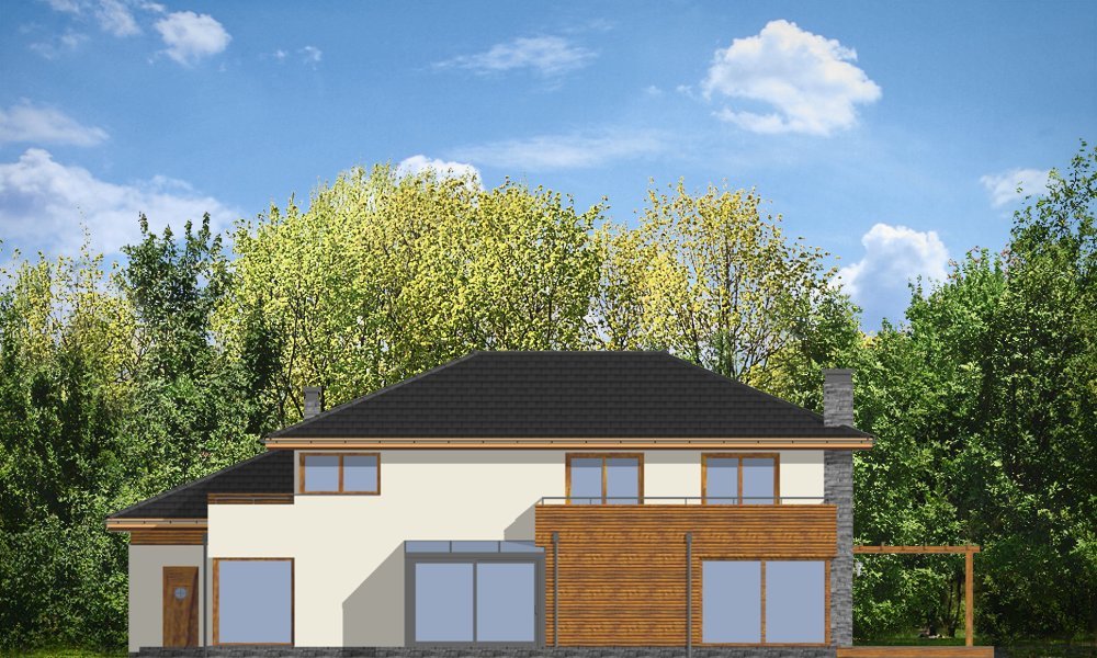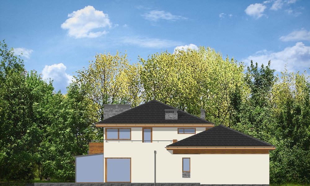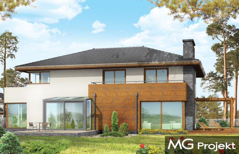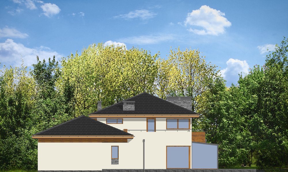 Południowy to komfortowy, bardzo oryginalny dom, o nowoczesnej architekturze. Zaprojektowano go z myślą o 4-5 osobowej rodzinie. Dom, dzięki otwarciu części dziennej na kilka stron świata może być adaptowany zarówno na działce z niekorzystnym wjazdem od strony południowej, jak i na działce z wjazdem od strony północnej lub bocznej (wschodniej lub zachodniej). Budynek składa się z głównej, dwukondygnacyjnej bryły oraz parterowej części garażowej. Duże przeszklenia, prostokątne wykusze, tarasy piętra - wszystkie te elementy podkreślają nowoczesność architektury domu. Prosta kubiczna bryła budynku została urozmaicona rozsądnie dobranymi detalami. Wnętrze domu na parterze to: przestrzeń dzienna łącząca salon, jadalnię z oranżerią, lub wariantowo podcienionym tarasem. Zaprojektowano tu również pomieszczenie rekreacji, które może również służyć jako biblioteka, pokój sportowy, lub ewentualnie sypialnia gościnna. Bardzo duża kuchnia z wyspą umieszczona została bliżej strefy wejściowej i garaży. Do garażu i pomieszczeń technicznych dostajemy się przez gospodarcze wejście kuchenne. Mieszczą się tam duży dwustanowiskowy garaż, pomieszczenie gospodarcze z dostępem na strych nad garażem, kotłownia-pralnia z wyjściem na ogród i spiżarnia. Na piętrze zaplanowano apartament rodziców z garderobami, łazienką i własnym tarasem, dwie sypialnie dzieci z łazienką, oraz gabinet-bibliotekę z oknami widokowymi na część wejściową do domu. Pracownia dysponuje również wersją projektu w odbiciu lustrzanym.