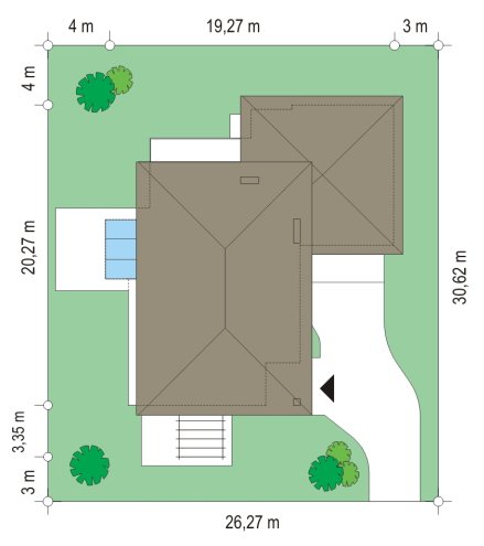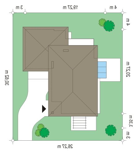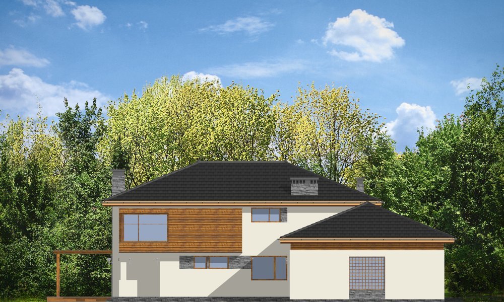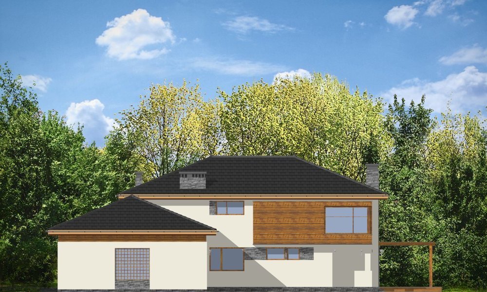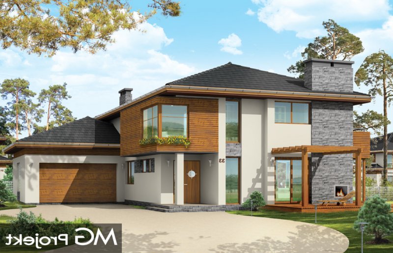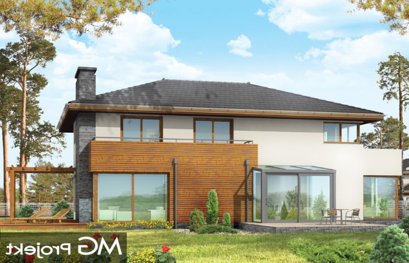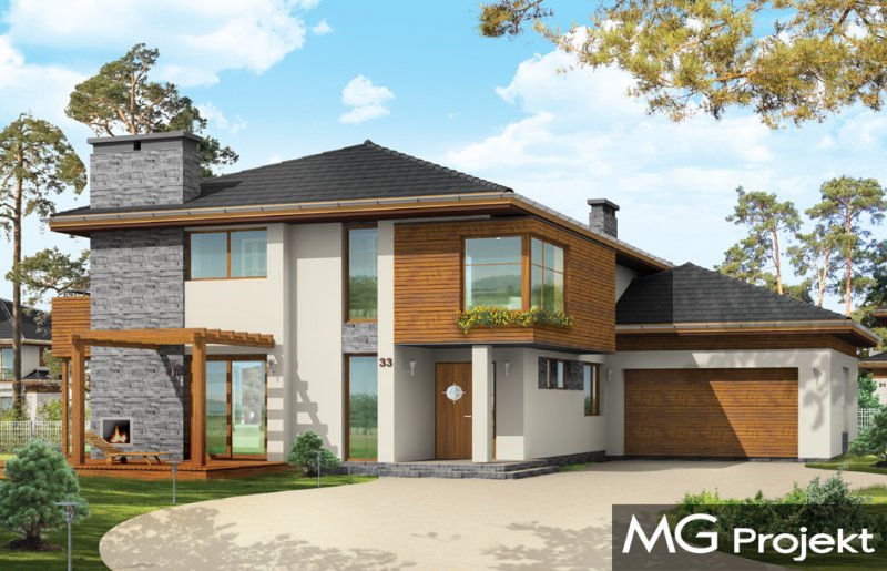 Południowy to komfortowy, bardzo oryginalny dom, o nowoczesnej architekturze. Zaprojektowano go z myślą o 4-5 osobowej rodzinie. Dom, dzięki otwarciu części dziennej na kilka stron świata może być adaptowany zarówno na działce z niekorzystnym wjazdem od strony południowej, jak i na działce z wjazdem od strony północnej lub bocznej (wschodniej lub zachodniej). Budynek składa się z głównej, dwukondygnacyjnej bryły oraz parterowej części garażowej. Duże przeszklenia, prostokątne wykusze, tarasy piętra - wszystkie te elementy podkreślają nowoczesność architektury domu. Prosta kubiczna bryła budynku została urozmaicona rozsądnie dobranymi detalami. Wnętrze domu na parterze to: przestrzeń dzienna łącząca salon, jadalnię z oranżerią, lub wariantowo podcienionym tarasem. Zaprojektowano tu również pomieszczenie rekreacji, które może również służyć jako biblioteka, pokój sportowy, lub ewentualnie sypialnia gościnna. Bardzo duża kuchnia z wyspą umieszczona została bliżej strefy wejściowej i garaży. Do garażu i pomieszczeń technicznych dostajemy się przez gospodarcze wejście kuchenne. Mieszczą się tam duży dwustanowiskowy garaż, pomieszczenie gospodarcze z dostępem na strych nad garażem, kotłownia-pralnia z wyjściem na ogród i spiżarnia. Na piętrze zaplanowano apartament rodziców z garderobami, łazienką i własnym tarasem, dwie sypialnie dzieci z łazienką, oraz gabinet-bibliotekę z oknami widokowymi na część wejściową do domu. Pracownia dysponuje również wersją projektu w odbiciu lustrzanym.