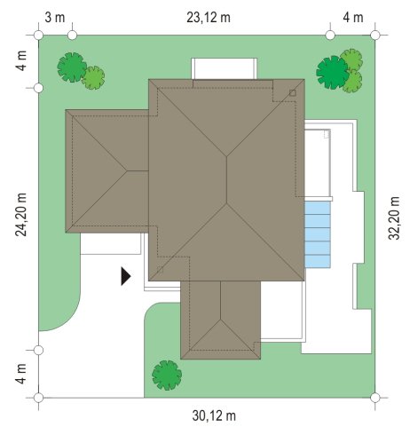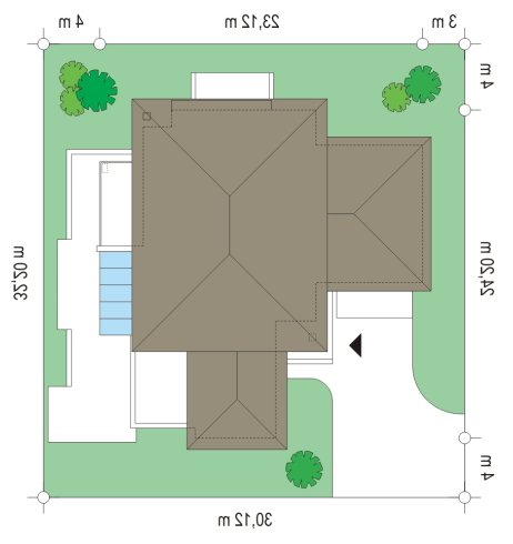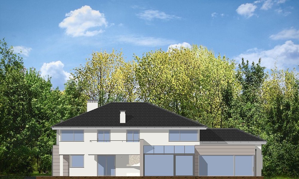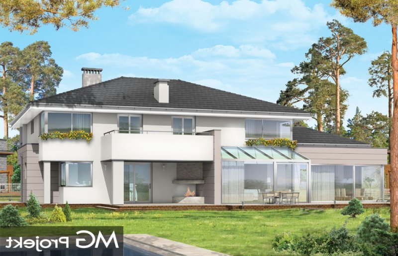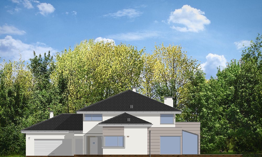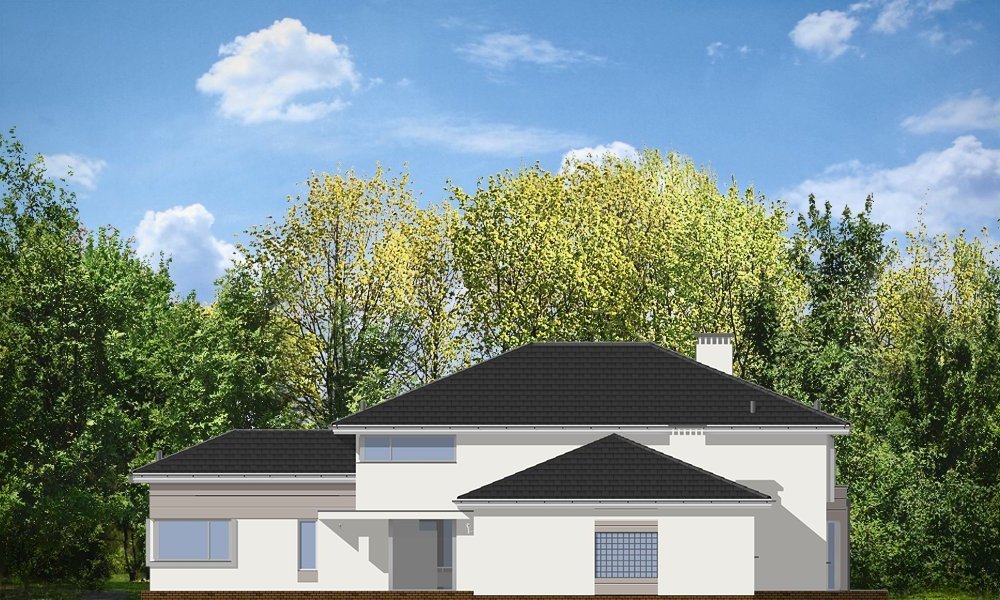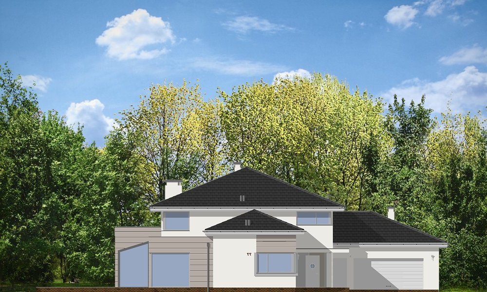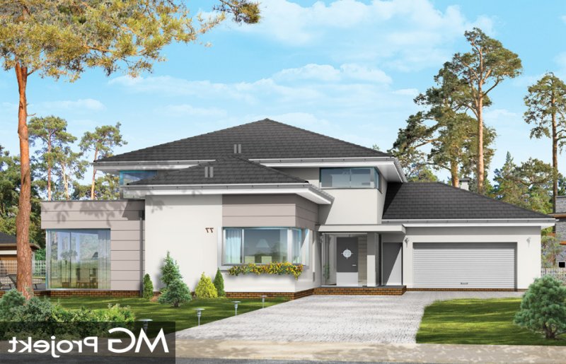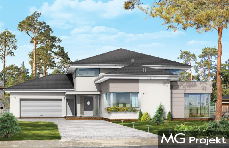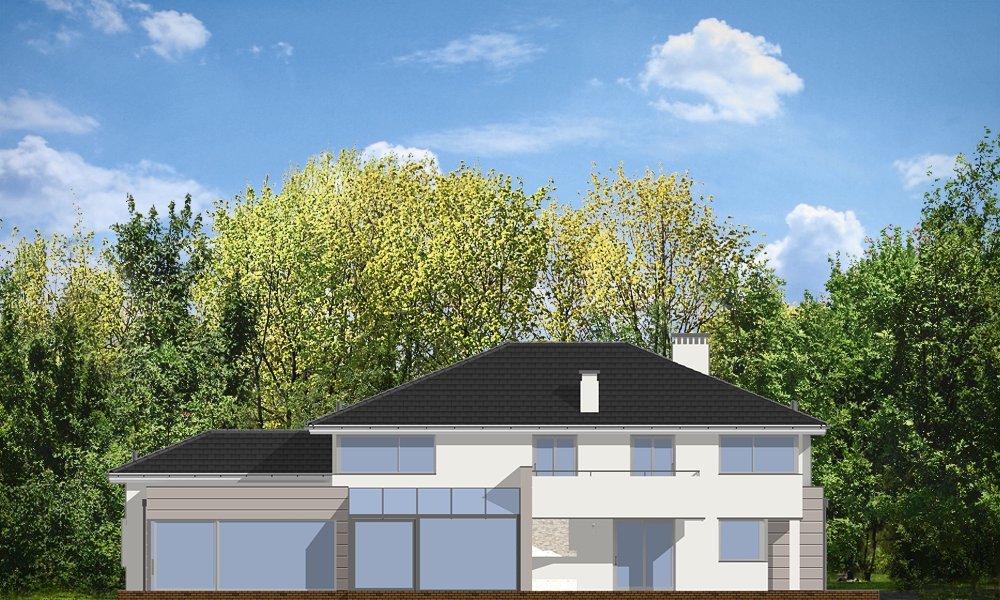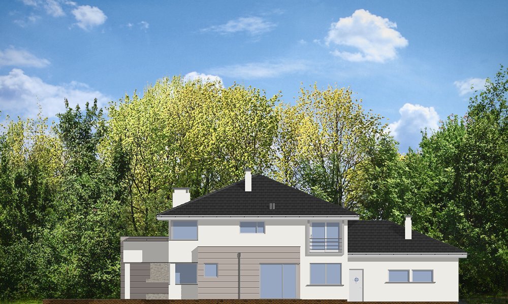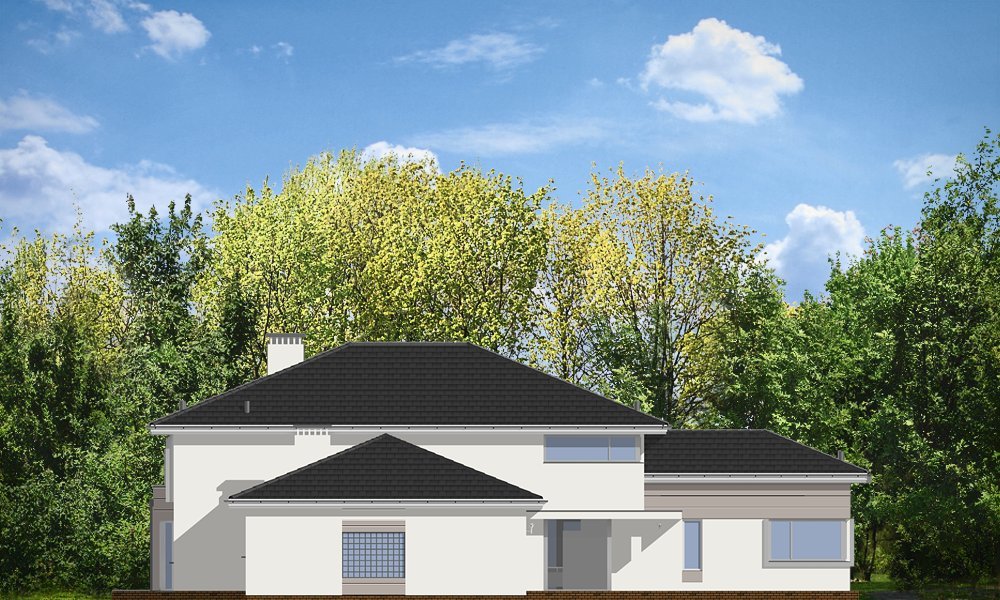 Prestiżowy to jeden z największych i najbardziej komfortowych w ofercie pracowni. Zaplanowany jako nowoczesna, piętrowa willa, o rozczłonkowanej, rozbudowanej bryle. Dom przewidziano dla dużej, 4-7 osobowej rodziny. Zewnętrzna bryła to połączenie piętrowego rdzenia domu, z dobudowanymi parterowymi skrzydłami, oraz oranżerią i zadaszonym tarasem od strony ogrodu. Modernistyczne detale projektu takie jak fragmenty płaskich dachów, tarasy na piętrze, duże przeszklenia, czy narożne okna nadają domowi bardzo elegancki, ponadczasowy charakter. Wnętrze domu zaprojektowano oddzielając jednoprzestrzenną część dzienną na parterze od intymnej części z sypialniami. Na parterze umieszczono duży salon otwarty na ogrodową oranżerię, połączony z pięknie oświetloną jadalnią i holem z reprezentacyjnymi schodami i otwarciem przestrzennym na antresolę na piętrze, a także z pokojem sportowym połączonym z zadaszonym podcieniem z kominkiem zewnętrznym. Z holu i jadalni docieramy do wygodnej kuchni z wyspą i spiżarnią. Z narożnego okna kuchennego obserwować można wejście do budynku. Przedsionek wejściowy jest całkowicie przeszklony - tak, aby wejście do domu miało maksymalnie reprezentacyjny charakter. Na parterze znajduje sie sypialnia państwa domu z garderobami, łazienką i własnym tarasem, oraz dodatkowy pokój gościnny. W osobnej części domu umieszczono pomieszczenia gospodarcze i garaż. Piętro to królestwo dzieci - aż cztery sypialnie, w tym jedna z własną łazienką, oraz gabinet-biblioteka, z pięknym oknem narożnym z widokiem na front działki. Projekt dostępny jest także w wersji odbicia lustrzanego.
