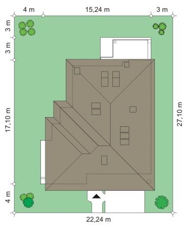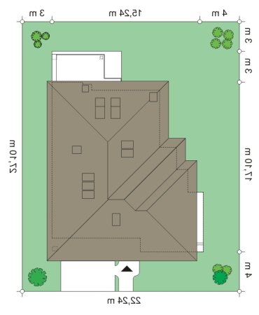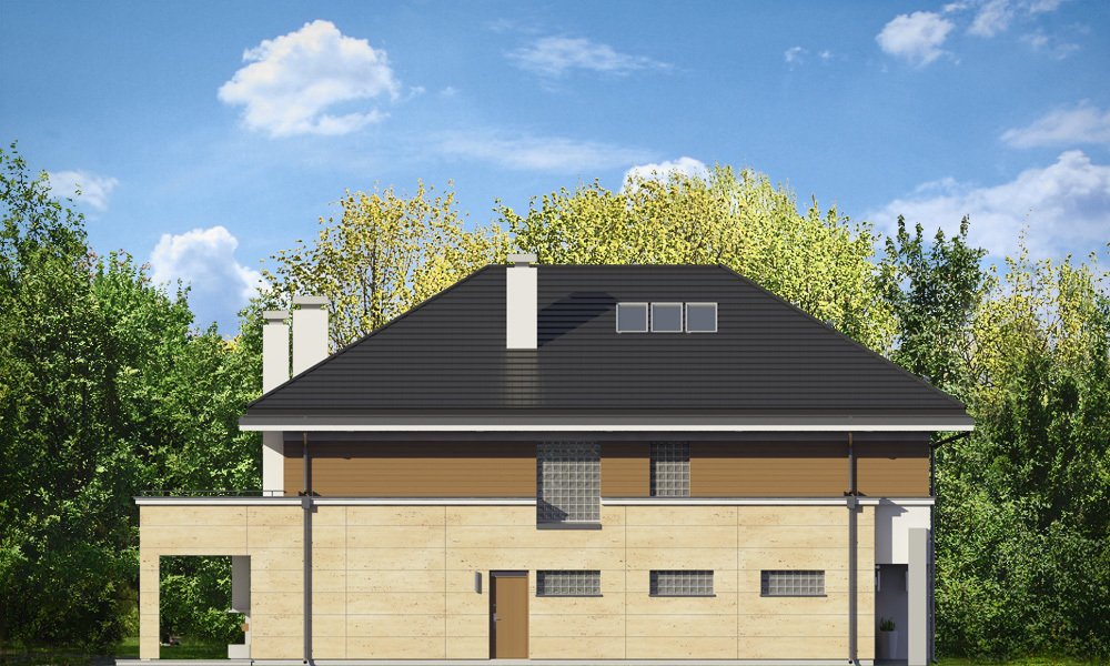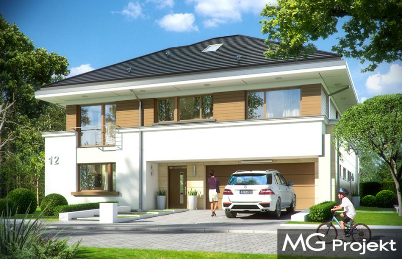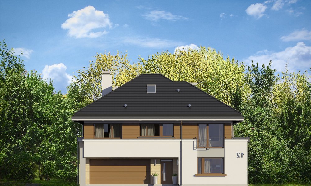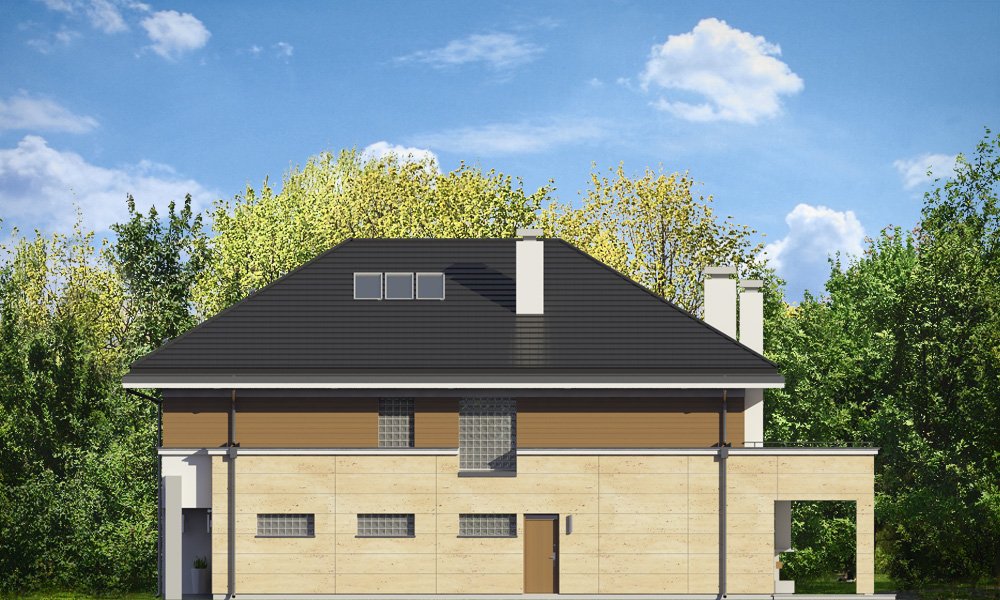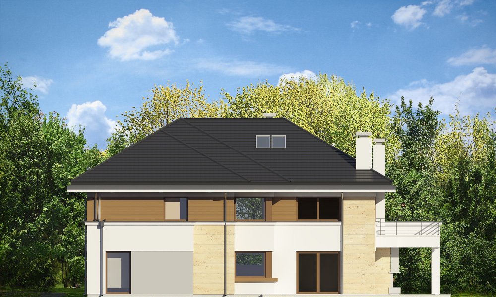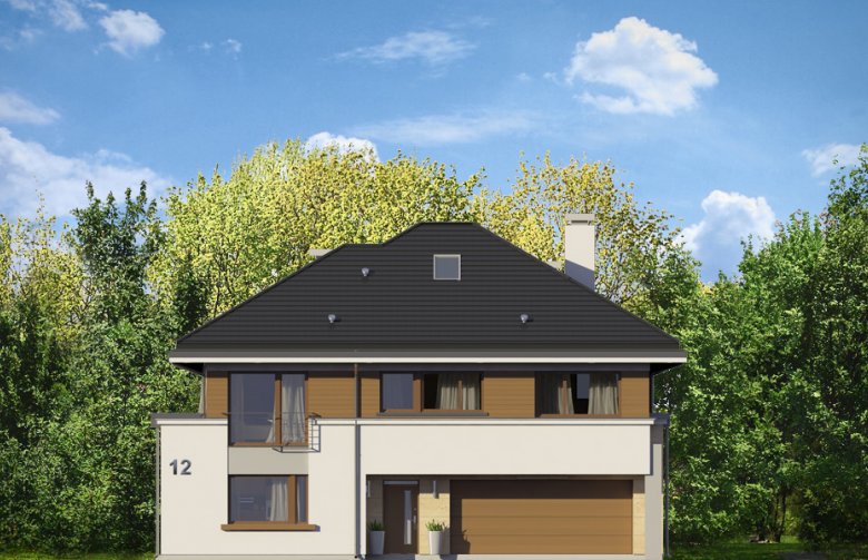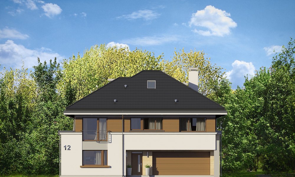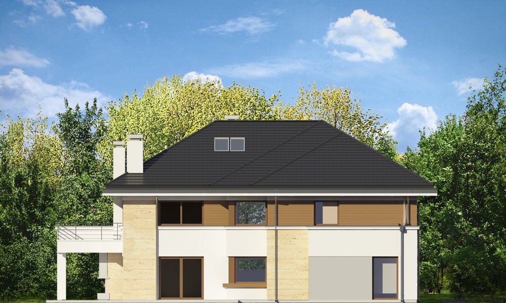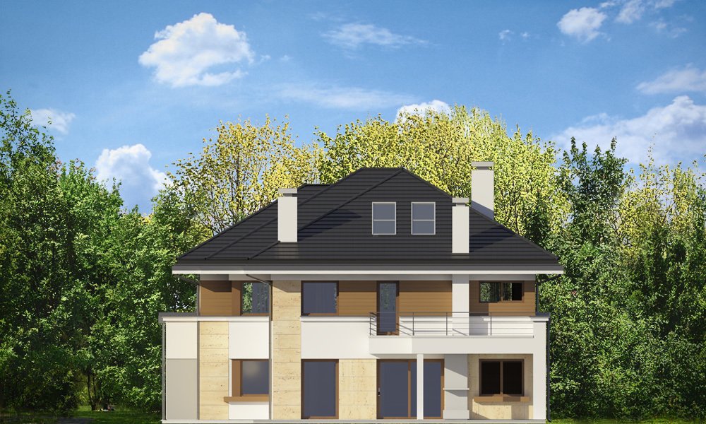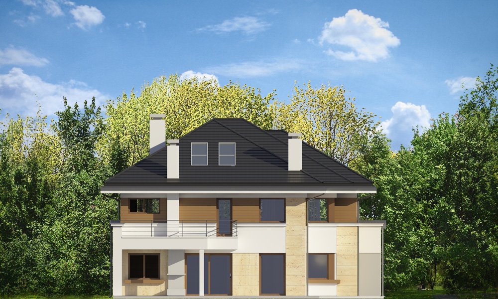 Rezydencja leśna to piętrowy, duży, komfortowy dom, przeznaczony dla rodziny 4-6cioosobowej. Budynek jest nowoczesny, ma zwartą bryłę, oraz funkcjonalne wnętrze. Został zaprojektowany w stylu piętrowej miejskiej willi. Główna bryła przekryta jest czterospadowymi dachami - elewacja frontowa jest szersza i zwęża się w kierunku ogrodu, dzięki czemu dom ma dwa oblicza: masywny reprezentacyjny przód i bardziej rozczłonkowany tył z załamaniami i dobudówkami, utrzymujący ludzką skalę. Elewacje zostały podzielone na poziome pasy - uzyskano w ten sposób lżejszą i ciekawszą sylwetkę budynku. Duże przeszklenia, narożne okna, wcięcia i wystające wykusze ozdabiają dom i nadają mu nowoczesny dynamiczny charakter. Wnętrze domu jest bardzo komfortowe i zawiera wszystko czego właściciele mogliby sobie zamarzyć. Na parterze szerokim przeszklonym wejściem z przedsionka wchodzimy do jednoprzestrzennego salonu połączonego z jadalnią i holem. Pokój dzienny łączy się pięknymi przeszkleniami z tarasem i ogrodem. Częściowo otwarta na jadalnię kuchnia z wyspą i spiżarnią usytuowana jest od frontu - z dużym oknem na wejście do domu. Na parterze znajdują się też : dwustanowiskowy garaż, kotłownia, oraz gabinet. Taras od strony ogrodu przykryty jest częściowo zadaszeniem. Piętro zawiera cztery duże sypialnie, w tym wygodny apartament rodziców, z własną łazienką, garderobą i tarasem ogrodowym. Dodatkowo są tutaj dwie łazienki i pomieszczenie pralni. Na samej górze domu zlokalizowany jest strych, który można wykorzystać na poddasze użytkowe i zrobić tam np. pomieszczenie rekreacyjne. Dom zaprojektowano z wykorzystaniem energooszczędnym materiałów i technologii, dzięki czemu, mimo niemałej powierzchni, jego koszty utrzymania nie będą duże.
