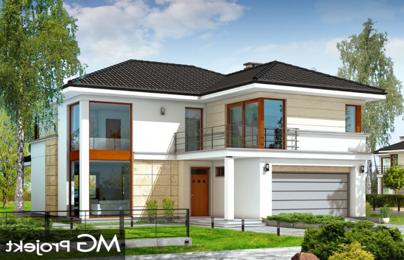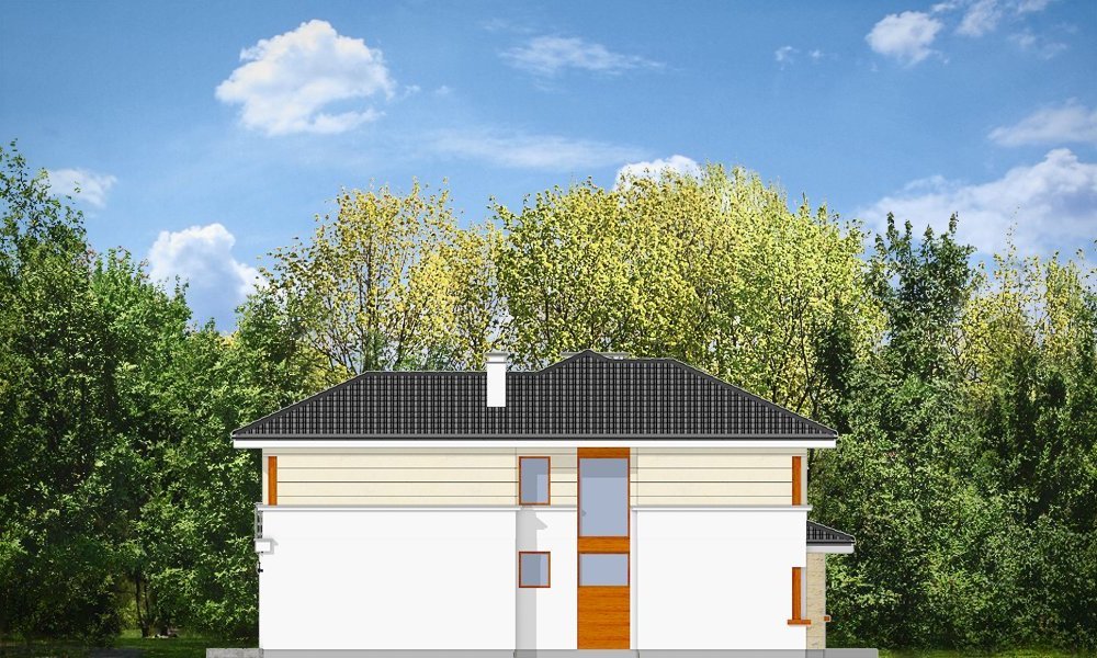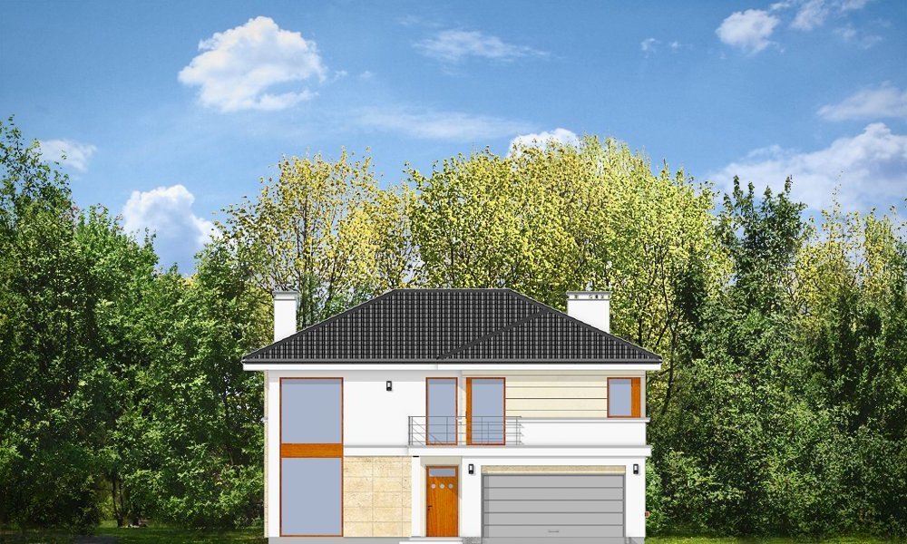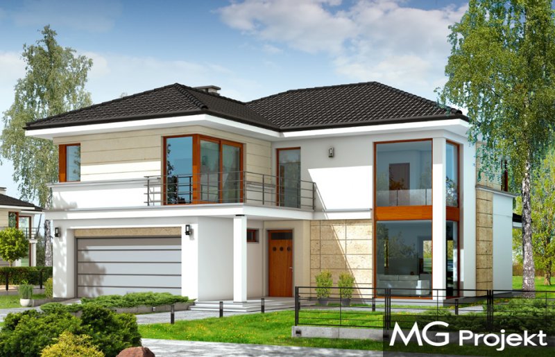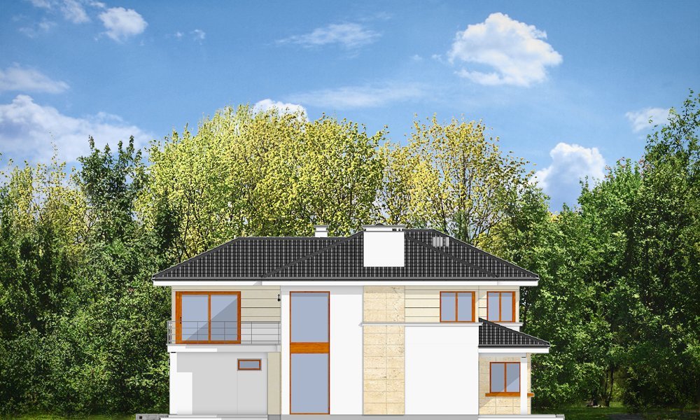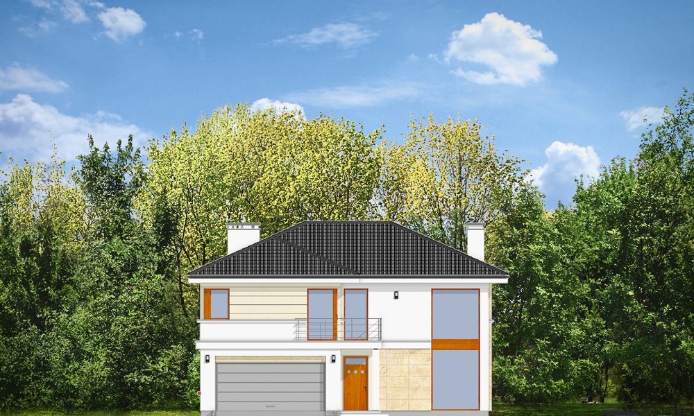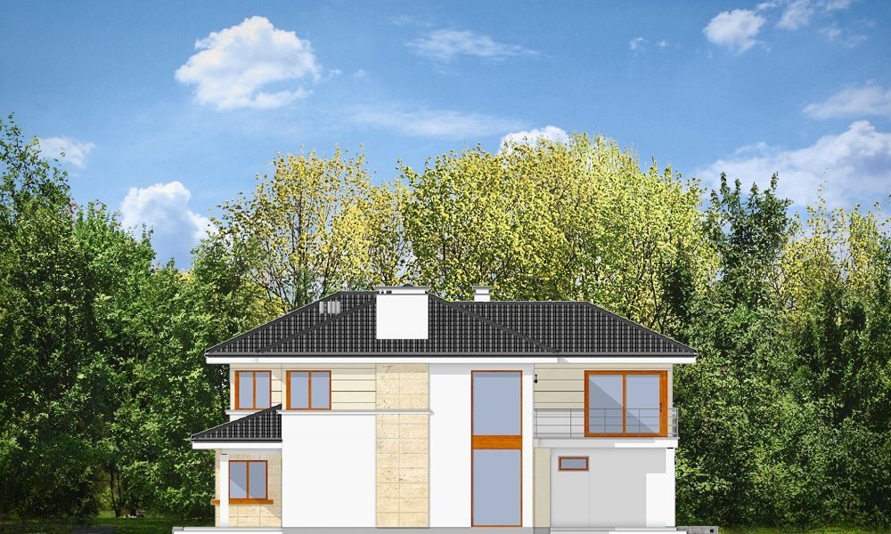 Riwiera to oryginalny, piętrowy dom przeznaczony dla cztero-sześcioosobowej rodziny. Budynek zaprojektowano jako jednopiętrową bryłę w kształcie litery T, przekrytą łagodnym wielospadowym dachem. Dom swoim stylem stara się nawiązać do charakteru miejskich willi, łącząc w sobie elementy modernistycznej architektury ze współczesnymi detalami i materiałami. W wyniku takiego połączenia udało uzyskano elegancką, dopracowaną formę. Budynek został zaprojektowany w taki sposób, aby mógł być zlokalizowany także na niekorzystnej względem stron świata działce. Nawet przy wjeździe od strony południowej w salonie będzie dużo światła - dzięki dużym przeszkleniom - również na front domu. Od strony ogrodowej zaprojektowano przytulny taras przykryty częściowo zadaszeniem podcienia. Wewnątrz, projekt podzielono pod względem funkcjonalnym na strefy. Na parterze większość miejsca zajmuje przestrzeń dzienna, z pięknym dwukondygnacyjnym salonem - z antresolą na piętrze, z jadalnią, holem z reprezentacyjnymi schodami i częściowo otwartą kuchnią. Dodatkowo na parterze przewidziano pokój - gabinet lub zapasową sypialnię, oraz garaż. Schodami schodzimy do piwnicy, gdzie znajdują się pomieszczenia techniczne. Na piętrze zaprojektowano trzy sypialnie z garderobami, dwie łazienki (w tym jedna należąca do odizolowanego apartamentu rodziców z tarasem), oraz pralnię. Duży hol - antresola stanowi naturalne przedłużenie salonu. Pracownia posiada wersję odbicia lustrzanego projektu.