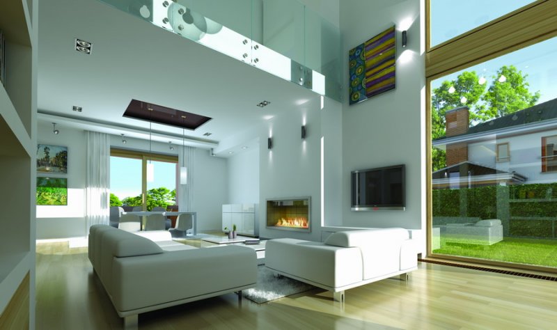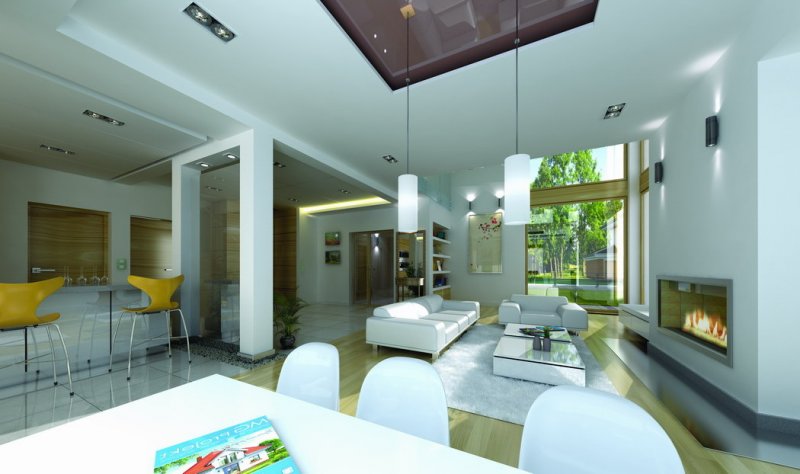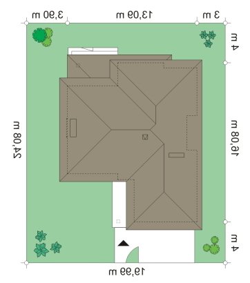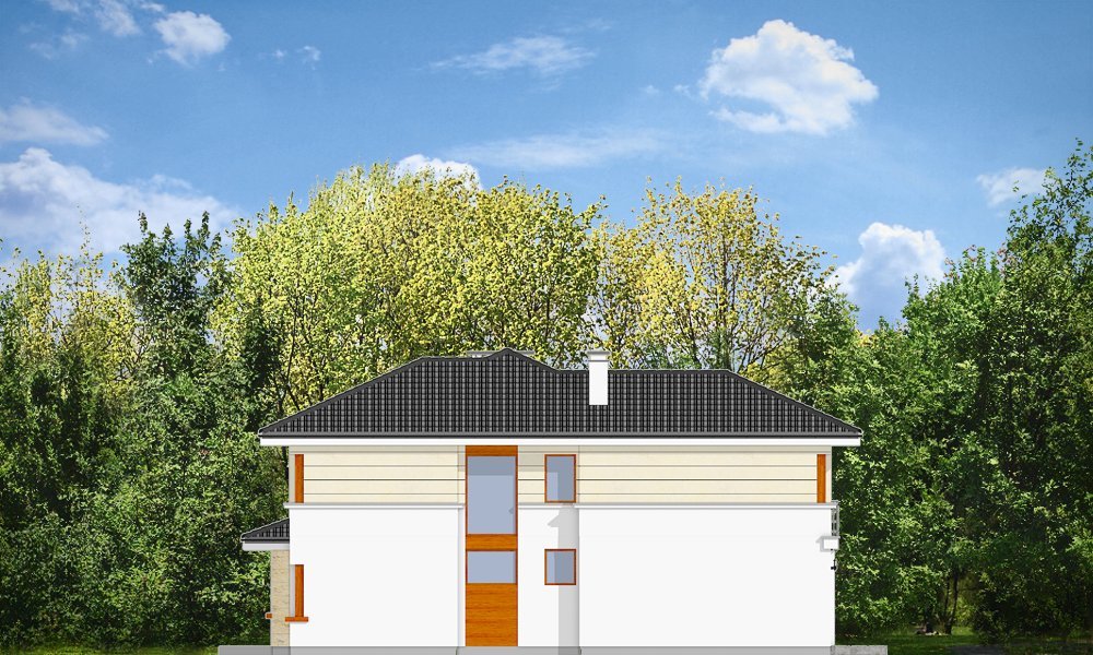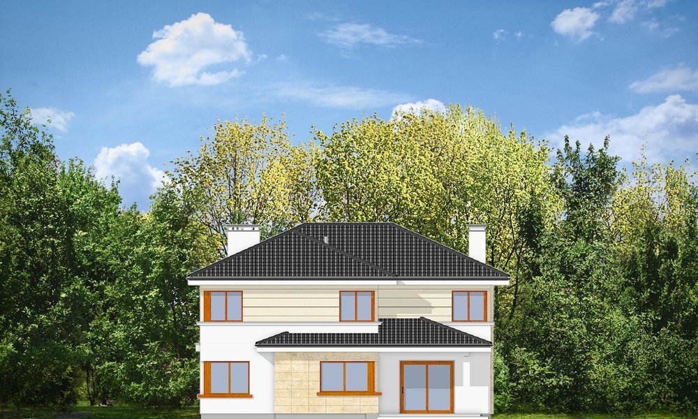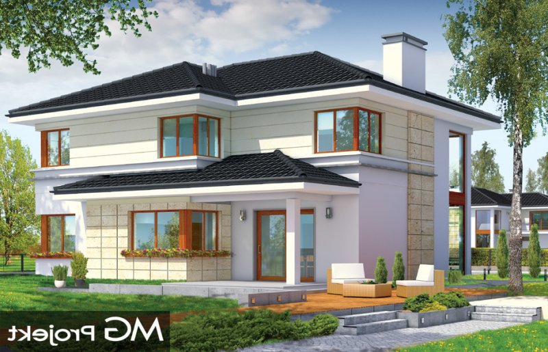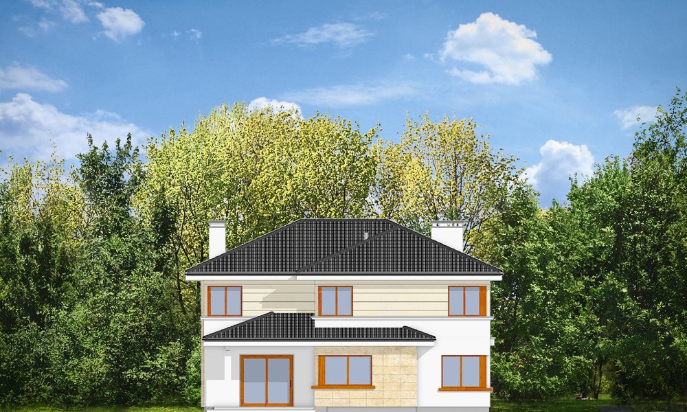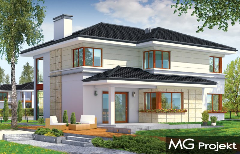 Riwiera to oryginalny, piętrowy dom przeznaczony dla cztero-sześcioosobowej rodziny. Budynek zaprojektowano jako jednopiętrową bryłę w kształcie litery T, przekrytą łagodnym wielospadowym dachem. Dom swoim stylem stara się nawiązać do charakteru miejskich willi, łącząc w sobie elementy modernistycznej architektury ze współczesnymi detalami i materiałami. W wyniku takiego połączenia udało uzyskano elegancką, dopracowaną formę. Budynek został zaprojektowany w taki sposób, aby mógł być zlokalizowany także na niekorzystnej względem stron świata działce. Nawet przy wjeździe od strony południowej w salonie będzie dużo światła - dzięki dużym przeszkleniom - również na front domu. Od strony ogrodowej zaprojektowano przytulny taras przykryty częściowo zadaszeniem podcienia. Wewnątrz, projekt podzielono pod względem funkcjonalnym na strefy. Na parterze większość miejsca zajmuje przestrzeń dzienna, z pięknym dwukondygnacyjnym salonem - z antresolą na piętrze, z jadalnią, holem z reprezentacyjnymi schodami i częściowo otwartą kuchnią. Dodatkowo na parterze przewidziano pokój - gabinet lub zapasową sypialnię, oraz garaż. Schodami schodzimy do piwnicy, gdzie znajdują się pomieszczenia techniczne. Na piętrze zaprojektowano trzy sypialnie z garderobami, dwie łazienki (w tym jedna należąca do odizolowanego apartamentu rodziców z tarasem), oraz pralnię. Duży hol - antresola stanowi naturalne przedłużenie salonu. Pracownia posiada wersję odbicia lustrzanego projektu.