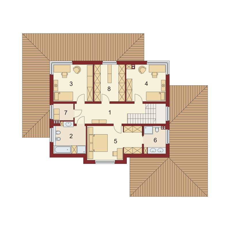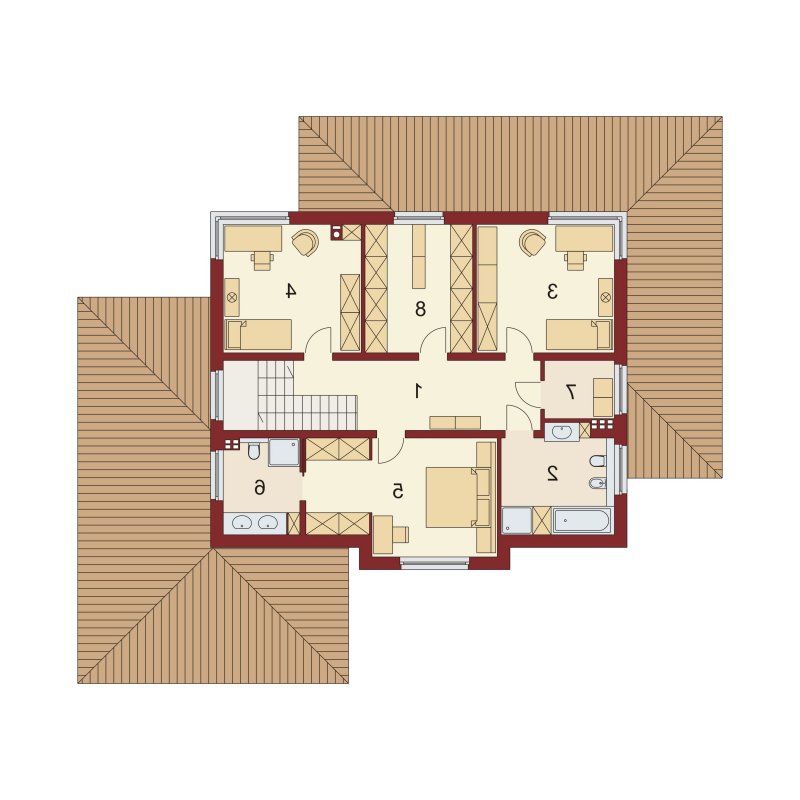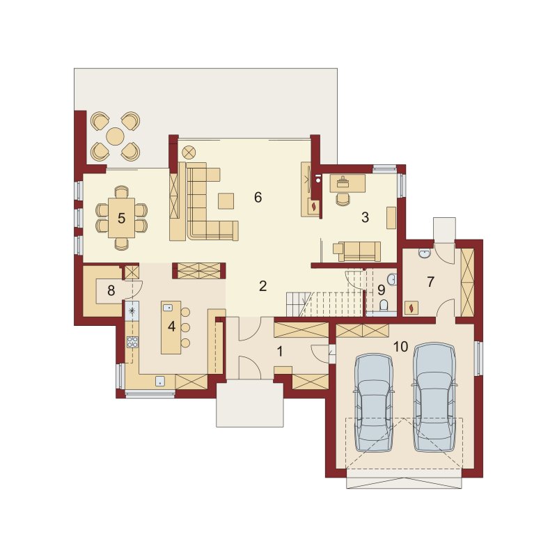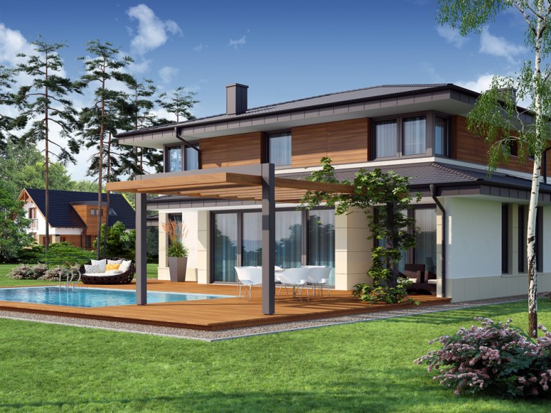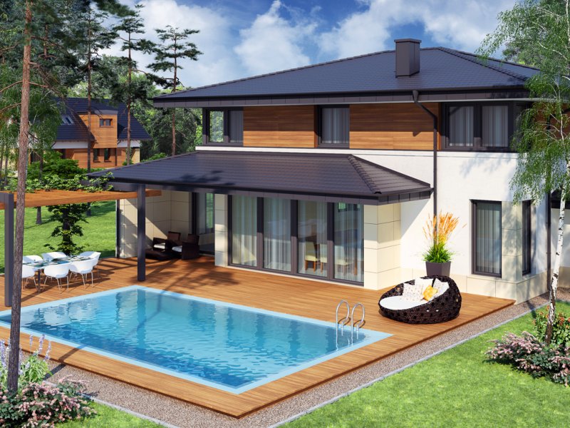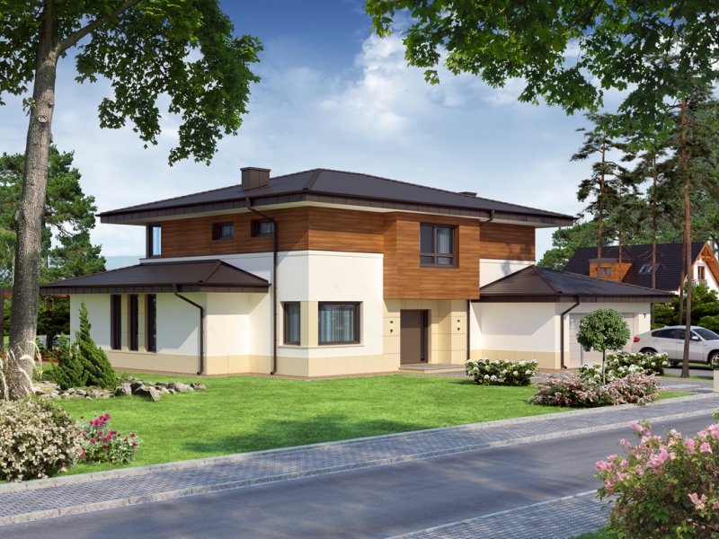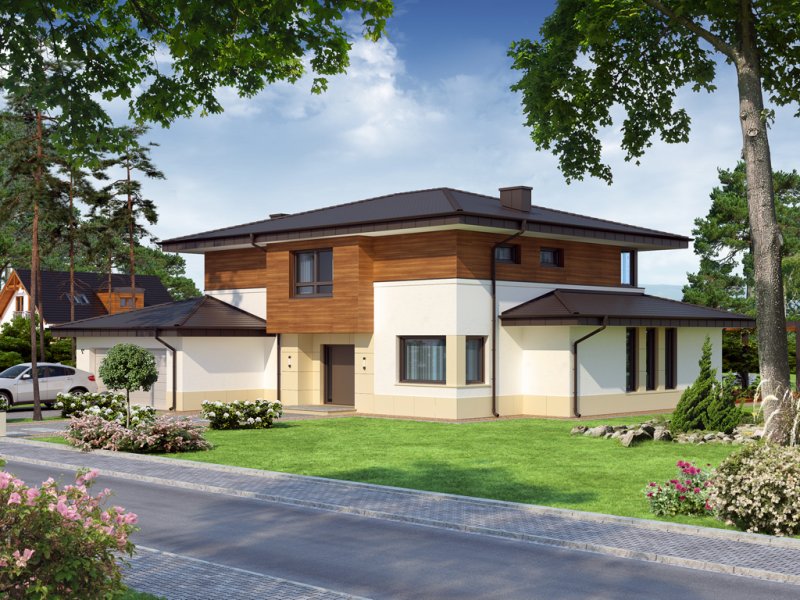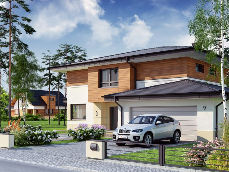 Wizualizacja jest propozycją tego jak dany projekt domu oraz jego otoczenie można zaaranżować. Sposób prowadzenia tarasu, kształt murków i elementy małej architektury typu pergole, donice itp. nie są objęte zakresem projektu. W związku z powyższym na projekcie budowlanym elementy te mogą nie być uwzględnione w projekcie ( patrz pergole ) lub zmieniony może być ich kształt i sposób prowadzenia ( wielkości tarasów, profil murków ).