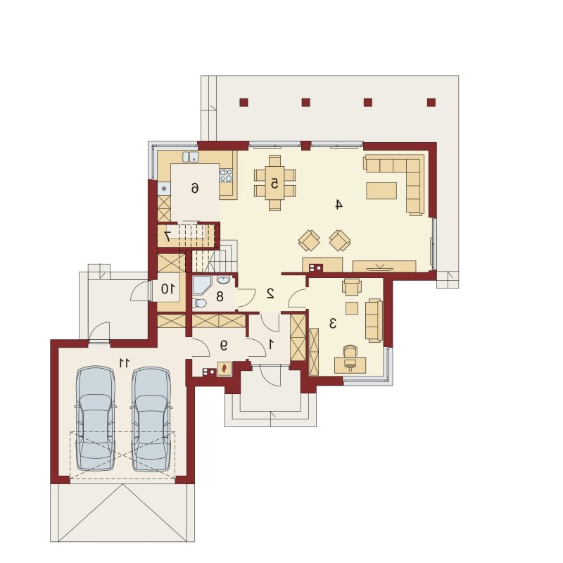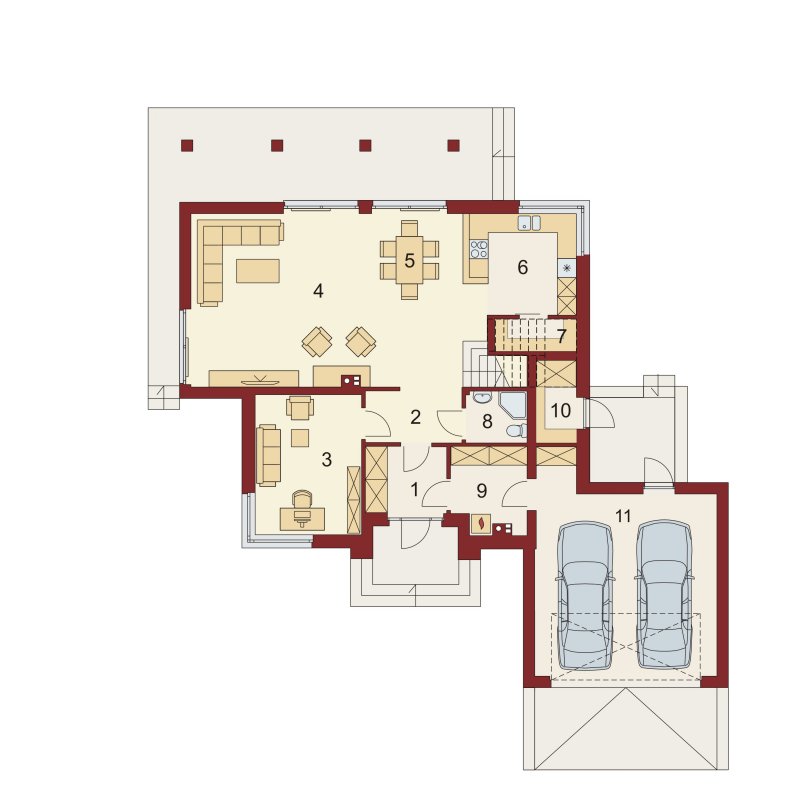 Sercem Simy jest przestronny i dobrze doświetlony salon, z którego wyjść można na zadaszony taras z dużym podcieniem. Salon płynnie przechodzi w wygodną jadalnię oraz połączoną ze spiżarnią ustawną kuchnię. Tę ostatnią, w ramach aranżacji można zamknąć ściankami działowymi. Dodatkowo na parterze znajdują się: wygodny pokój który można zaaranżować na sypialnię dla gości bądź gabinet, ogólnodostępna łazienka, ustawny wiatrołap z szafami wnękowymi, dwustanowiskowy garaż oraz dwa pomieszczenia gospodarcze z których jedno pełni funkcję kotłowni, a drugie schowka dostępnego z przestrzeni ogrodu.
