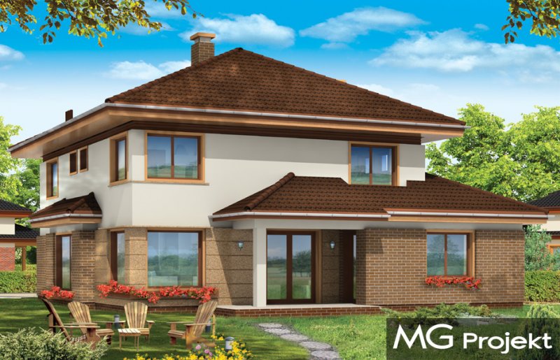 Sonet to elegancka, piętrowa willa, o prostokątnej bryle, z wciętym z boku garażem przekrytym daszkiem. Podział elewacji na poziome pasy obniża wizualnie budynek, przez co wydaje się bliższy ludzkiej skali. Podcienie - wejściowy i ogrodowy, wykusz jadalni, okrągłe okno w elewacji frontowej - urozmaicają sylwetkę domu. Wnętrze domu zaprojektowano w taki sposób, aby podzielić willę na przestrzeń dzienną na parterze i nocną na piętrze. Na parterze zaplanowano też dodatkowy pokój z łazienką, garaż i kotłownię. Domek mimo niedużej wielkości jest bardzo pojemny i funkcjonalny, ma wiele pokoi i pomieszczeń pomocniczych. Pracownia dysponuje również projektem w odbiciu lustrzanym.