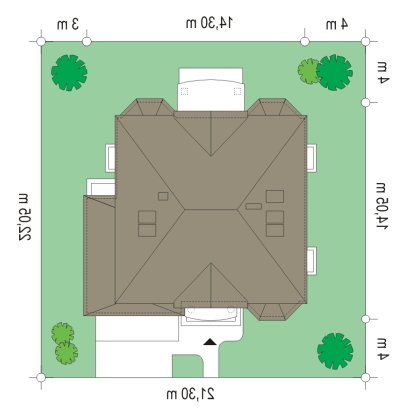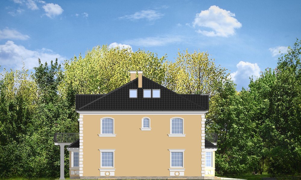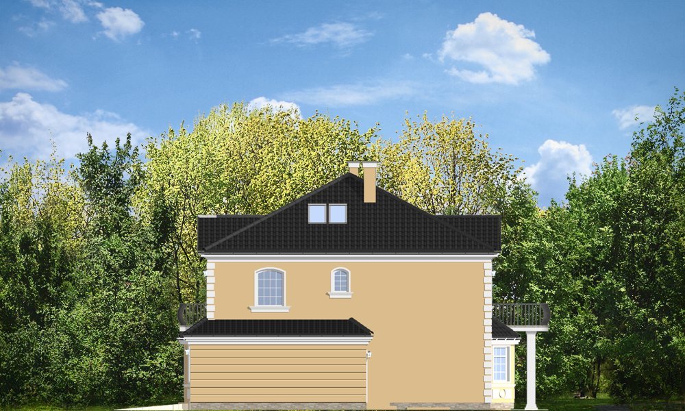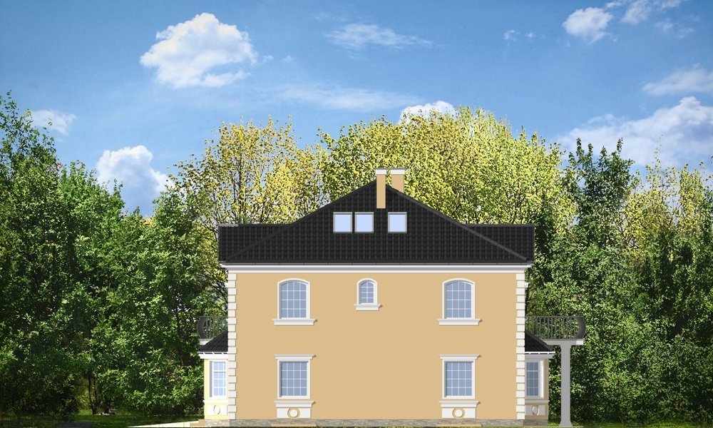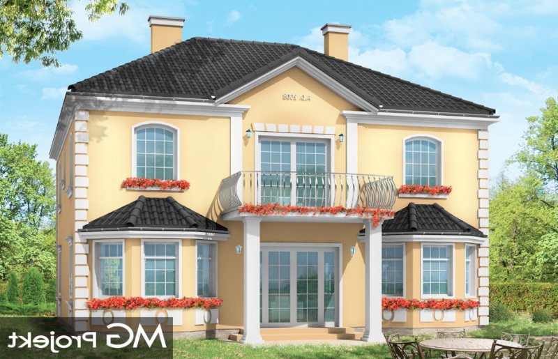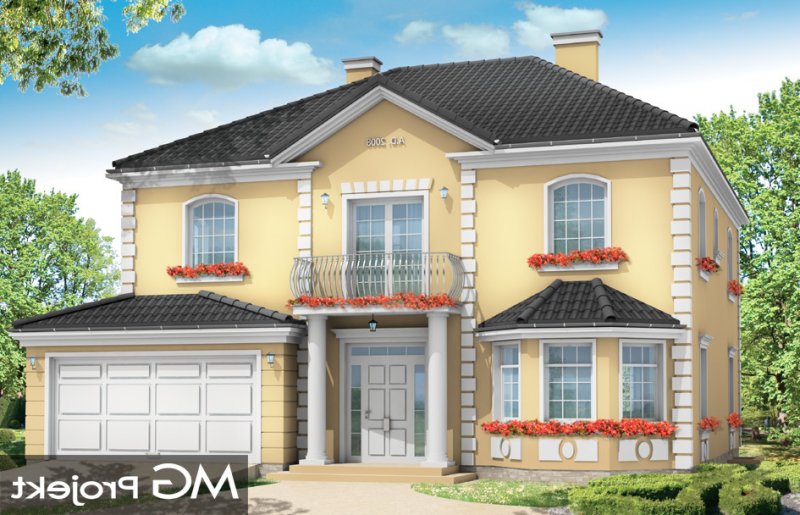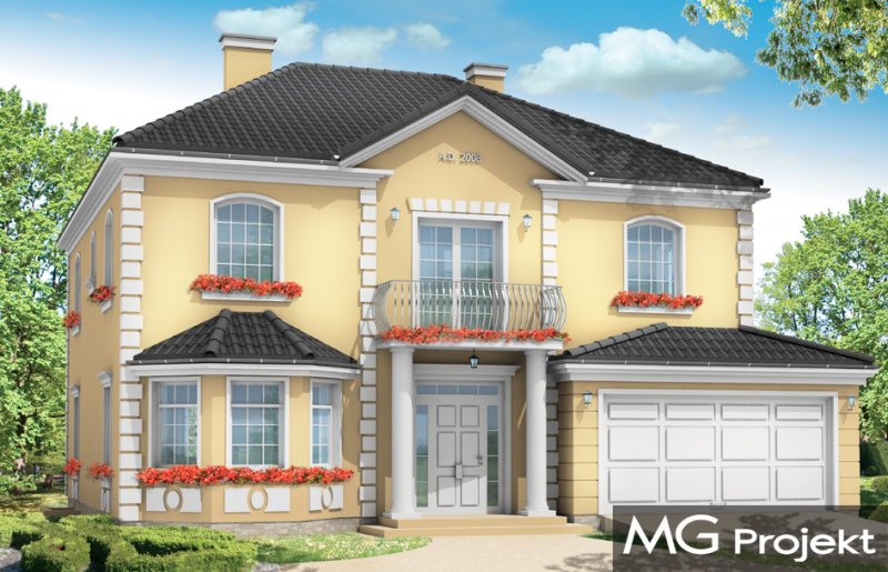 Stylowy to uroczy domek jednorodzinny, z serii naszych piętrowych budynków. Tym razem o trochę mniejszej powierzchni - jeśli nie liczyć piwnicy. Projekt przeznaczony jest dla rodziny 4-6cio osobowej. Dom zaprojektowano na planie zbliżonym do kwadratu, z wkomponowanym w bryłę główną garażem. Wykusze, balkony na kolumnach (wejściowy i ogrodowy), frontony, czy łukowo zakańczane piękne okna z podziałami. To wszystko daje domowi piękny klasyczny wygląd zewnętrzny. Wewnątrz mieszkanie również zostało tradycyjnie podzielone, z zachowaniem symetrii i osi widokowych. Z centralnego holu z zabiegowymi schodami przechodzimy do dużego salonu, lub w bok do prawdziwie wielkiej kuchni - z wyspą i kącikiem jadalnym. Z salonu z kolei możemy przejść do gabinetu-biblioteki (biblioteka może być też po prostu połączona z salonem). Ciekawym rozwiązaniem w projekcie, jest możliwość dostępu do schodów piwnicznych zarówno z części gospodarczej - od garażu, jak i od strony wypoczynkowej (część piwnicy jest przeznaczona na rekreację). Na piętrze zaprojektowano apartament rodziców - z łazienką, garderobą, tarasem ogrodowym i dodatkowym pokojem (np. fitness), oraz dwie sypialnie dzieci z łazienkami. Dodatkowy pokój można przeznaczyć na dodatkową sypialnię zapewniając mu wejście z holu. Swoje miejsce znalazł także nieduży pokój do pracy - gabinet (połączony z holem przeszklonymi ścianami i posiadający wyjście na frontowy balkon). W piwnicy zaprojektowano pomieszczenia techniczne, oraz rekreacyjne. Dom posiada duży strych, który również można zaadaptować. Projekt dostępny jest też w wersji lustrzanej.