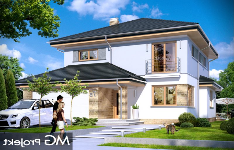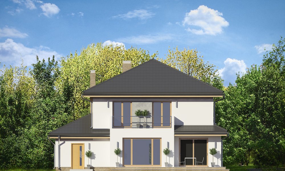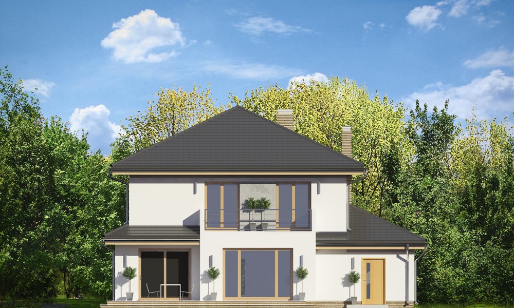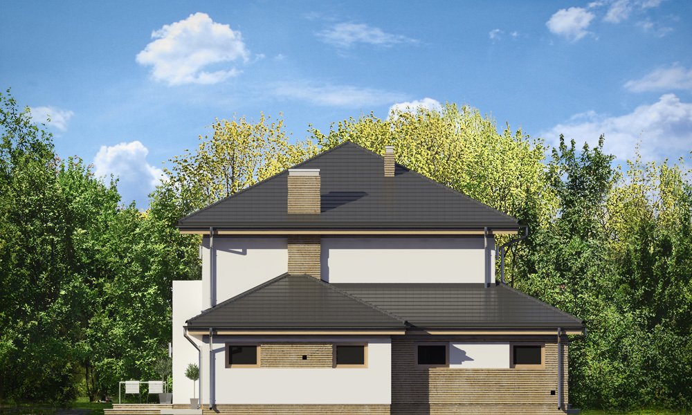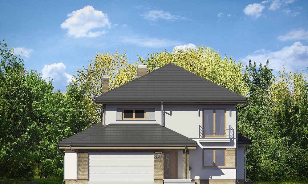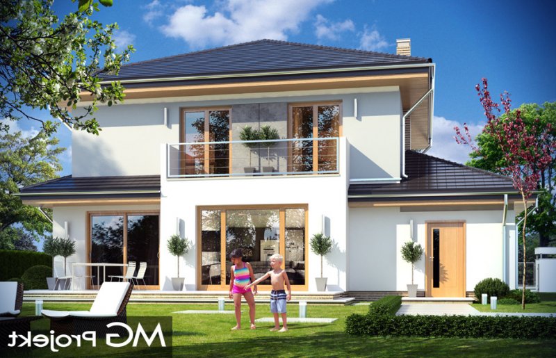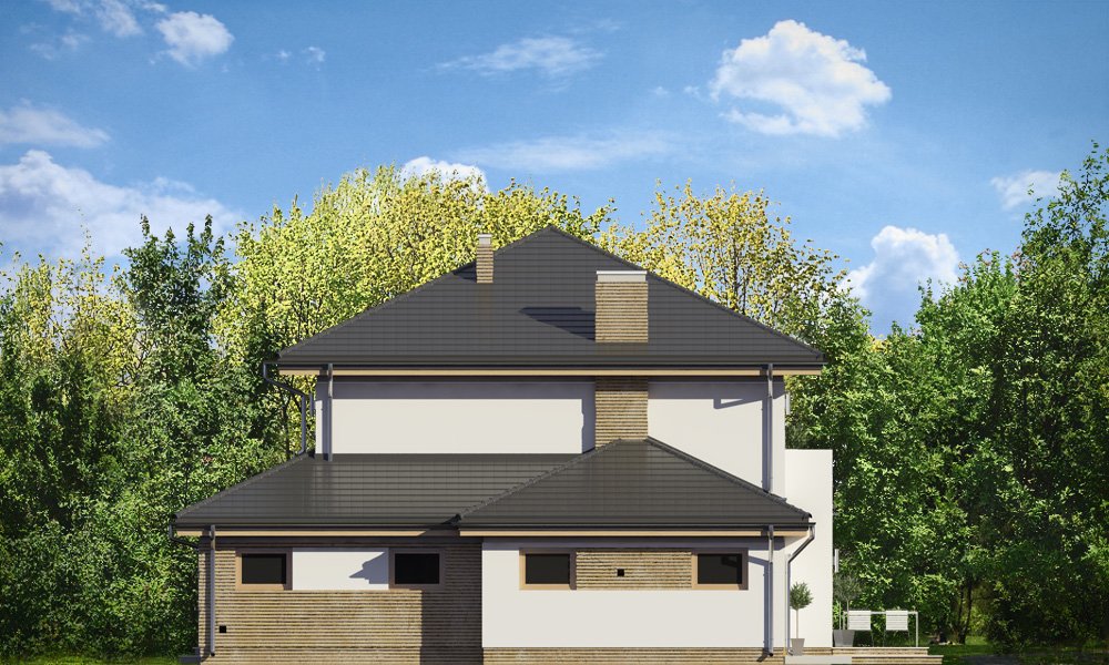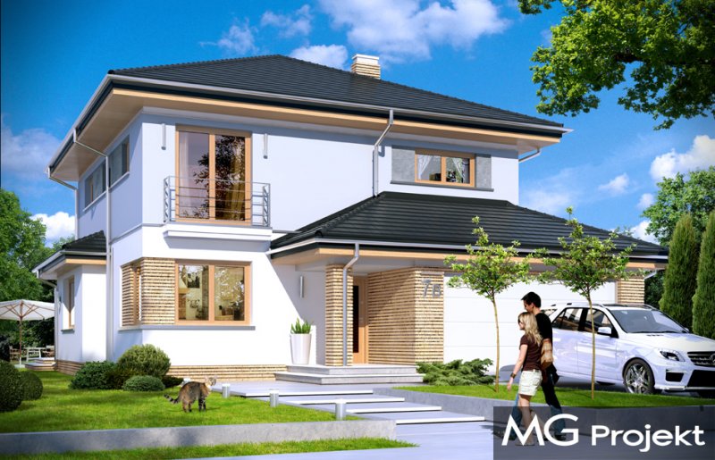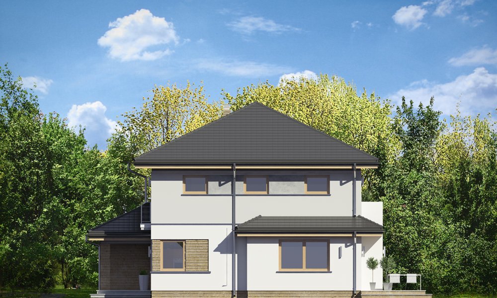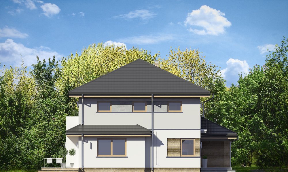 Szmaragd 4 jest wariantową wersją popularnego projektu typu Szmaragd. Dom jest zaprojektowany dla rodziny 4-5cioosobowej. Jest to piętrowy budynek, zbudowany na planie kwadratu przekrytego kopertowym dachem, z wbudowanym w bryłę garażem, z parterowymi dobudówkami i wykuszami. Niewielka powierzchnia domu została zamknięta w atrakcyjnej nowoczesnej bryle, z ładnymi przeszkleniami i urozmaiconymi elewacjami. Wnętrze domu podzielono na część dzienną i gospodarczą na parterze, oraz sypialnie na piętrze. Na dole zaprojektowaliśmy obszerny pokój dzienny, lekko odgrodzony od jadalni i kuchni, oraz holu. Schody na piętro są ozdobą salonu i holu. Całość tworzy jednoprzestrzenne duże wnętrze, otwarte szerokimi przeszkleniami na ogród i taras. Dwustanowiskowy garaż dostępny z przedsionka ma dodatkowo dwa pomieszczenia gospodarcze – w tym kotłownię. Na piętrze przewidziano trzy sypialnie ( rodziców – z garderobą i dziecinne – z szafami wbudowanymi ), dużą rodzinną łazienkę, oraz dodatkowe pomieszczenie - pokój lub garderobę. Nad piętrem znajduje się strych – magazyn. Dom został zaprojektowany z uwzględnieniem rozwiązań energooszczędnych. Późniejsza eksploatacja Szmaragda 4 nie powinna być kosztowna. Budowa samego domu również nie powinna przysporzyć wielu problemów – dom jest dość prosty, ma nieskomplikowaną konstrukcję, zwartą bryłę. Szmaragd 4 do projekt w sam raz dla osób, które cenią sobie dobrą architekturę i ładny efekt, ale jednocześnie nie chcą wydać na swój przyszły dom fortuny. Zapraszamy.