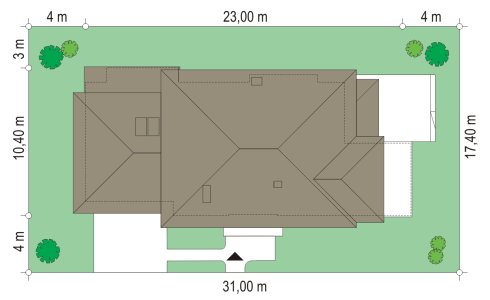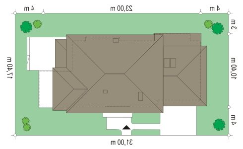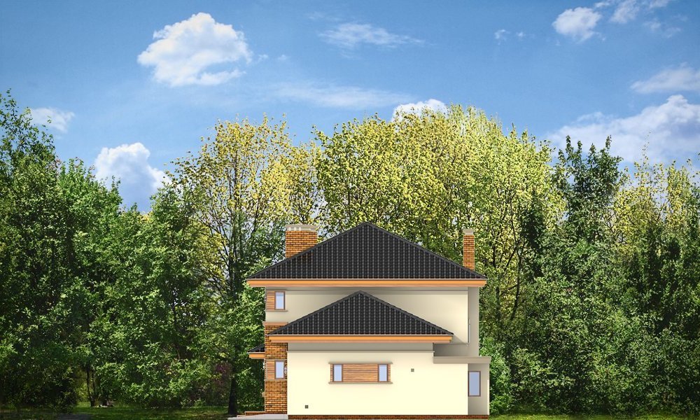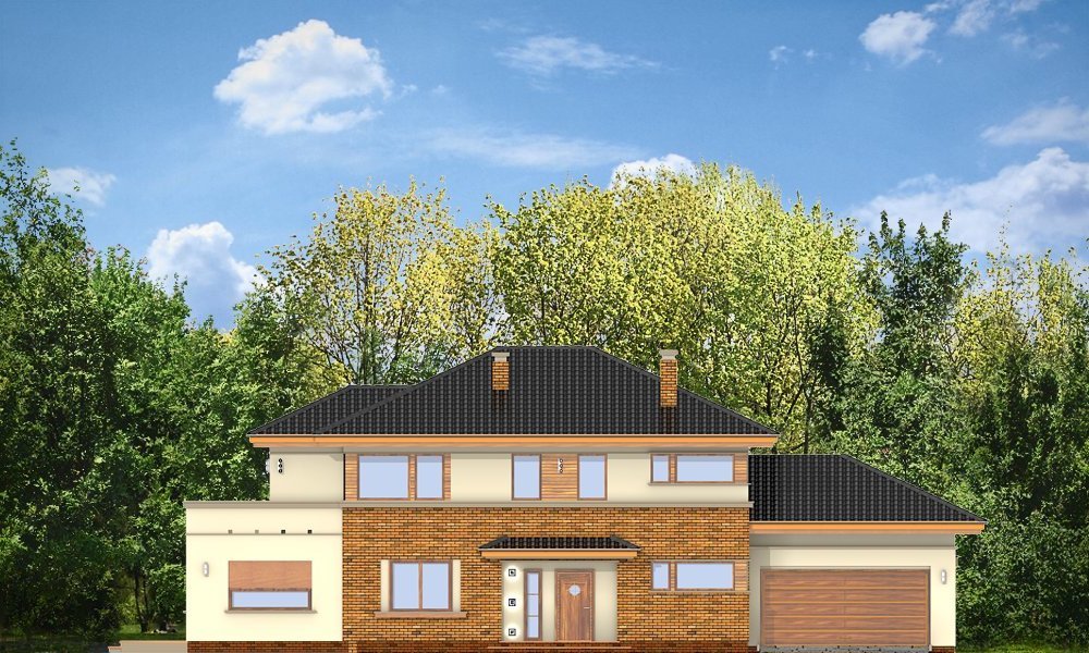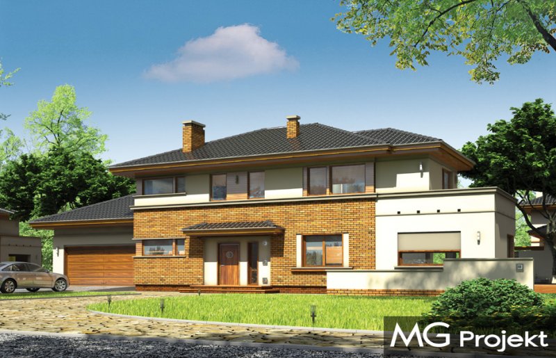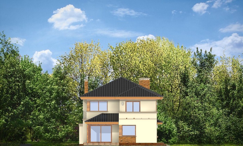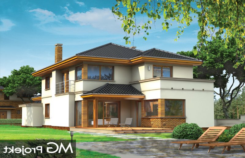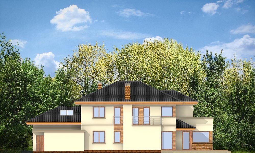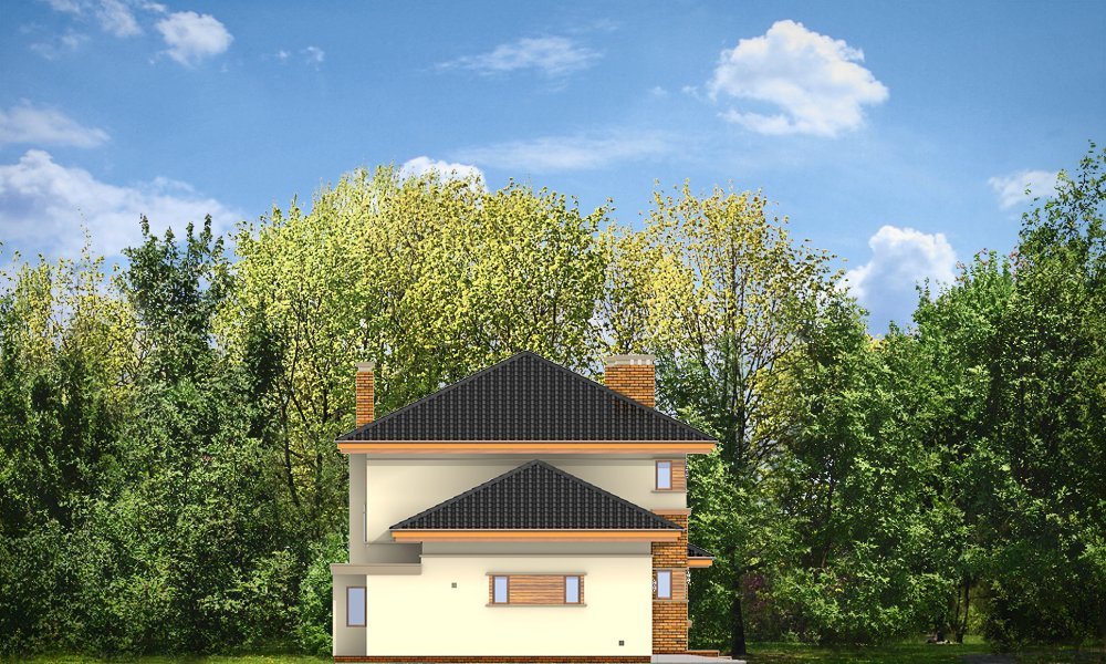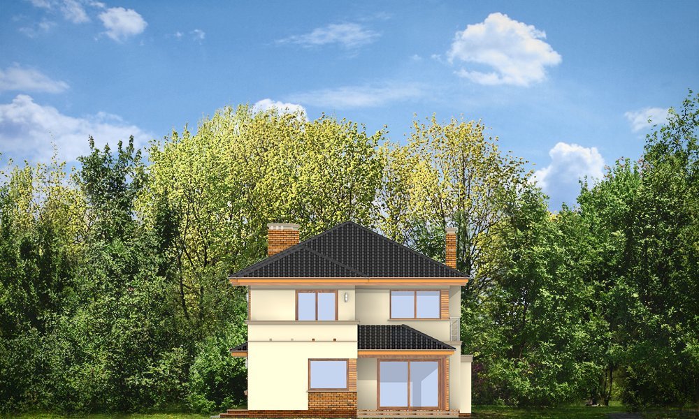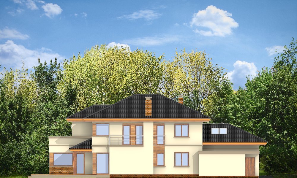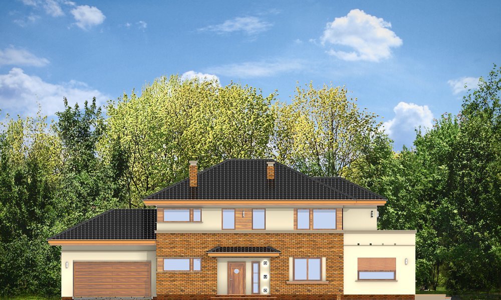 Verona to domek odpowiedni dla rodziny cztero-pięcioosobowej. Piętrowy dom jest przykryty czterospadowym dachem. Budynek został zaprojektowany tak, aby mógł się zmieścić na płytkiej działce, o niewielkiej głębokości od ogrodzenia frontowego przy drodze do tylniej granicy działki. Szczególnie dedykowany dla działek, które ze względu na swoją głębokość mają ogród z boku domu. Nowoczesna forma architektoniczna domu Verona, nawiązuje do projektów F.L.Wrighta. Piętrową elewację frontową domu podzielono poziomymi pasami z dolną częścią klinkierową. Dzięki czemu budynek wydaje się niższy i bardziej wrośnięty w otoczenie. Dodatkowe bryły garażu i kuchni z płaskim dachem urozmaicają kompozycję. Od strony ogrodu zaprojektowano narożne patio z częściowo zadaszonym tarasem, na który wychodzi się szerokimi przejściami z salonu i kuchni. Wnętrze podzielono na jednoprzestrzenną część dzienną na parterze, z efektownymi schodami czy ścianą kominkowo-telewizyjną w salonie, oraz część nocną piętra z osobnym apartamentem rodziców. W projekcie na poddaszu nad garażem znajduje się duży strych do dowolnego wykorzystania. Na parterze obok salonu zaprojektowano dodatkowy pokój - gabinet lub sypialnię gościnną. Pracownia posiada wersję projektu w odbiciu lustrzanym.