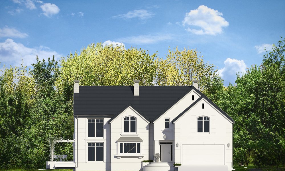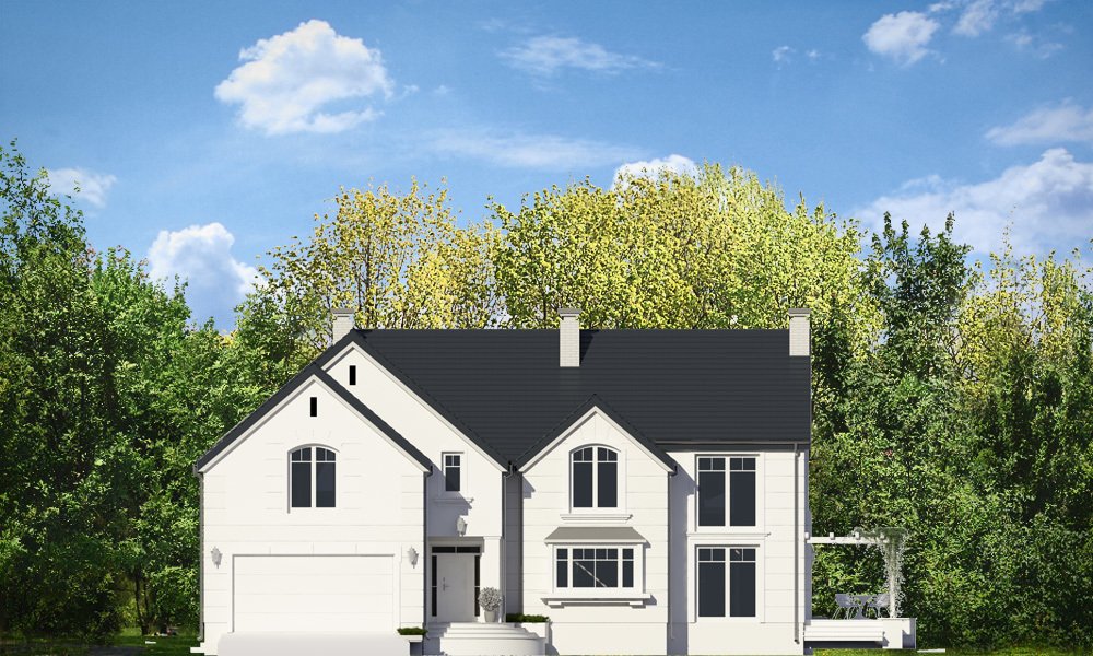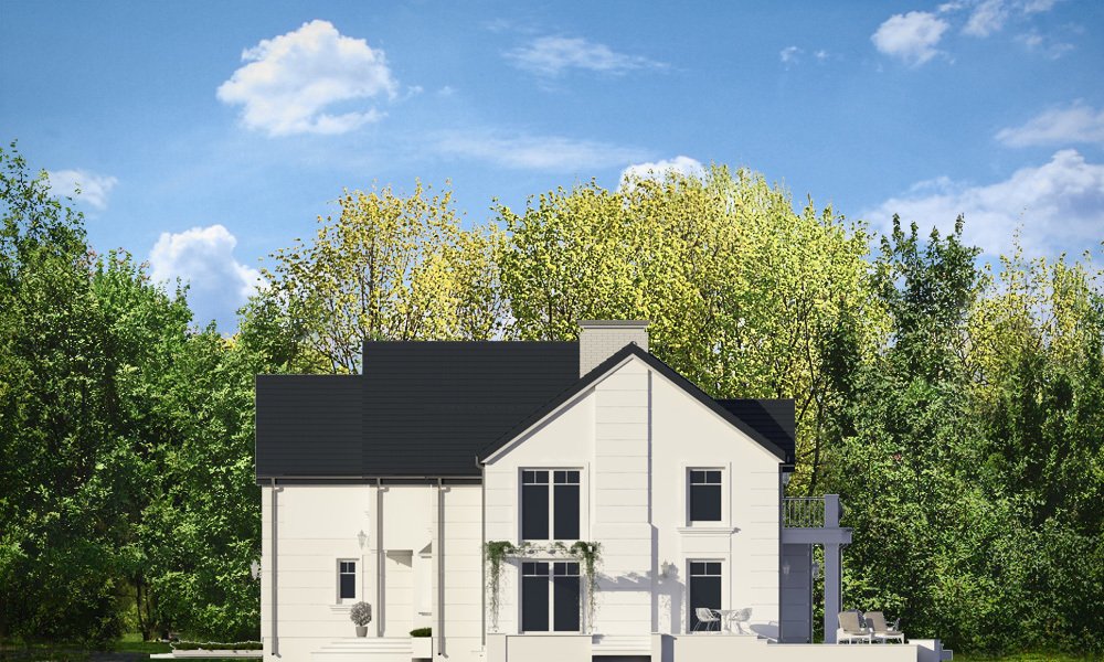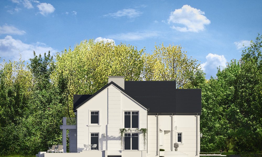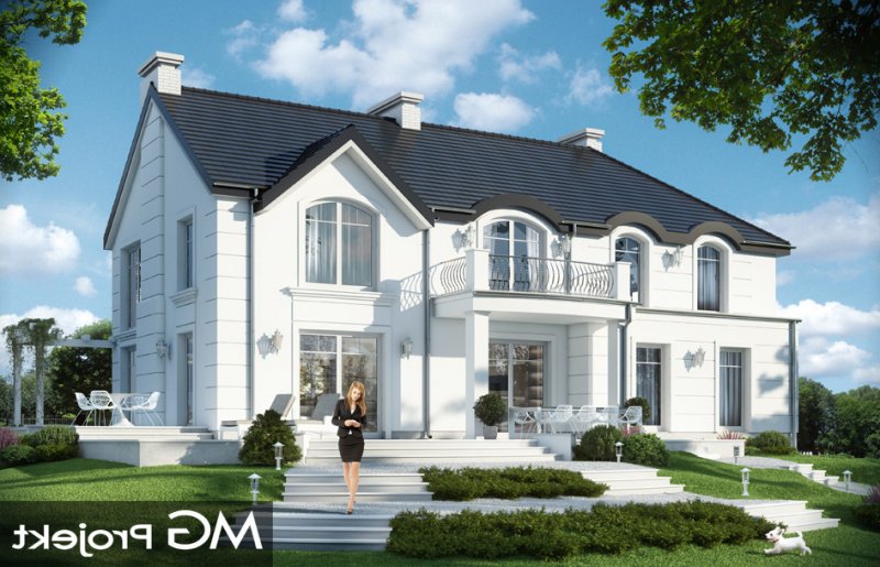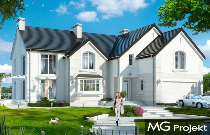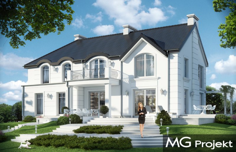 Prezentujemy luksusową rezydencję przeznaczoną dla 4-6cioosobowej rodziny, utrzymaną w stylu okazałych podmiejskich wilii okresu międzywojennego. Historyzujące detale łączą się tutaj z nowoczesnymi rozwiązaniami technicznymi i ze współcześnie ukształtowanym wnętrzem. Wygląd zewnętrzny domu tworzą wzajemnie przenikające się bryły przekryte dwuspadowymi symetrycznymi dachami. Podcienie, zadaszone tarasy, wykuszowe okna – urozmaicają elewacje i dodają uroku. Cała bryła domu, choć duża - jest proporcjonalna i dostosowana do ludzkiej skali. Dom jest reprezentacyjny i okazały, ale zarazem powściągliwy w swej okazałości. Dużą zaletą projektu - prócz ciekawej nietuzinkowej bryły, jest otwartość wnętrza na otaczający ogród. Dzięki dużej ilości okien schodzących do podłogi wnętrze dzienne na parterze i sypialnie na piętrze łączą się z przyrodą na zewnątrz domu. Wnętrze rezydencji skąpane jest w słońcu. Parter budynku to połączona przestrzeń salonu, jadalni, kuchni i holu - razem tworzących jedną wspólną powierzchnię. Jest ona urozmaicona otwarciem przestrzennym nad jadalnią, czy obniżeniem podłogi salonu. Warto zwrócić też uwagę na piękne reprezentacyjne schody w holu, widoczne z wielu miejsc domu. Na parterze przewidziano miejsce dla gabinetu i dodatkowego pokoju, oraz garażu z kotłownią. Na piętrze zaprojektowano apartament rodziców - z własną dużą garderobą i pokojem kąpielowym, dwie sypialnie dzieci z garderobami i łazienką, pralnię, oraz dodatkowy duży pokój nad garażem, mogący służyć jako pomieszczenie rekreacyjne ( np. kino domowe, czy pokój fitness ). Pokój można też zamienić na dodatkową jedną lub dwie sypialnie, jeśli jest taka potrzeba. Budynek jest bardzo dobrze izolowany. Zastosowano w nim energooszczędne technologie i instalacje, dzięki którym dom nie będzie drogi w utrzymaniu. Dość Prost konstrukcja budynku pozwoli go też niedrogo wybudować. Willa Anna Maria jest propozycją dla Klientów marzących o okazałej stylowej rezydencji, posiadającej wszystkie wygody, jednak mieszczącej się w sensownej powierzchni i sensownym koszcie budowy. Zapraszamy !