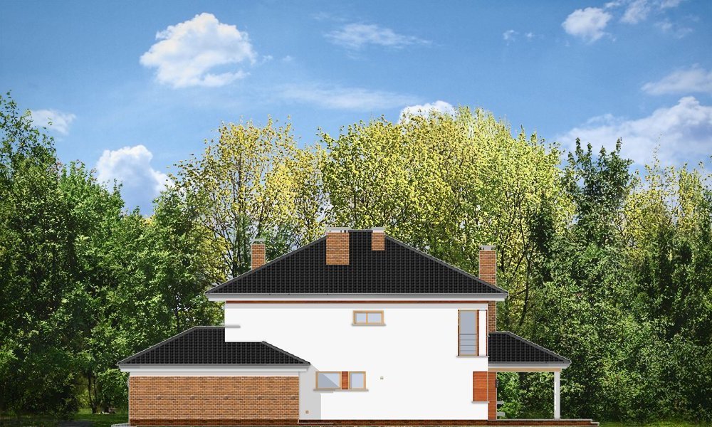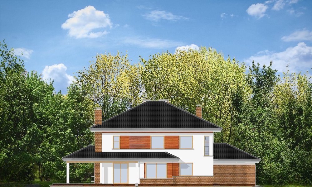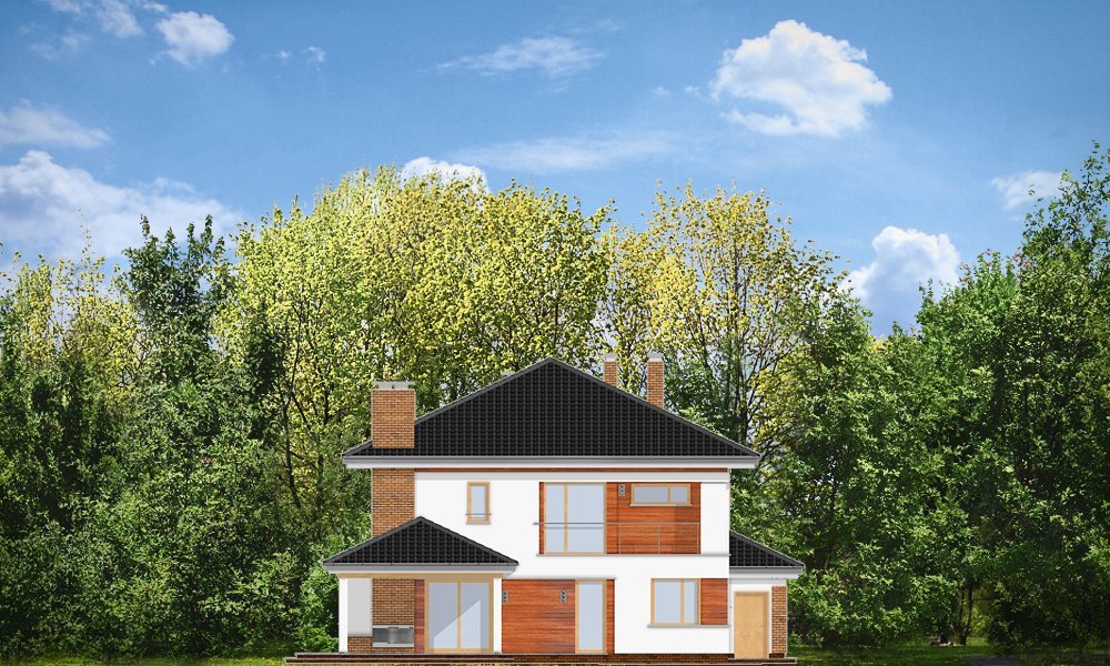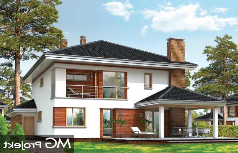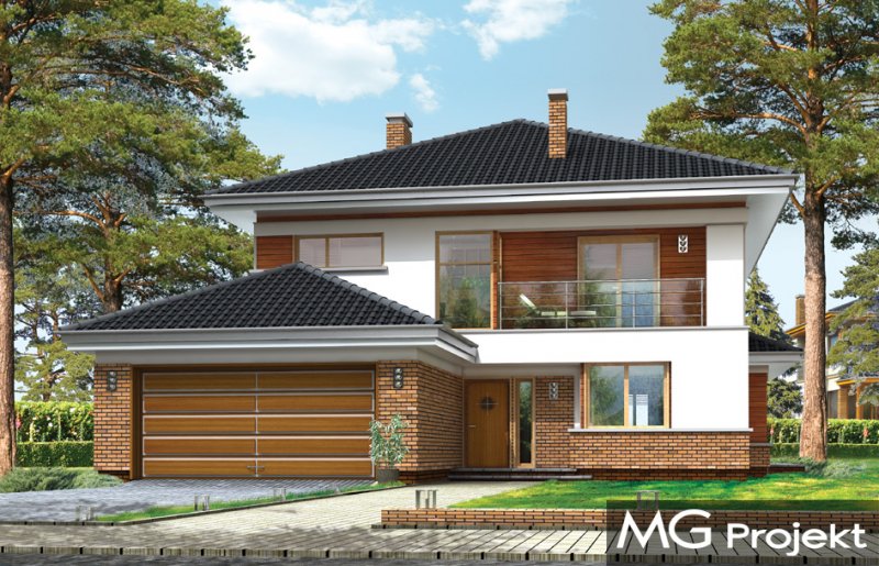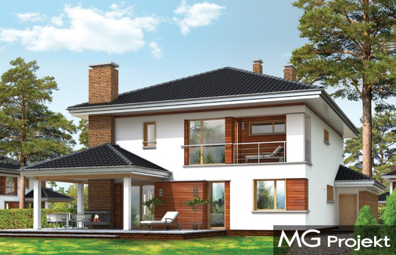 Willa na Borowej to piętrowy dom jednorodzinny dla rodziny cztero-sześcioosobowej, przykryty czterospadowym dachem. Dom jest podmiejską willą o nowoczesnej ale spokojnej architekturze. Zwarta bryła budynku z dobudowanym garażem i dużym zadaszonym podcieniem z tyłu domu, została ciekawie ozdobiona klinkierowymi i drewnianymi okładzinami elewacji, oraz loggiami i podcieniem wejściowym. Masywny ozdobny komin kominka wewnętrznego i zewnętrznego, czy narożne okna - to dodatkowe ozdoby bryły. Wszystkie elementy tworzą spójną, spokojną kompozycyjnie całość. Na parterze zaprojektowano duży salon z jadalnią i holem, z częściowo otwartą kuchnią, oraz dodatkowy pokój - gabinet lub sypialnię gościnną. Na piętrze umieszczono sypialnie, z odrębnym apartamentem rodziców, z własną łazienką, garderobą i balkonem z widokiem na ogród. Na parterze przez szerokie przeszklenia z salonu zaplanowano wyjście do dużego podcienia i na taras ogrodowy. Pracownia posiada wersję odbicia lustrzanego projektu.