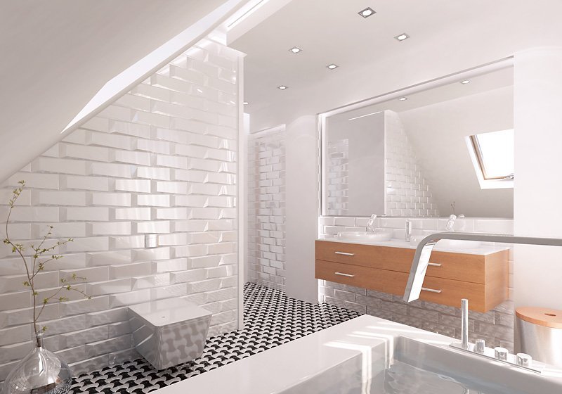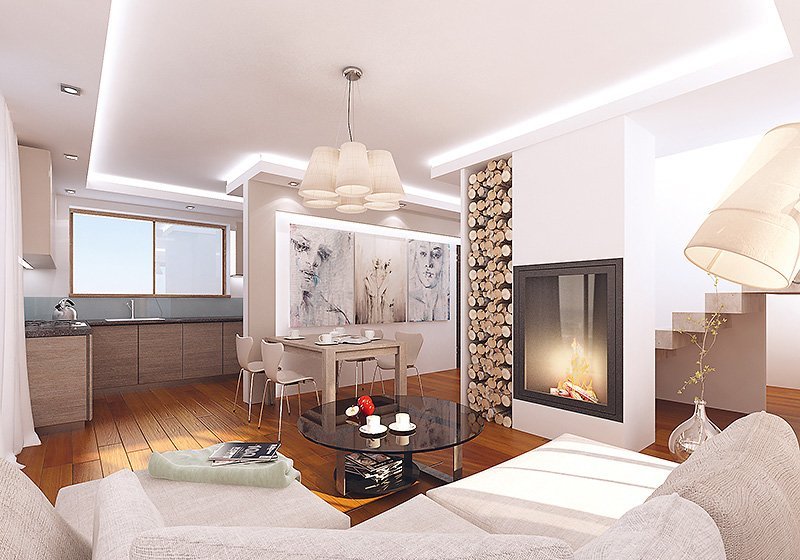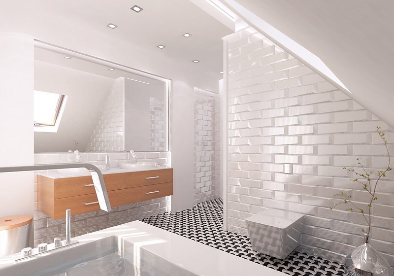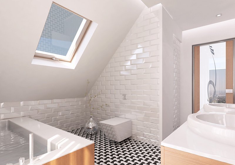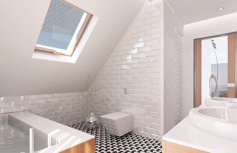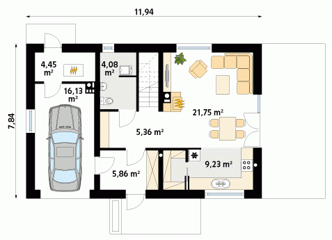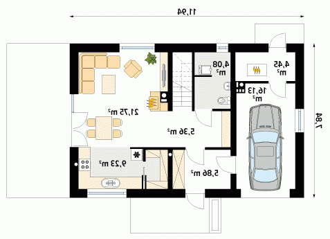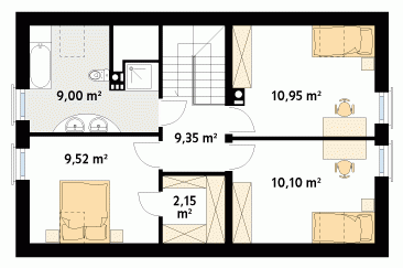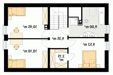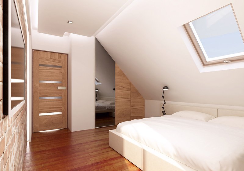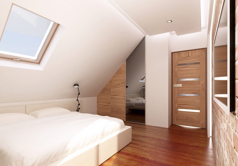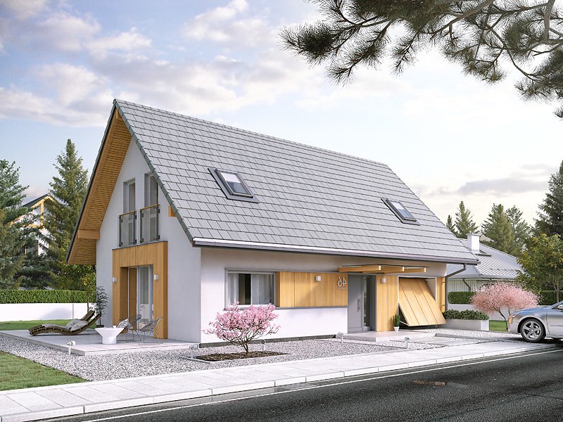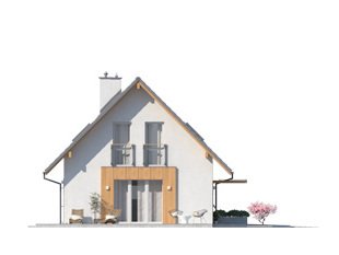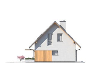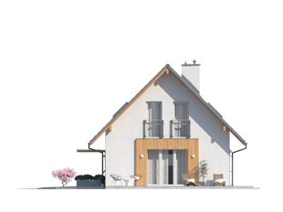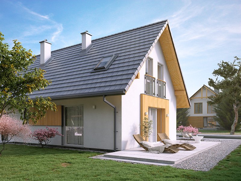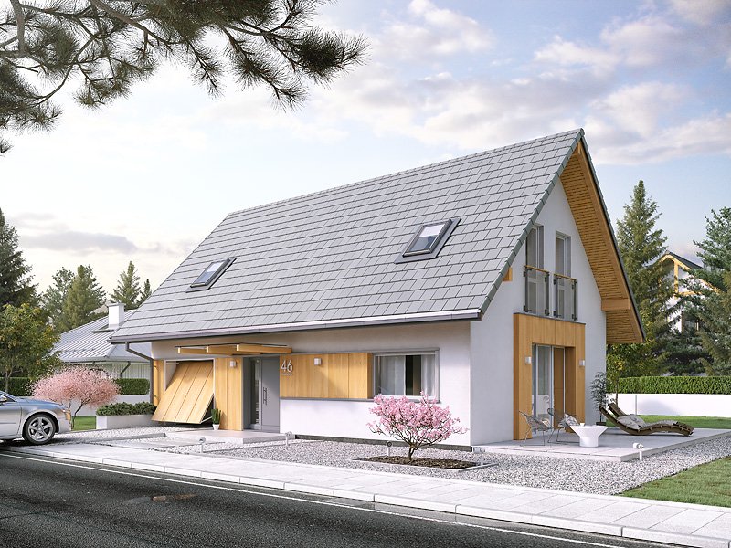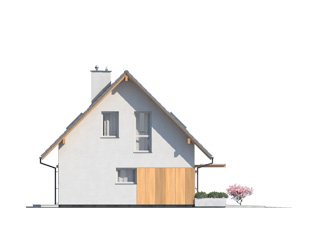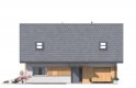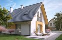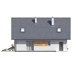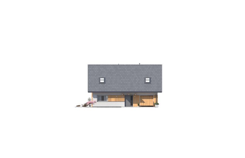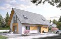 Zwarty energooszczędny dom o prostej bryle. Na poddaszu zaprojektowano przestronne trzy sypialnie z dużą łazienką i pomieszczeniem gospodarczym. Na parterze funkcjonalnie rozplanowano pomieszczenia dzienne i pomieszczenia pomocnicze. Dobrym rozwiązaniem jest połączenie domu z garażem poprzez śluzę, jaką jest wiatrołap. W kuchni znajduje się spiżarnia pomocnicze pomieszczenie dla kuchni.