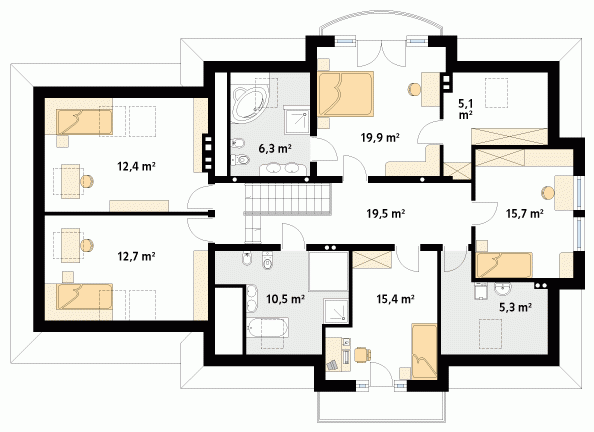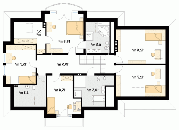 Budynek mieszkalny, jednorodzinny, parterowy z garażem dwustanowiskowym i poddaszem, przeznaczony dla 5 – 6-osobowej rodziny. Na parterze zaprojektowano pomieszczenia strefy dziennej: pokój dzienny, kuchnię, spiżarnię, dużą jadalnię, dodatkowy pokój-gabinet dostępny z wiatrołapu. Na poddaszu zaprojektowano sześć sypialni, pralnię i dwie łazienki, jedna z łazienek dostępna jest z sypialni rodziców, obok której zlokalizowano również garderobę.