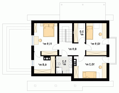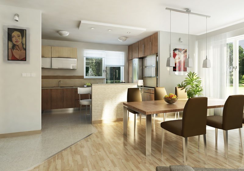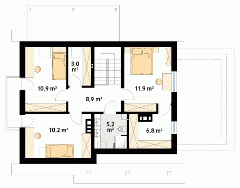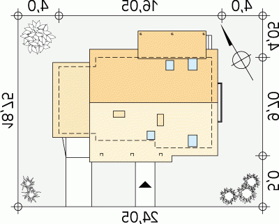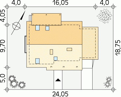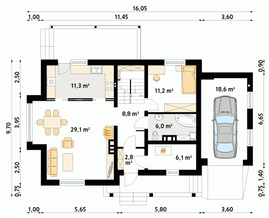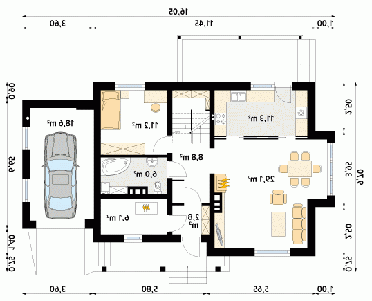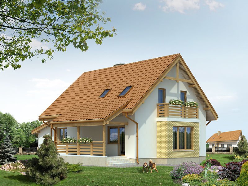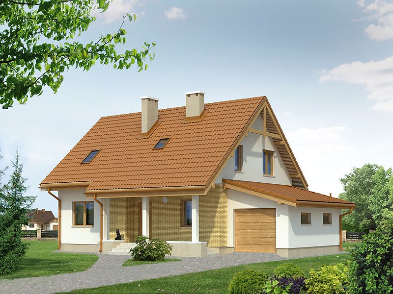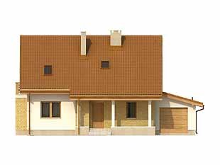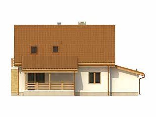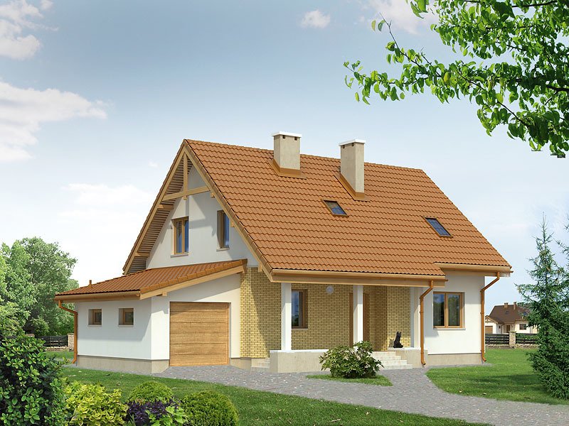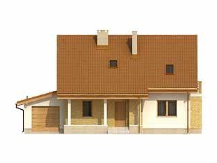 Dom jednorodzinny z poddaszem użytkowym, przeznaczony dla 4 – 5-osobowej rodziny Na parterze zaprojektowano salon z jadalnią i kuchnią, gabinet, sporą łazienkę, kotłownię, spiżarnię pod schodami oraz garaż. Na poddaszu znajdują się trzy sypialnie, łazienka, pomieszczenie gospodarcze oraz garderoba dostępna z jednego z pokoi.
