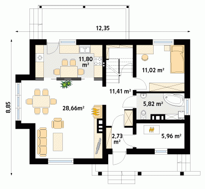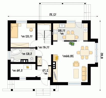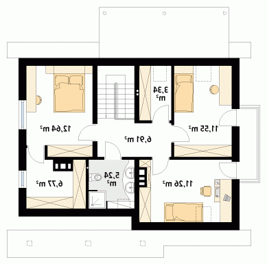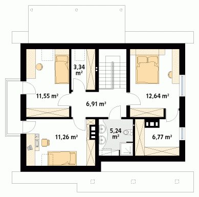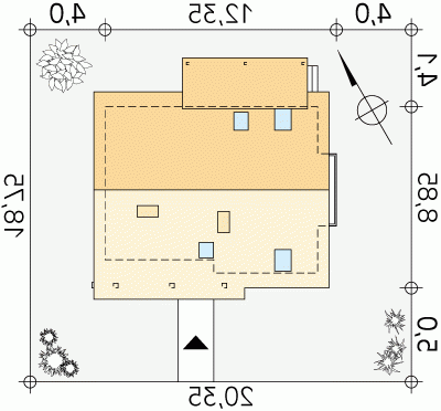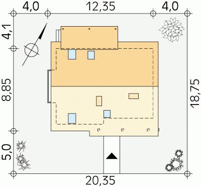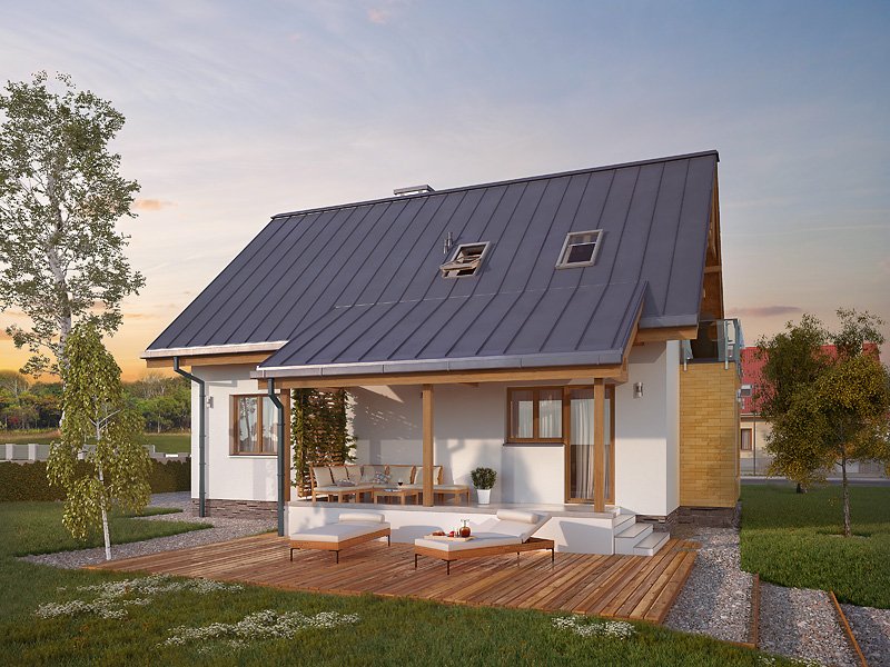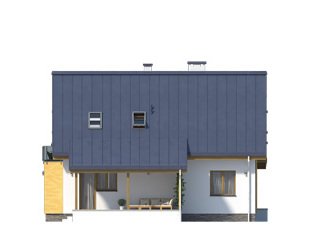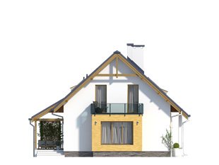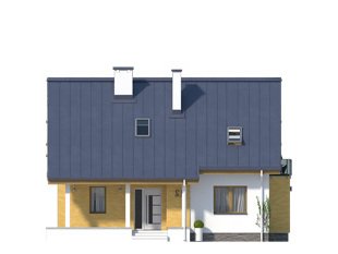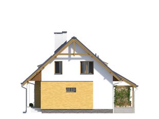 Budynek z wejściem od strony południowej, niepodpiwniczony. Projekt na parterze zawiera oprócz części dziennej dodatkowy pokój. Z kuchni mamy wygodne wyjście na zadaszony taras. Na poddaszu zaprojektowano trzy pokoje z wygodną łazienką i dwiema garderobami.