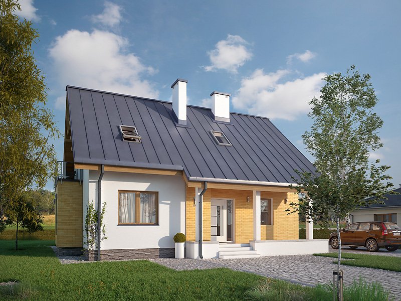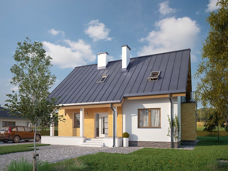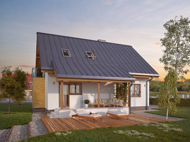 Ściany: 2-warstwowe - pustak ceramiczny + styropian, Stropy: żelbetowe, wylewane, Dach: blacha na rąbek stojący Classic Ruukki, kąt nachylenia 42°