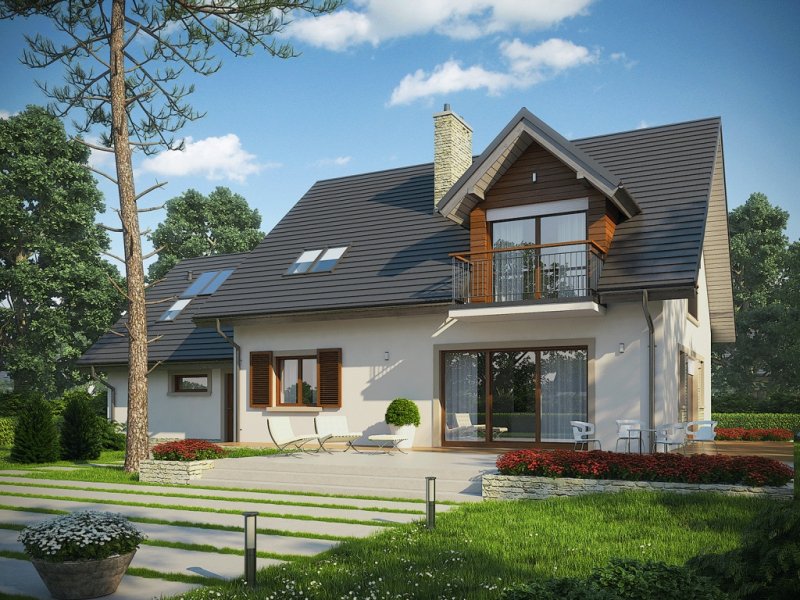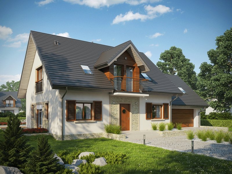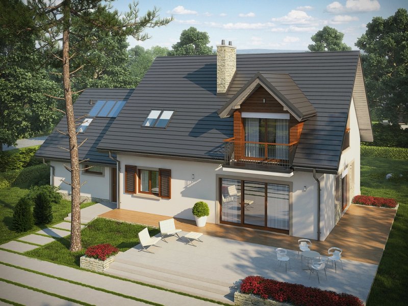 Amaranta G2 ENERGO to dom, który emanuje nowoczesną elegancją. Szlachetna forma budynku została wzbogacona atrakcyjnymi lukarnami, dzięki czemu każda z sypialni na poddaszu zyskała słoneczny charakter i dostęp do balkonu. Reprezentacyjną strefą domu jest wygodny salon, harmonijnie połączony z rozległym tarasem. Na elewacji króluje chłód bieli i kamienia, który doskonale komponuje się z dekoracyjnymi okiennicami w kolorze czekoladowego drewna.
