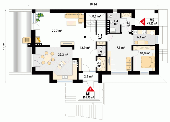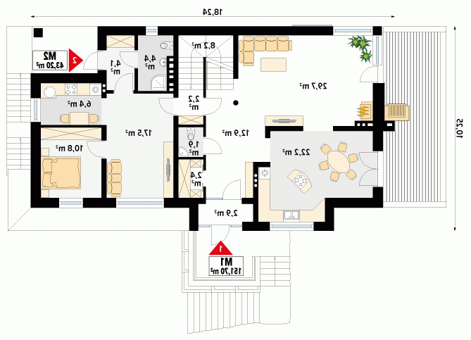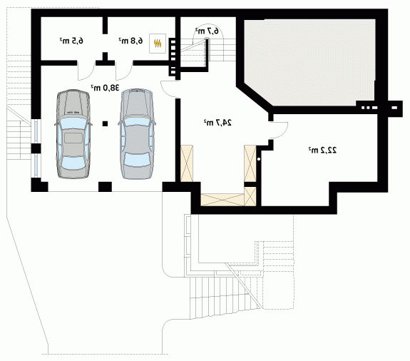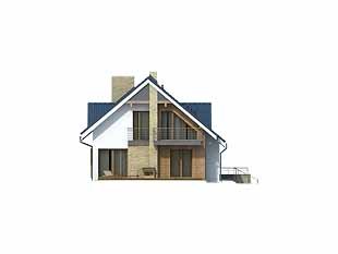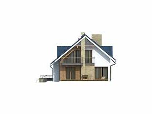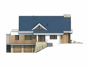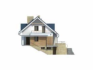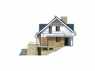 Energooszczędny dom dwurodzinny o nowoczesnej bryle, idealny na pochyły teren. Jest to budynek dwurodzinny z oddzielnymi wejściami. Pierwsze mieszkanie ma na parterze część dzienną: salon z kuchnią i wc oraz na poddaszu trzy sypialnie i łazienkę z pralnią. Drugie mieszkanie znajduje się na parterze i zawiera salon, kuchnię, sypialnię i łazienkę. Zaprojektowano również piwnicę z dwustanowiskowym garażem dostępną z dwóch mieszkań.