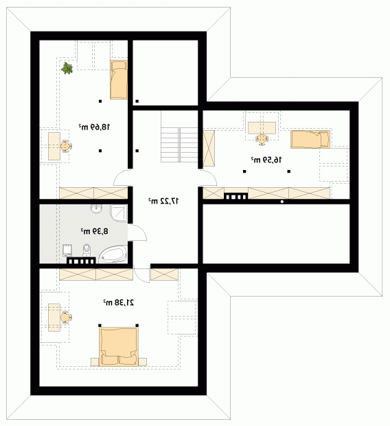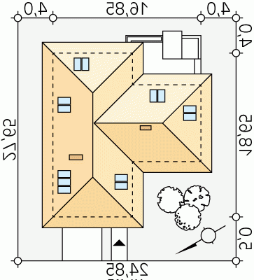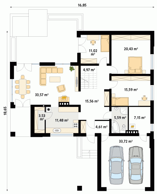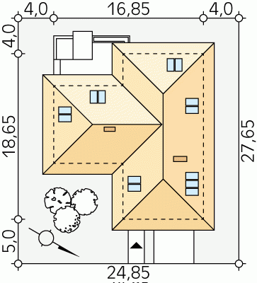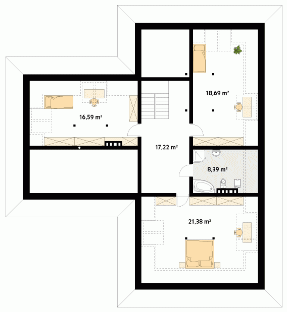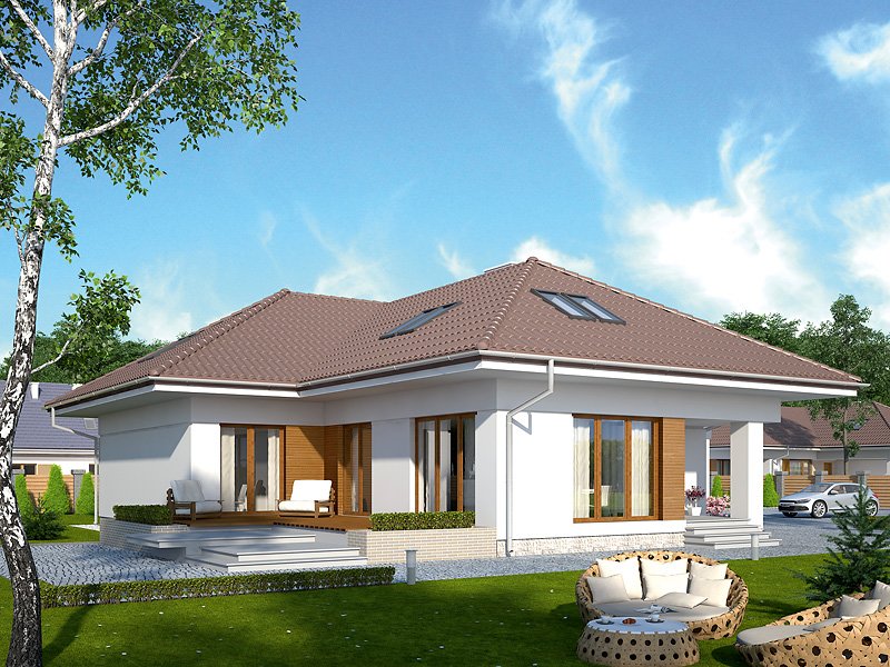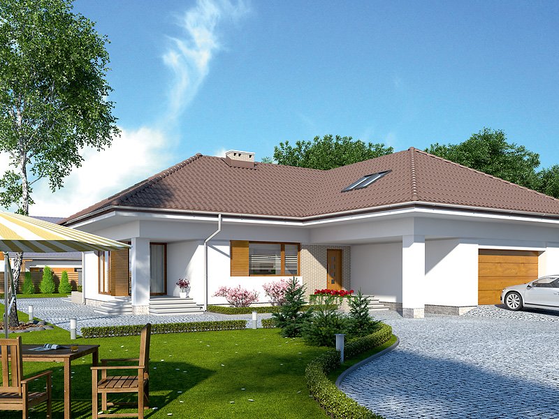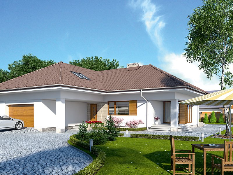 Jednorodzinny budynek mieszkalny, parterowy z użytkowym poddaszem. Na parterze przewidziano wyraźnie oddzielone części: dzienną, nocną oraz gospodarczą. Przestronne poddasze, na którym zaproponowano trzy sypialnie, może być również aranżowane w dowolny sposób. W domu zaprojektowano dwustanowiskowy garaż oraz kotłownię na każdy rodzaj paliwa.