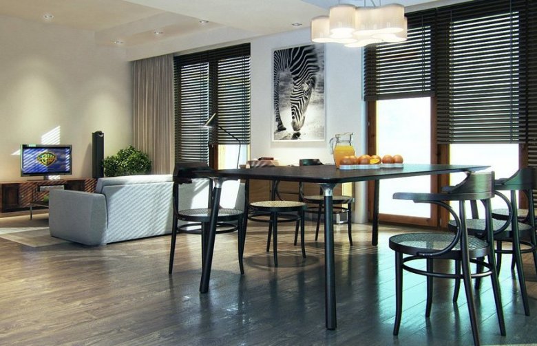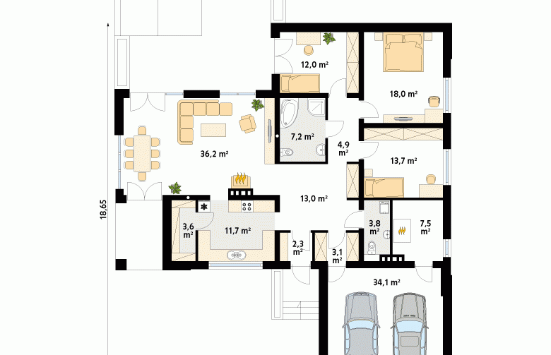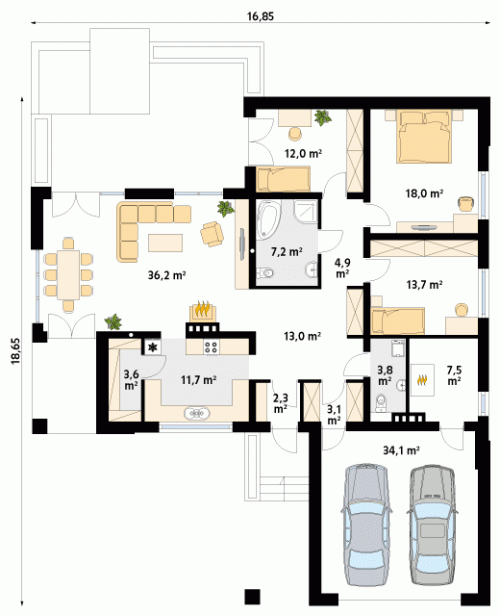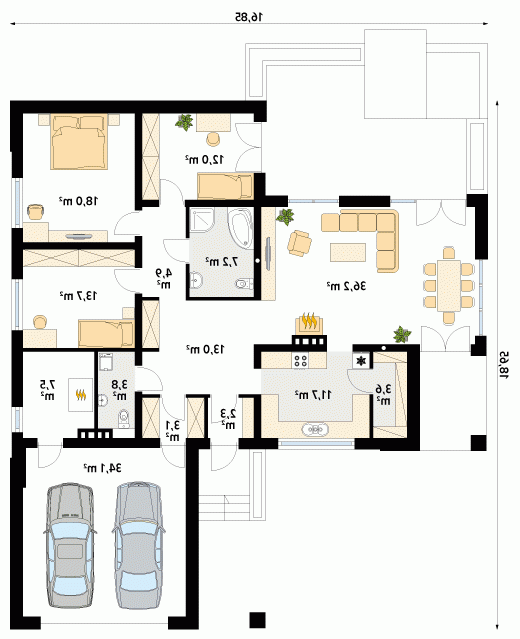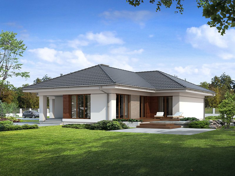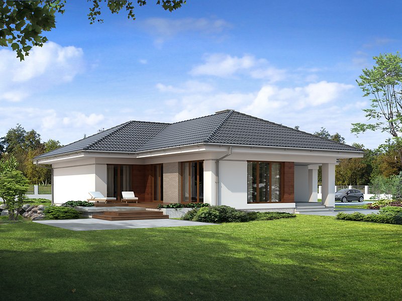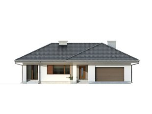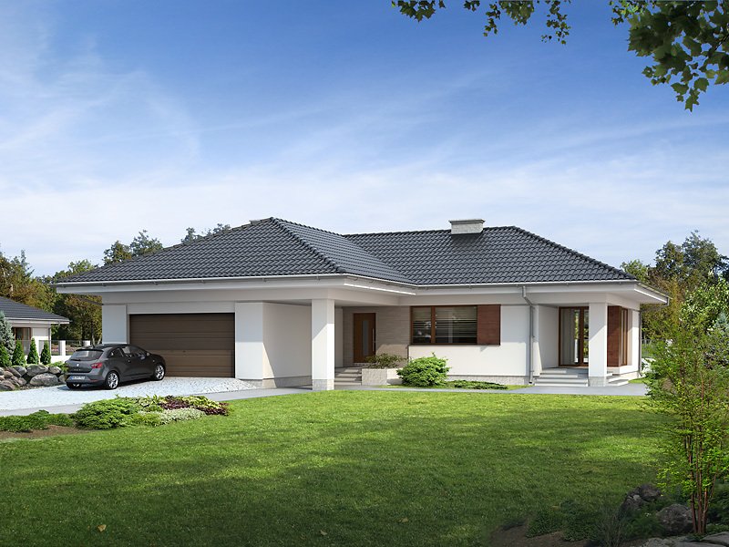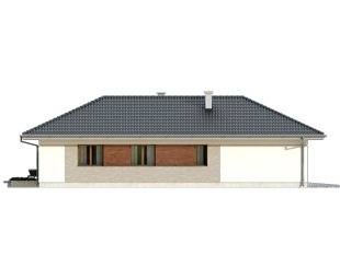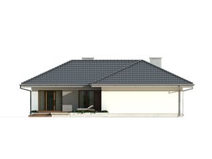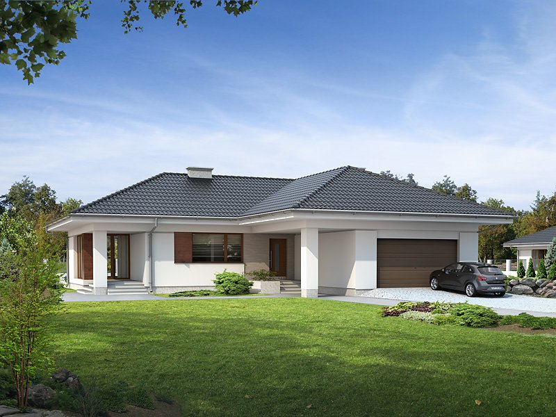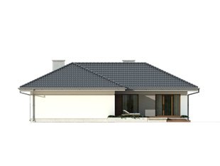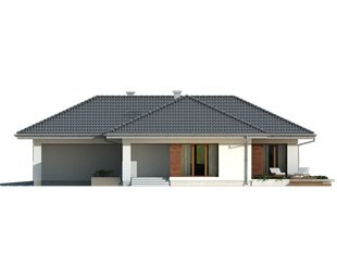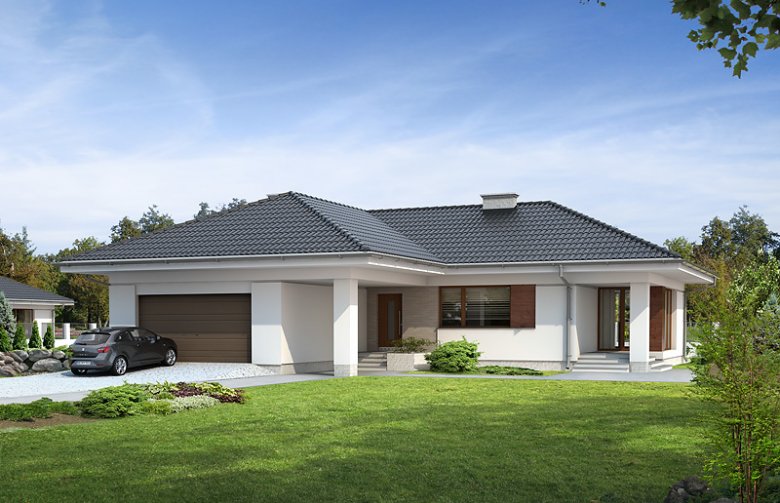 Jednorodzinny dom mieszkalny, parterowy, przeznaczony dla 4-osobowej rodziny. Wyraźny podział na część dzienną: kuchnia ze spiżarnią i salon z jadalnią; część nocną: trzy sypialnie z łazienką oraz część gospodarczą: wc, kotłownia i dwustanowiskowy garaż. Ciekawe, nowoczesne elewacje. Duży, przestronny taras.