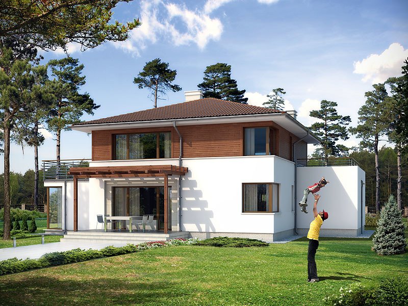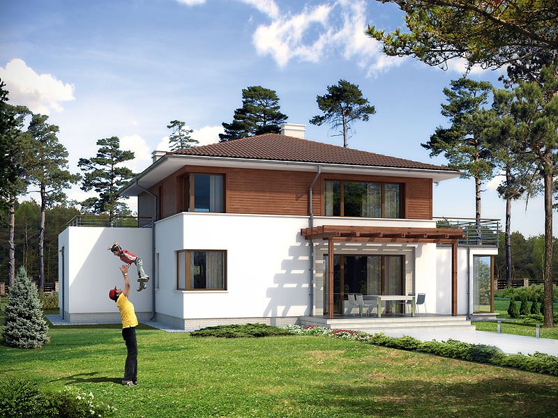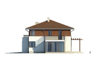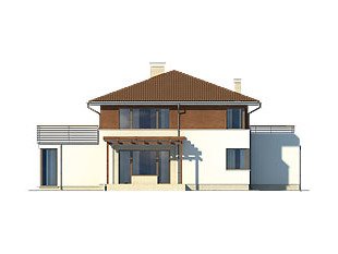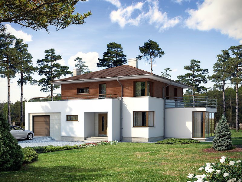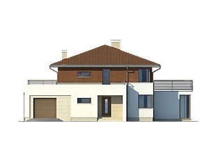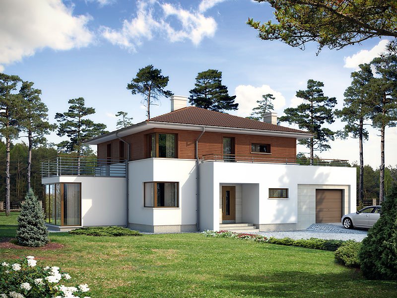 Dwukondygnacyjny dom jednorodzinny z jednostanowiskowym garażem, niepodpiwniczony. Współczesna stylistyka odróżnia go od typowych projektów z użytkowym poddaszem. Dzięki dwóm pełnym kondygnacjom istnieje możliwość łatwej aranżacji pomieszczeń. Na parterze, oprócz pokoju dziennego, kuchni i jadalni, zaprojektowano dodatkowy pokój z łazienką. Wygodę użytkowania gwarantują liczne pomieszczenia dodatkowe: na parterze dwa pomieszczenia gospodarcze i spiżarnia, na poddaszu odrębna pralnia i garderoba.