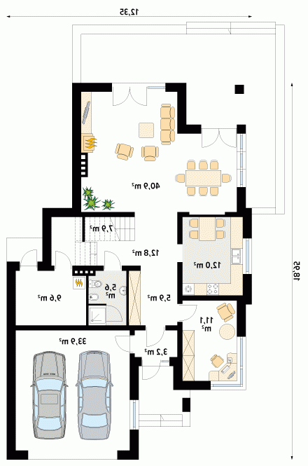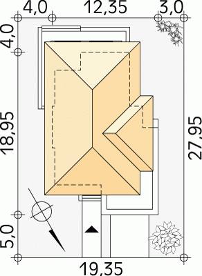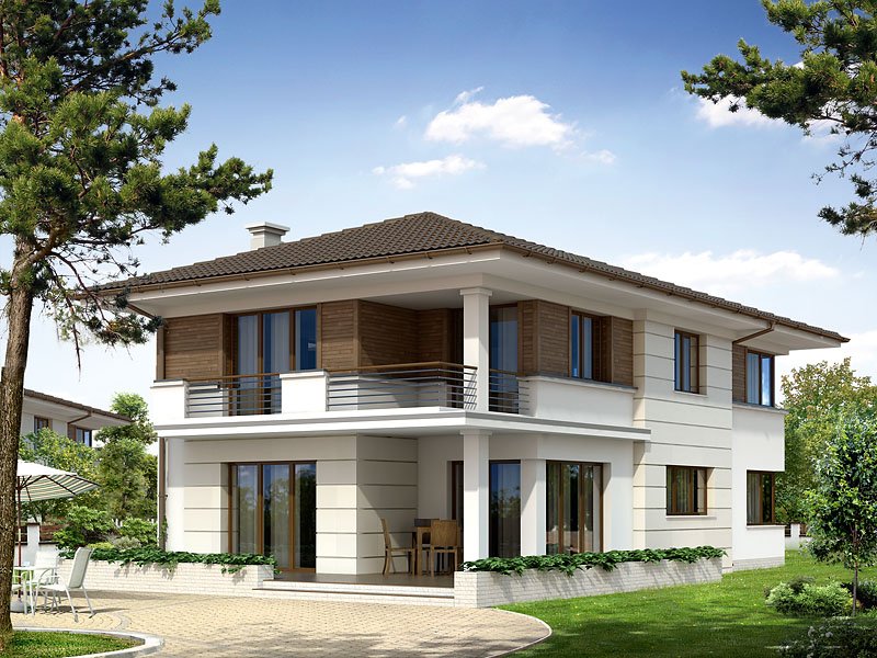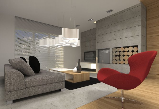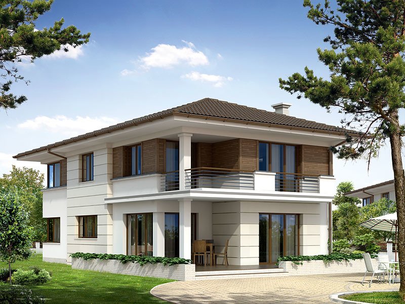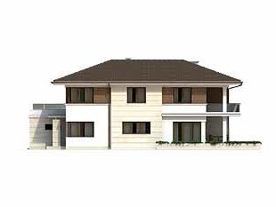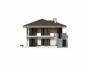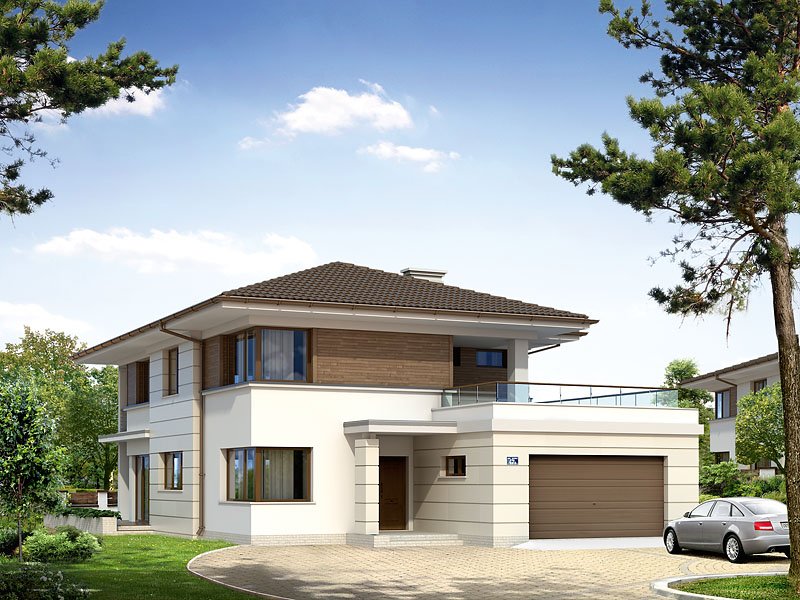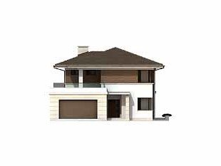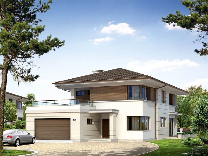 Dom jednorodzinny, piętrowy, niepodpiwniczony, z garażem dwustanowiskowym. Przeznaczony dla 5-osobowej rodziny. Posiada zadaszony taras w parterze oraz drugi, dostępny z sypialni na piętrze. Na parterze, oprócz pokoju dziennego, kuchni i jadalni, zaprojektowano dodatkowy pokój.