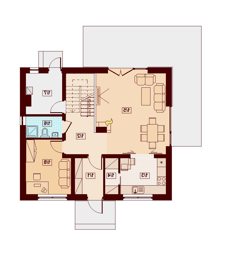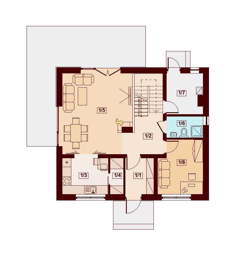 Na parterze zlokalizowana jest obszerna strefa dzienna składająca się z kuchni (która w zależności od potrzeb może być zamykana lub otwarta) jadalni oraz salonu otwartego na taras i ogród. Uzupełnieniem kuchni jest pojemna spiżarnia. Schody w holu w zależności od potrzeb mogą być otwarte na salon powiększając w ten sposób przestrzeń dzienną i stanowiąc ciekawy element architektoniczny, mogą też być odizolowane ścianką działową od salonu. Dzięki doświetleniu strefy dziennej zarówno od strony ogrodu jak i z boku dom nadaje się na każdą działkę, zarówno z wjazdem od północy jak i od południa, wschodu bądź zachodu. Dodatkowo na parterze zaprojektowano pokój który może służyć jako pokój gościnny bądź gabinet, łazienkę oraz pomieszczenie gospodarcze. W wiatrołapie przewidziano miejsce na dużą szafę wnękową.