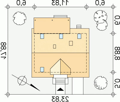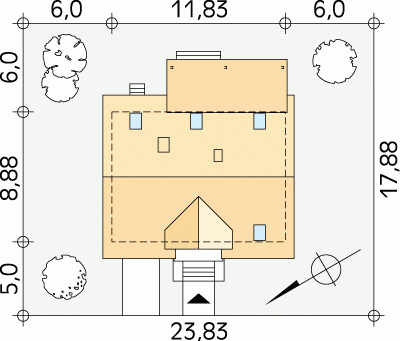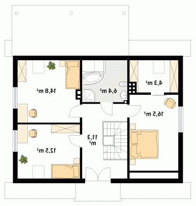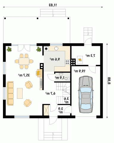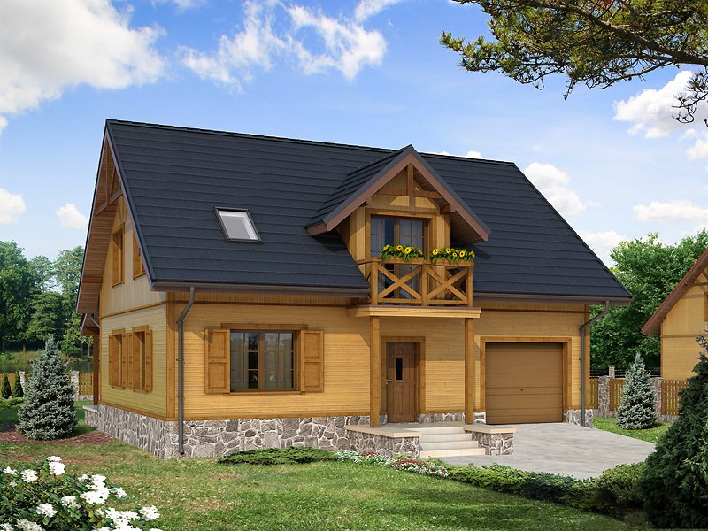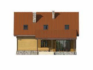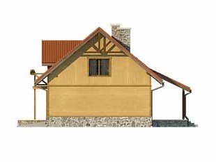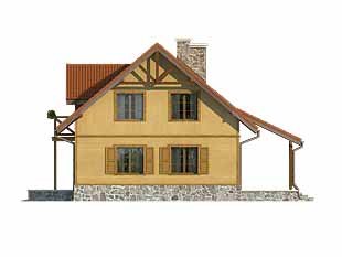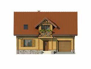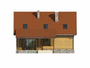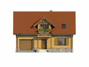 Dom parterowy z użytkowym poddaszem, niepodpiwniczony, przeznaczony dla 4-osobowej rodziny. Przestronny zadaszony taras. Rozwiązanie pomieszczeń parteru (salonu i jadalni) umożliwia usytuowanie domu zarówno od północy jak i południa. Na parterze znajduje się salon, jadalnia kuchnia, wc; w części gospodarczej – kotłownia i garaż. Na poddaszu zaprojektowano 3 sypialnie, w tym jedna z garderobą oraz łazienkę.