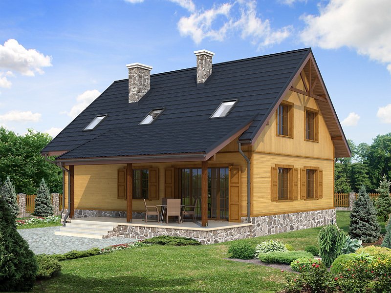 Ściany: szkielet drewniany, Stropy: belki drewniane, Dach: dachówka gontopodobna GERARD CORONA, kąt nachylenia 40°