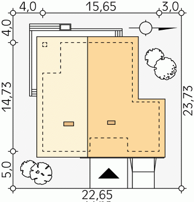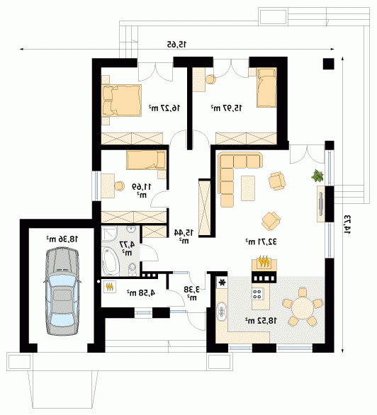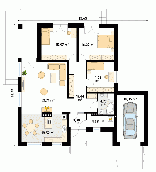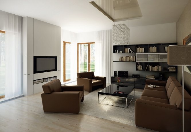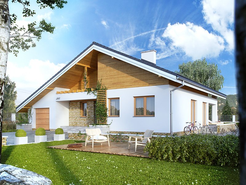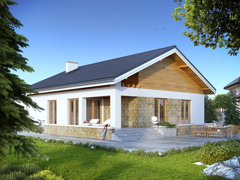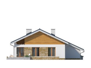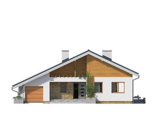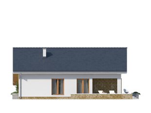 Jednorodzinny dom parterowy z garażem, przeznaczony dla 4-osobowej rodziny. Funkcjonalny układ pomieszczeń z wyraźnym podziałem na część dzienną i nocną. W prostej bryle budynku zaprojektowano przestronny, otwarty salon z kuchnią i jadalnią oraz częściowo zadaszony taras. W części nocnej przewidziano trzy przestronne sypialnie.