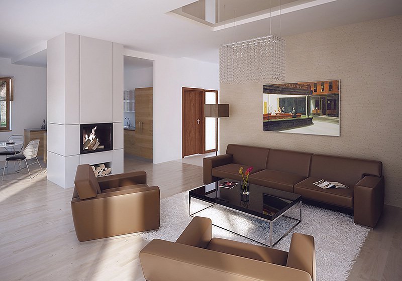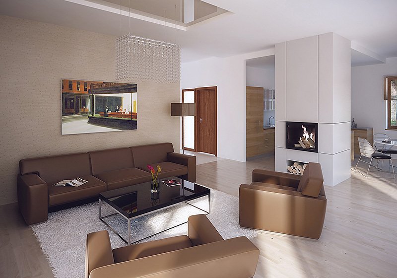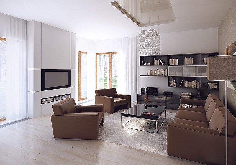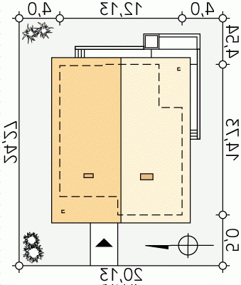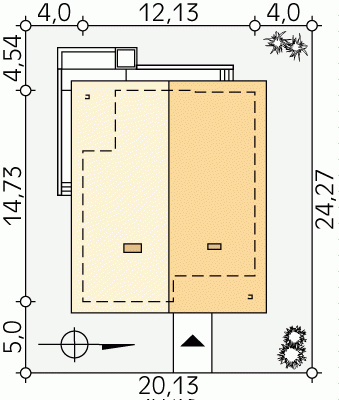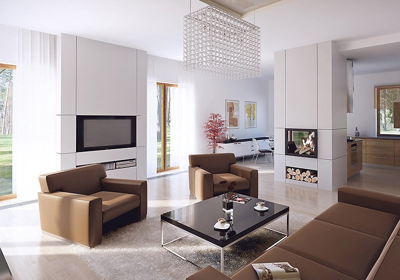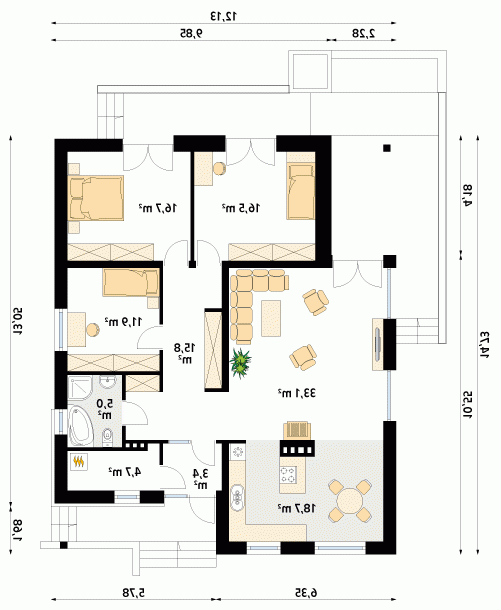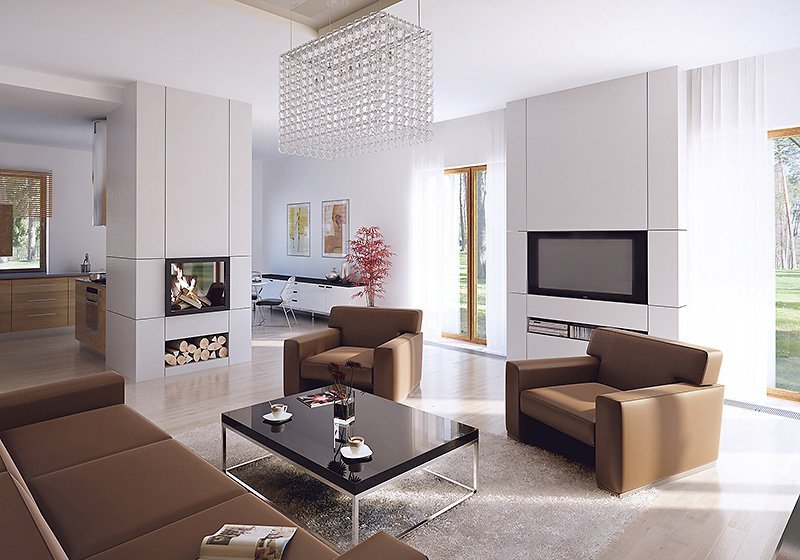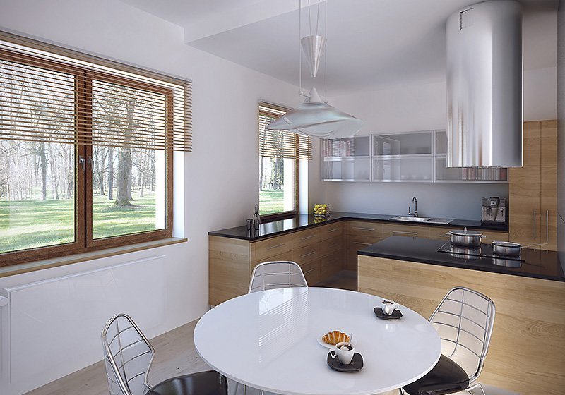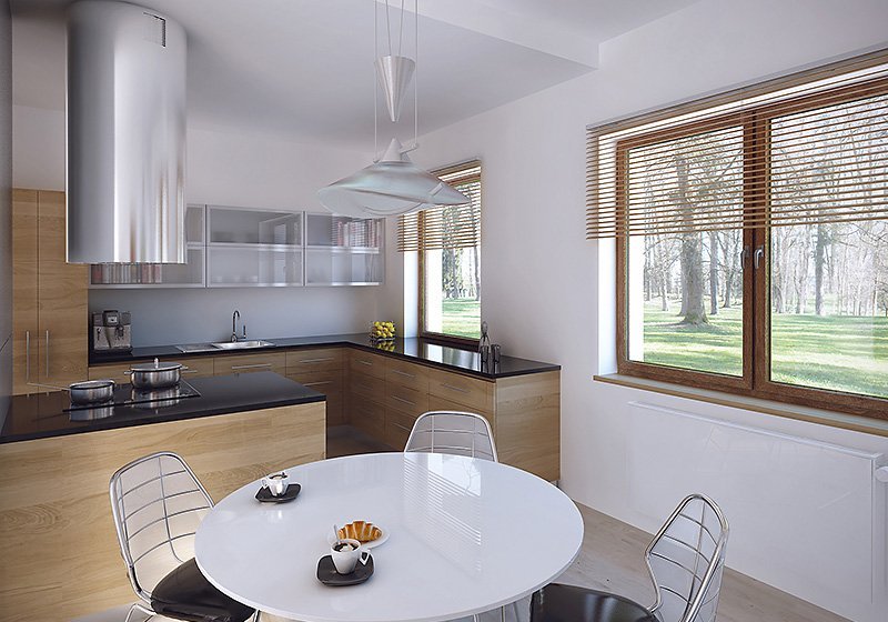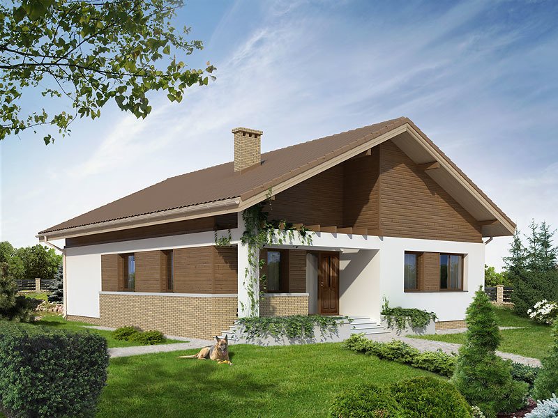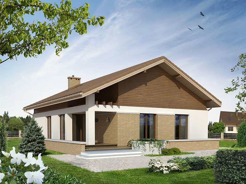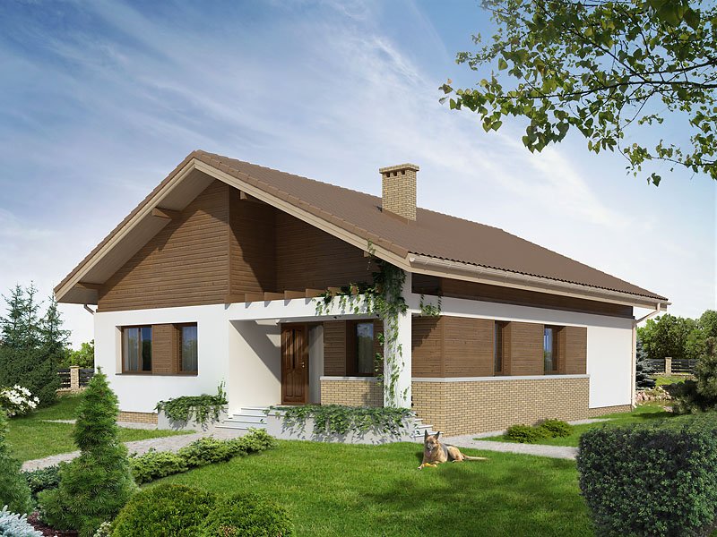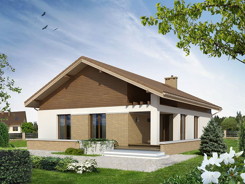 Jednorodzinny dom parterowy, przeznaczony dla 4-osobowej rodziny. Funkcjonalny układ pomieszczeń z wyraźnym podziałem na część dzienną i nocną. W prostej bryle budynku zaprojektowano przestronny, otwarty salon z kuchnią i jadalnią, oraz częściowo zadaszony taras. W części nocnej przewidziano trzy przestronne sypialnie.