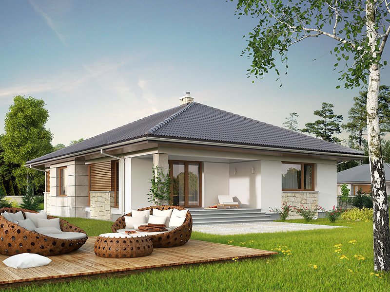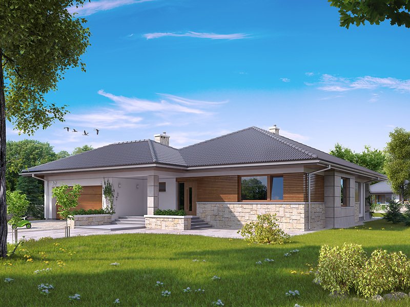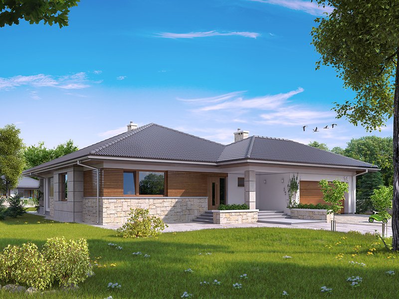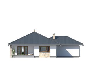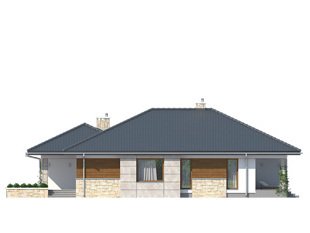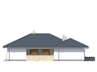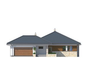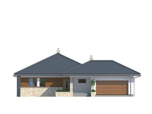 Bardzo wygodny dom jednorodzinny z dwustanowiskowym garażem interesująco ożywiającym bryłę budynku. Dodatkowymi atutami podnoszącymi komfort domu jest wydzielona jadalnia, spiżarnia, wc i przestronny hol wejściowy w części dziennej. Część nocną tworzą trzy sypialnie z dużą łazienką. Salon spełni rolę wypoczynkową zarówno zimą - dzięki kominkowi, jak i latem poprzez duże przeszklenia i otwarcie na zadaszony taras .