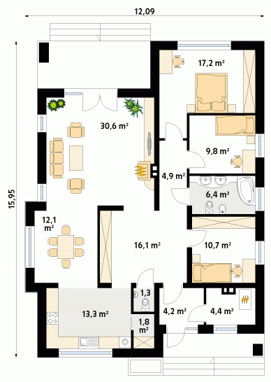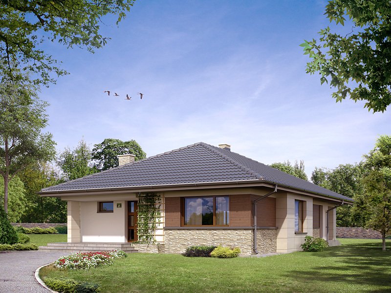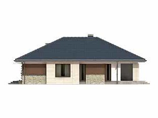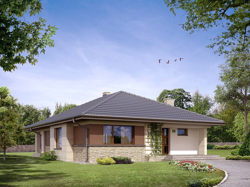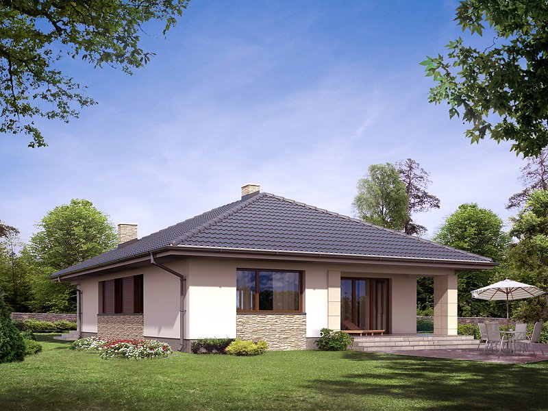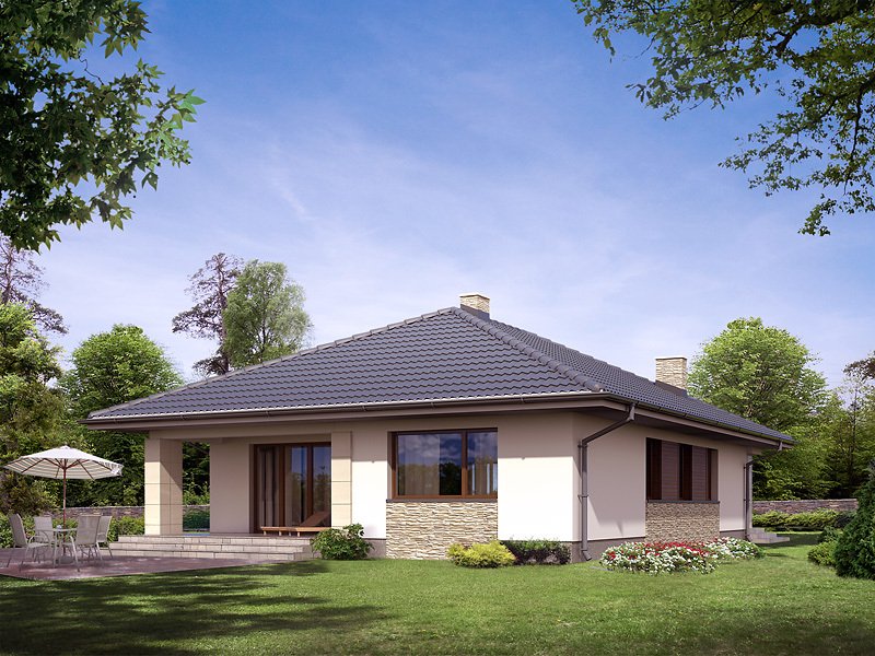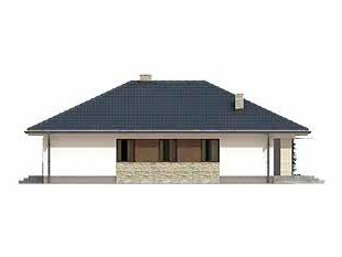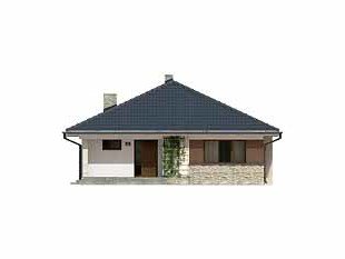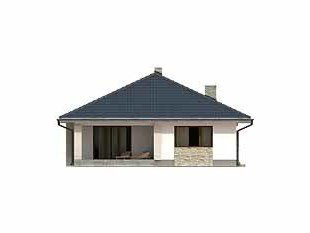 Dom jednorodzinny, parterowy. Posiada zadaszony taras dostępny z salonu. W projekcie zastosowano wyraźny podział na część dzienną i nocną. Dom idealny dla 4-osobowej rodziny.