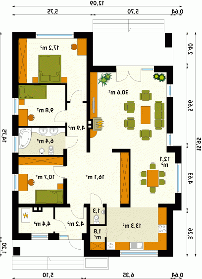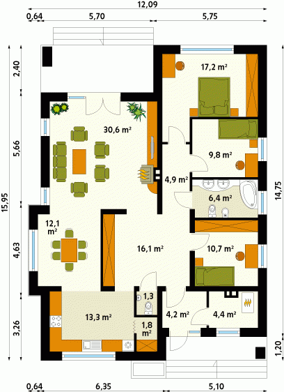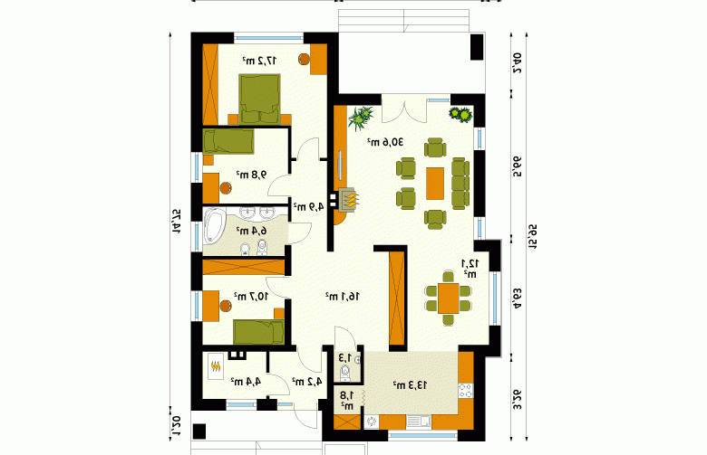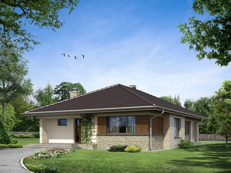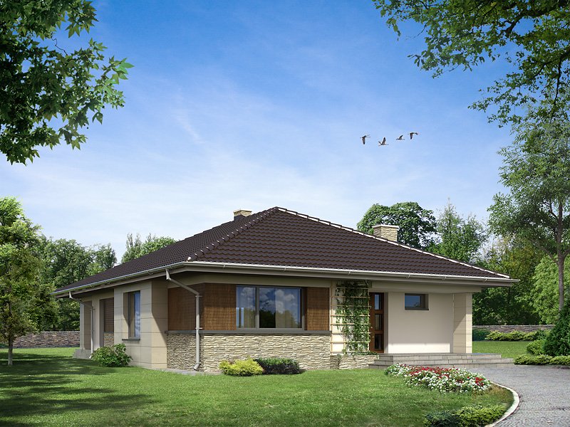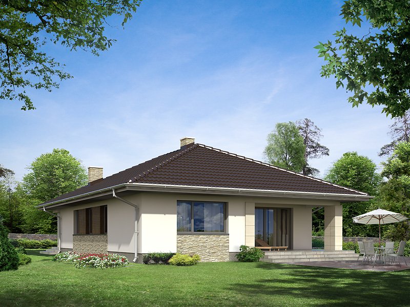 Dom jednorodzinny, parterowy. Posiada zadaszony taras dostępny z salonu. W projekcie zastosowano wyraźny podział na część dzienną i nocną. Dom idealny dla 4-osobowej rodziny. Dom zaprojektowany w technologii Multi-Comfort z zastosowaniem produktów marki Saint-Gobain łączy unikalne właściwości produktów z rozsądną ceną. Standard Multi-Comfort oznacza szereg korzyści, takich jak: niskie koszty ogrzewania, komfort termiczny, akustyczny, dobra jakość powierza, bezpieczeństwo przeciwpożarowe (klasa A1). Wszystko to jest możliwe za sprawą zastosowanych w projekcie sprawdzonych materiałów znanych i cenionych marek: Isover, Weber, Rigips, Glassolutions. Produkty Grupy Saint-Gobain są wytwarzane z naturalnych materiałów i posiadają deklaracje środowiskowe. W procesie eksploatacji budynki zaprojektowane w technologii Multi-Comfort posiadają niewielkie zapotrzebowanie na energię pierwotną. Więcej informacji o domach w standardzie Multi-Comfort: www.multi-comfort.pl
