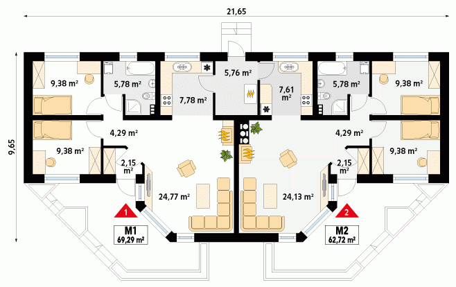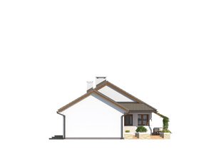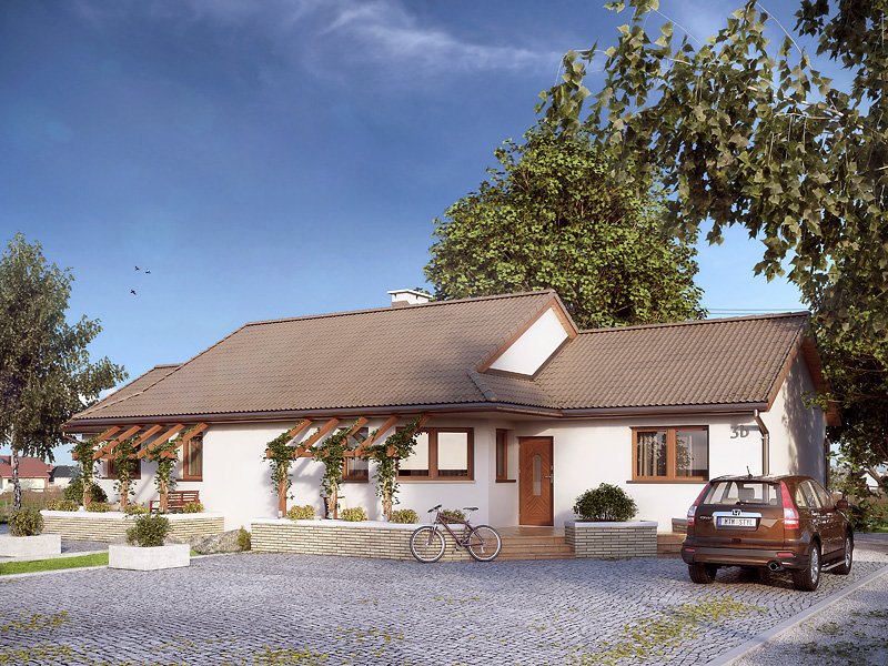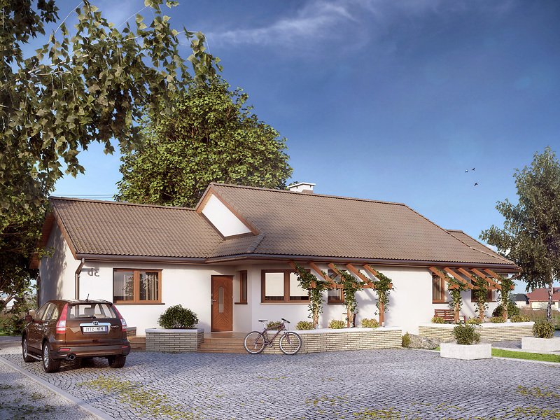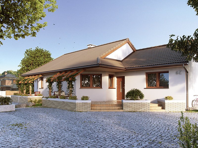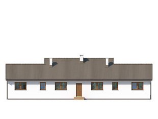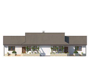 Budynek mieszkalny dwulokalowy, parterowy, niepodpiwniczony. Program użytkowy dla jednej części budynku na parterze: pokój dzienny połączony z kuchnią, dwie sypialnie, łazienka, wiatrołap oraz wspólna kotłownia. W pokoju dziennym znajduje się kominek będący dodatkowym żródłem ciepła na chłodniejsze dni. Budynek posiada częściowo zadaszony taras z efektowną pergolą.