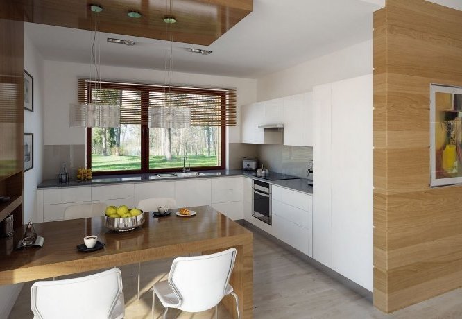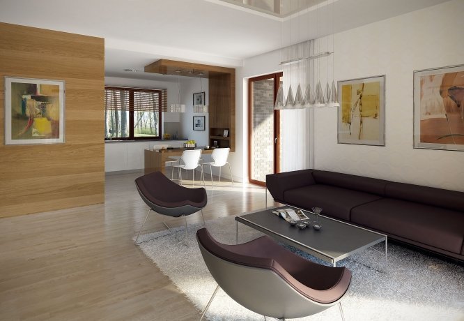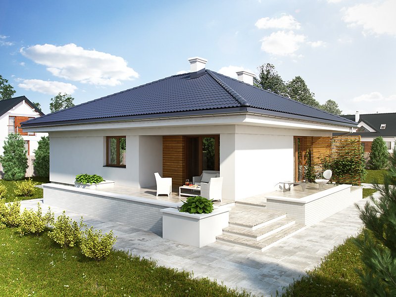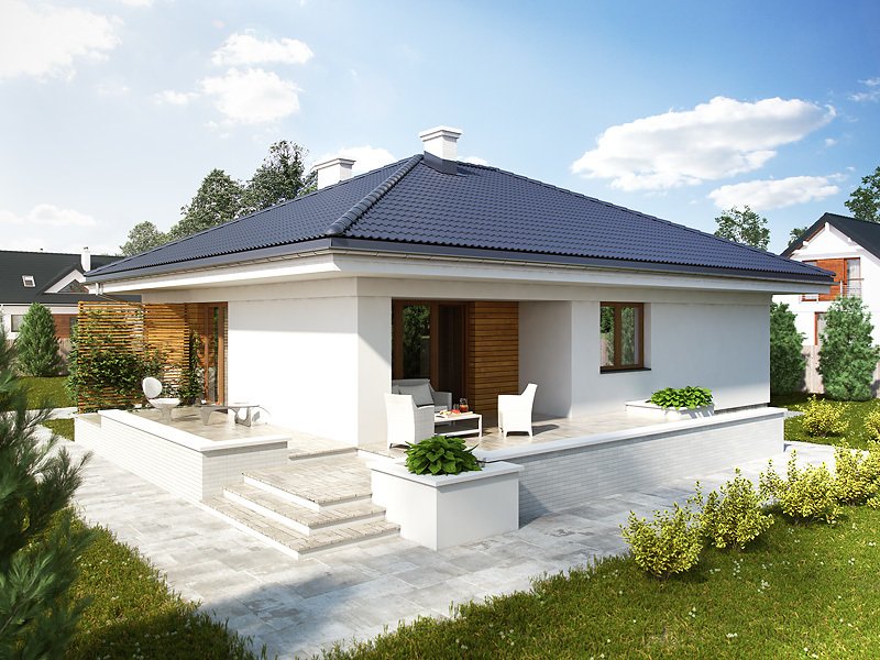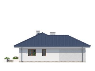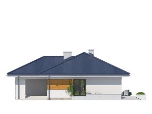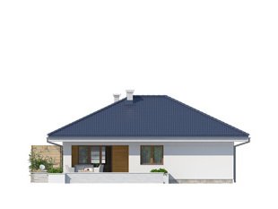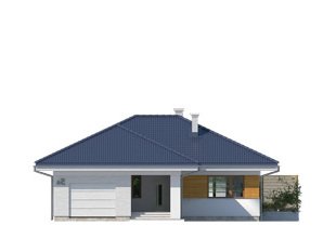 Parterowy niewielki dom jednorodzinny zaprojektowany z myślą o komforcie 4-osobowej rodziny. Obszerny jednostanowiskowy garaż pomieści również dodatkowy jednoślad czy kosiarkę. Wnętrze, pomimo skromnej powierzchni , dzięki licznym przeszkleniom sprawia lekkie i przestronne wrażenie. Ciekawa bryła z wejściem zaakcentowanym podcieniem posiada wewnątrz klasyczny podział na część dzienną i nocną.