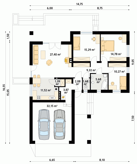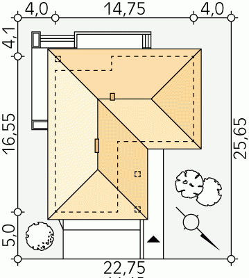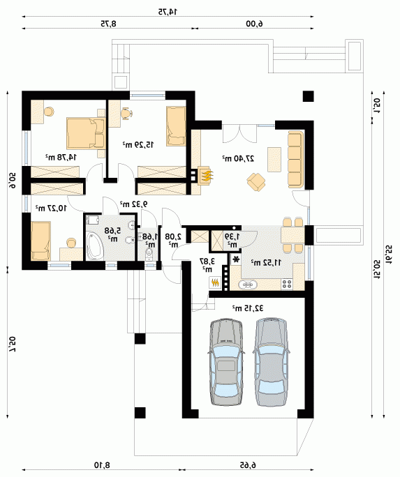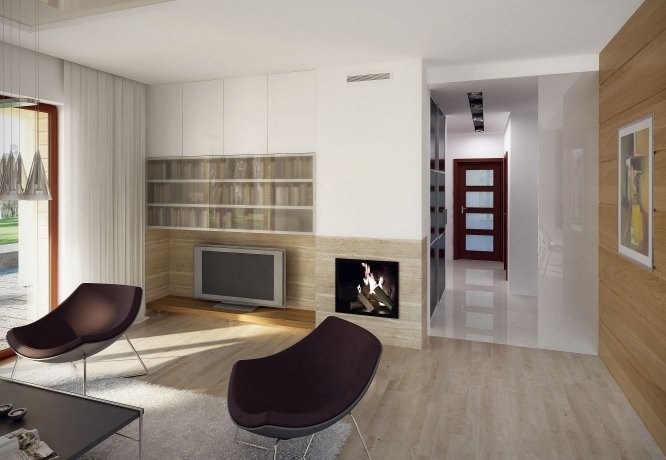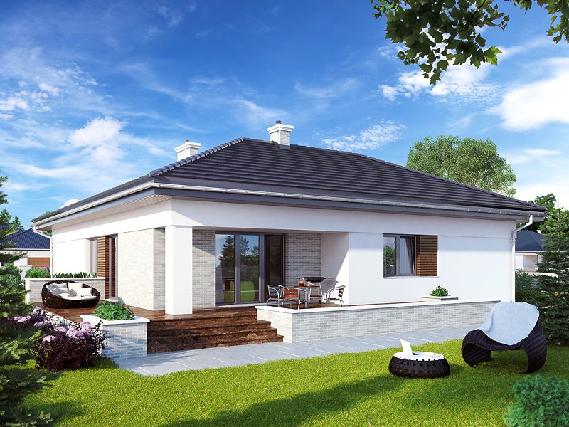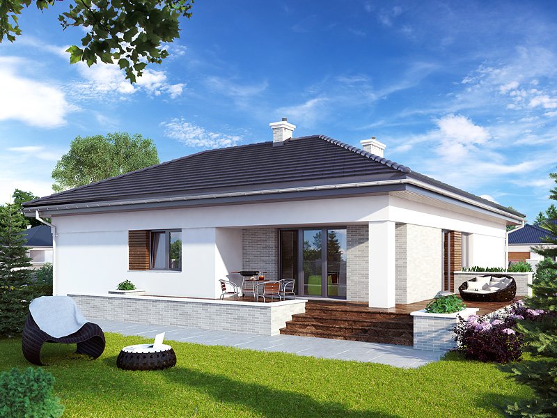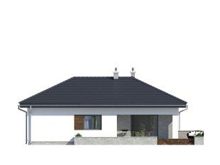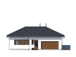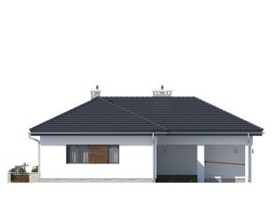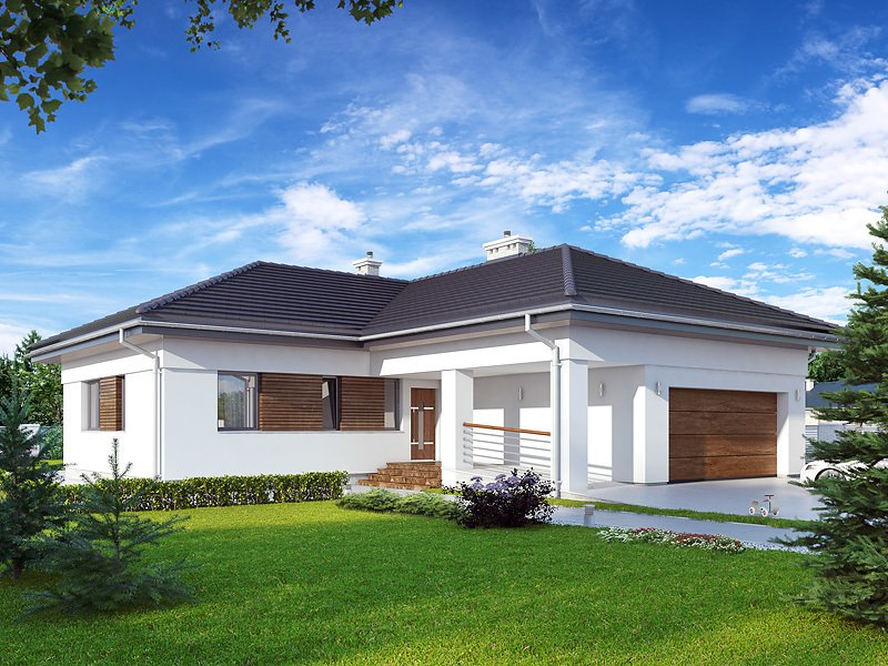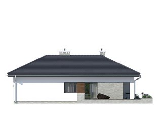 Wygodny i przestronny dom dla 4-osobowej rodziny z dwustanowiskowym garażem. Dodatkowo, dla podwyższenia komfortu zaprojektowano w nim spiżarnię i dwie łazienki. Pochylnia połączona z podjazdem nadaje bryle nowoczesny i otwarty charakter. Część dzienna wychodzi na przestronny taras wykończony donicami do uprawy ziół. Część nocną stanowią trzy sypialnie z dwiema łazienkami.