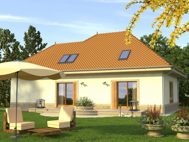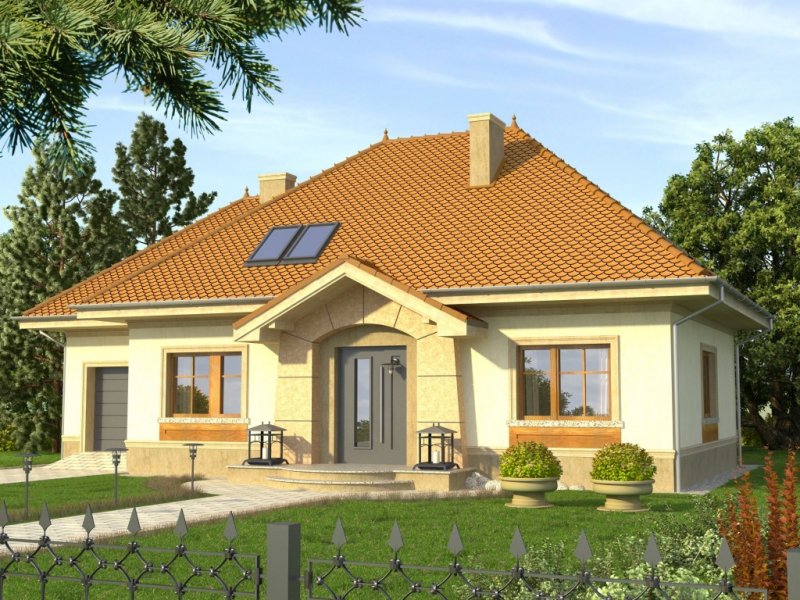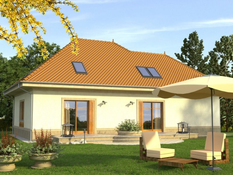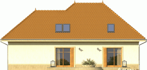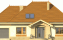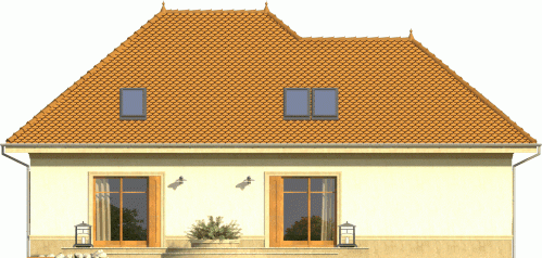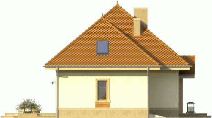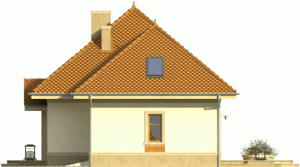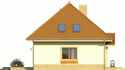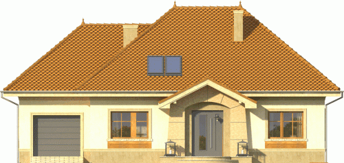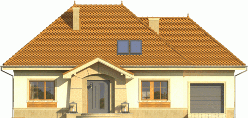 Robiąca wrażenie klasyczna willa z centralnym wejściem podkreślonym przez wysunięty daszek oraz obłożeniem ścian kamieniem albo wariantowo wykonaniem boniowania w tynku. Ekonomiczna bryła domu z umiejętnie ozdobioną strefą wejściową będzie dobrą propozycją dla osób szukających ekonomicznych i jednocześnie efektownych rozwiązań.