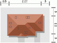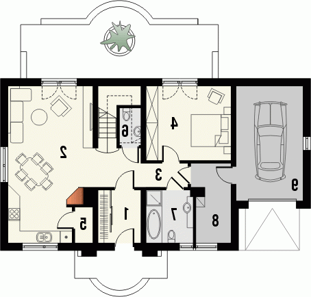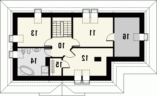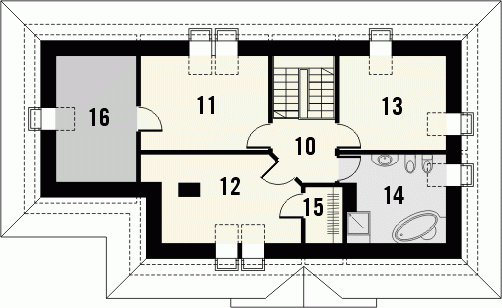 Budynek niepodpiwniczony, piętrowy, z garażem jednostanowiskowym. Parter domu mieści strefę dzienną z salonem i kuchnią ze spiżarką oraz dużą sypialnię, łazienkę, wc i pomieszczenie gospodarcze z wejściem do garażu. Funkcjonalne poddasze pod dachem stromym to trzy dodatkowe pokoje, łazienka i strych nad garażem. Dokumentacja dostępna też w odbiciu lustrzanym.