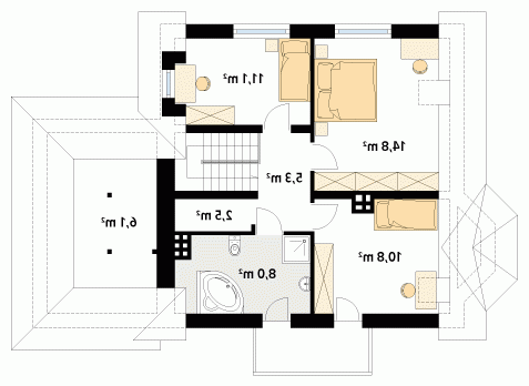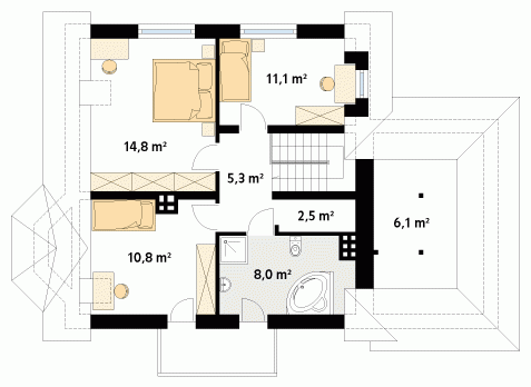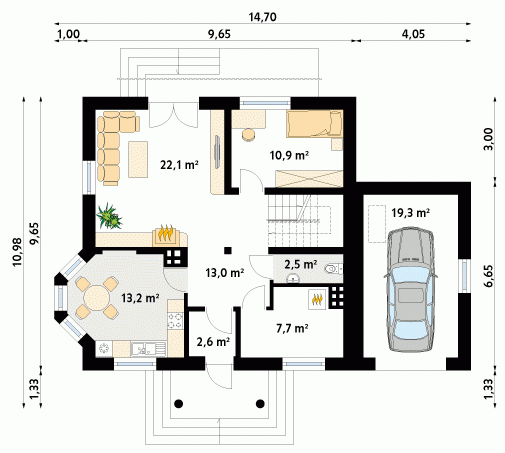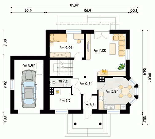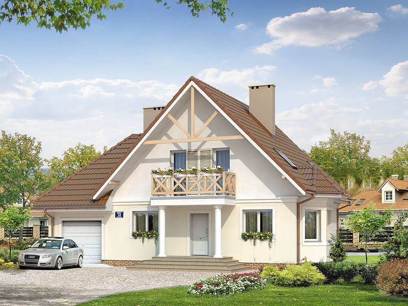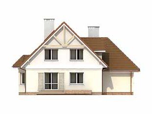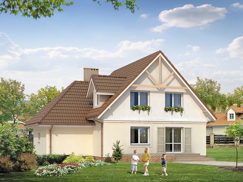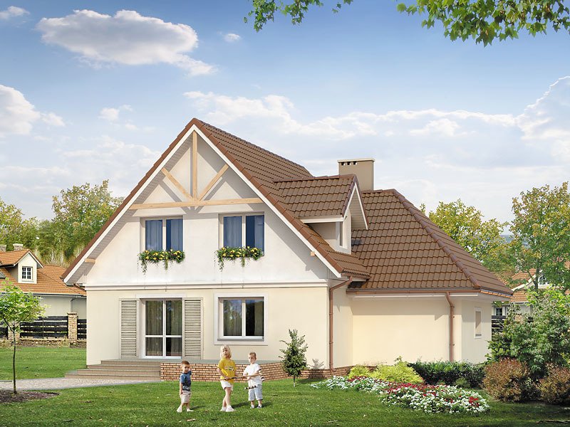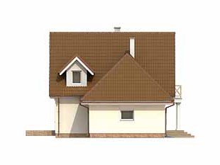 Budynek mieszkalny jednorodzinny z użytkowym poddaszem i garażem, niepodpiwniczony. Na parterze zaprojektowano dodatkowy pokój. Na poddaszu znajdują się trzy sypialnie, łazienka i garderoba. Nad garażem pomieszczenie gospodarcze. Mały, wygodny dom dla 4-osobowej rodziny.