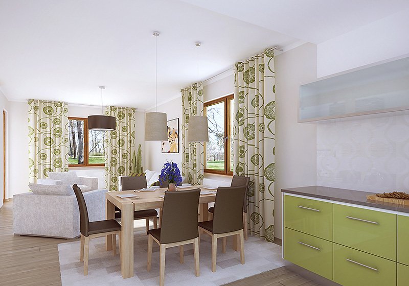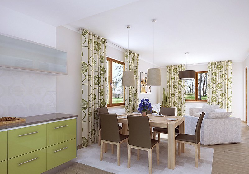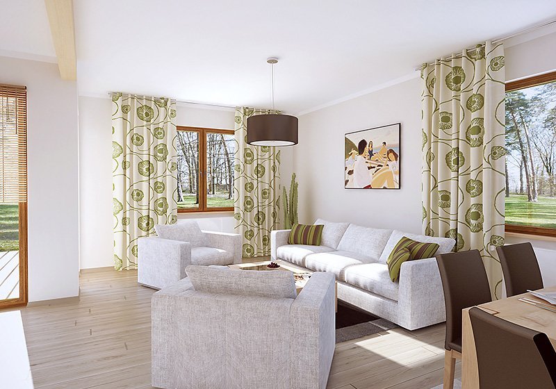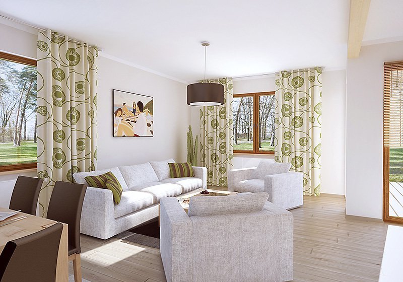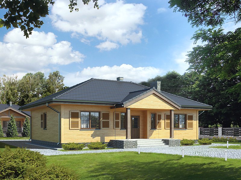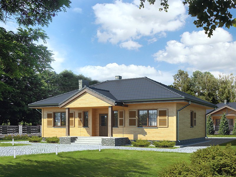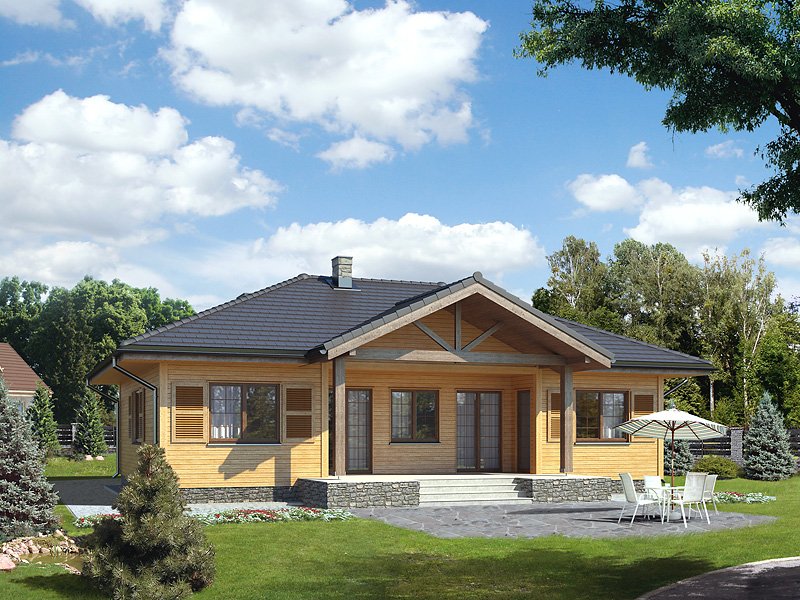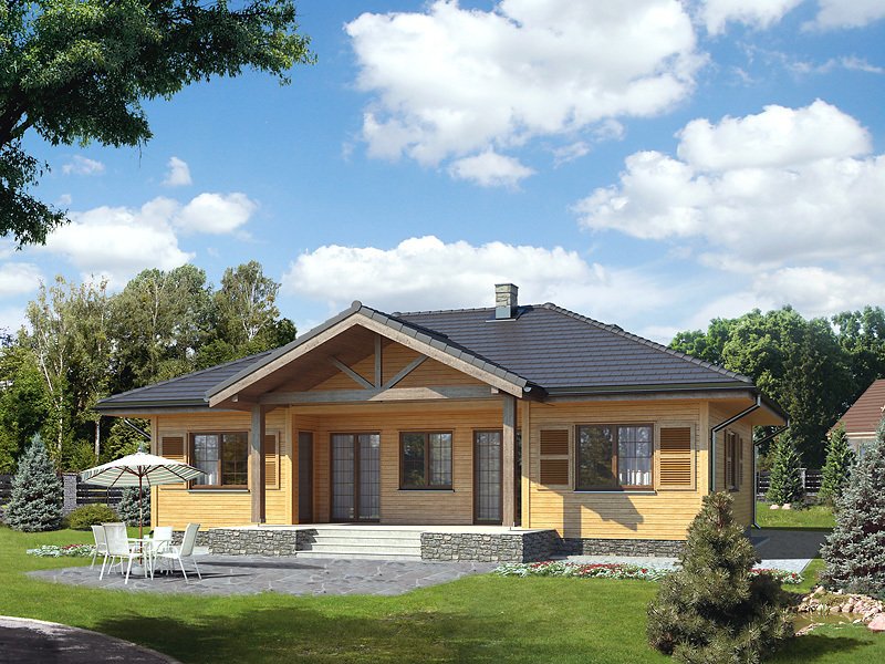 Projekt Borówka 2 dr-S to bardzo ciekawy projekt domu parterowego, zaprojektowanego w technologii drewnianej szkieletowej. W takim domu idealnie będzie się mieszkać 4 osobowej rodzinie. Olbrzymi pokój dzienny i połączona z nim kuchnia pozwoli rodzinie wspólnie spędzać czas. W części nocnej znajduję się 3 sypialnie i łazienka. Ciekawym pomysłem jest to, że na taras można wyjść nie tylko z salonu, ale także z dwóch sypialni, dodatkowo taras jest całkowicie zadaszony. Projekt zawiera małą garderobę przy sieni, i pomieszczenie gospodarcze