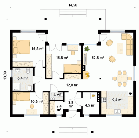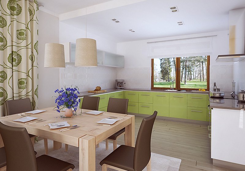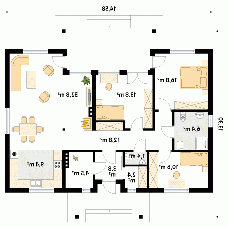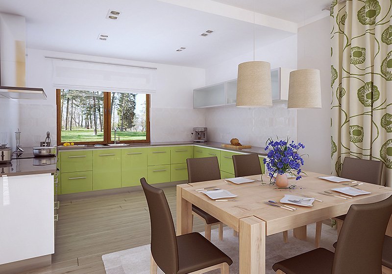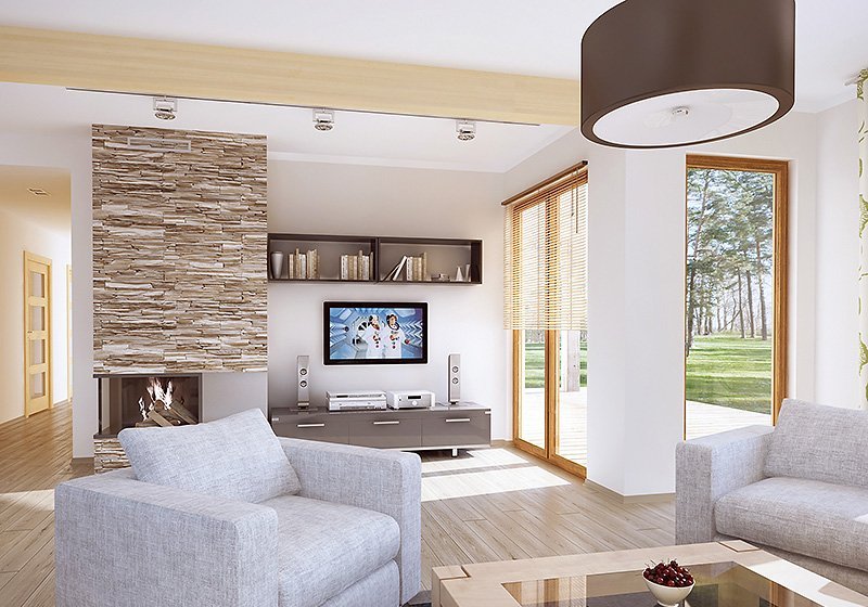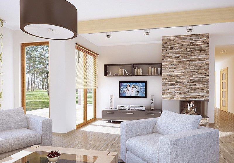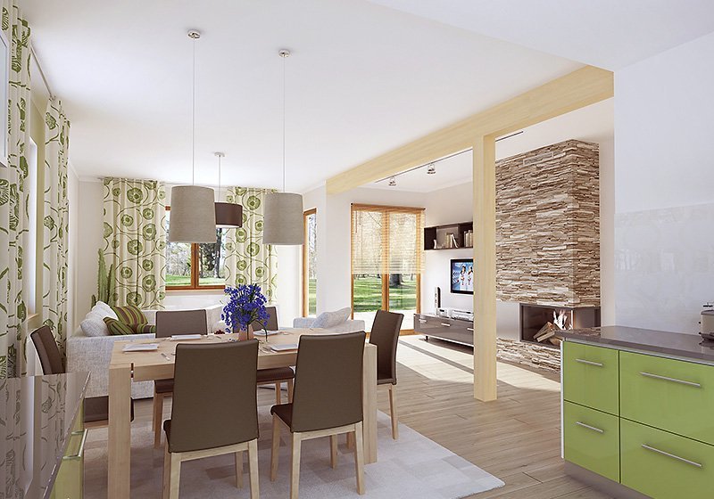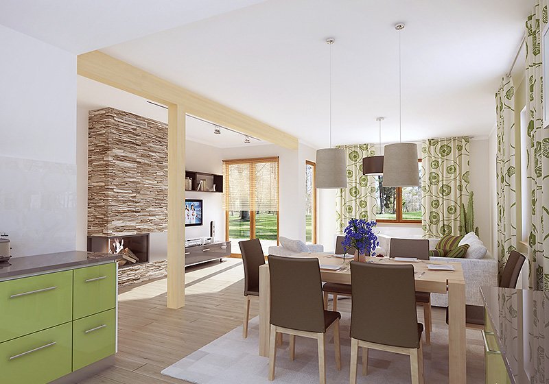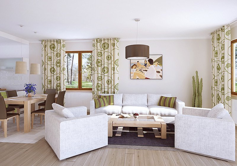 Projekt Borówka 2 dr-S to bardzo ciekawy projekt domu parterowego, zaprojektowanego w technologii drewnianej szkieletowej. W takim domu idealnie będzie się mieszkać 4 osobowej rodzinie. Olbrzymi pokój dzienny i połączona z nim kuchnia pozwoli rodzinie wspólnie spędzać czas. W części nocnej znajduję się 3 sypialnie i łazienka. Ciekawym pomysłem jest to, że na taras można wyjść nie tylko z salonu, ale także z dwóch sypialni, dodatkowo taras jest całkowicie zadaszony. Projekt zawiera małą garderobę przy sieni, i pomieszczenie gospodarcze