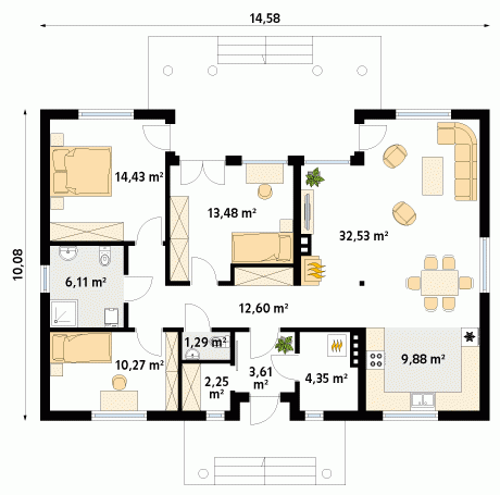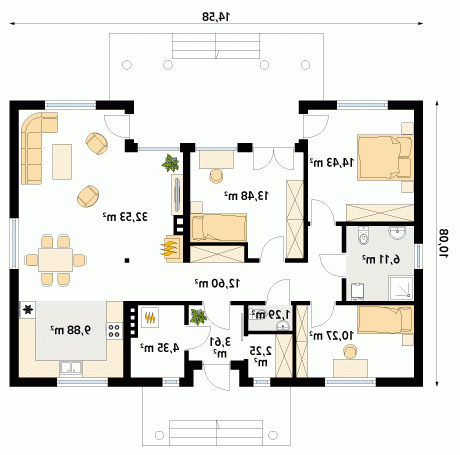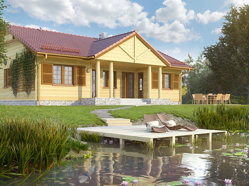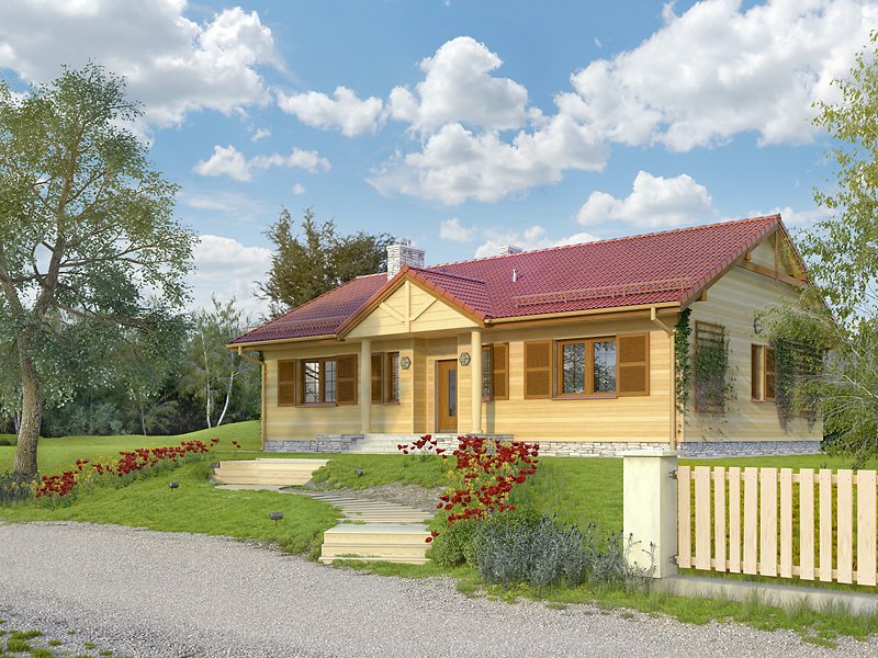 Budynek mieszkalny, parterowy, niepodpiwniczony. W budynku istnieje podział na część dzienną: salon z jadalnią i otwartą kuchnią oraz nocną: trzy pokoje i łazienka. Atutem projektu jest duży zadaszony taras od strony ogrodu z wyjściem z salonu i dwóch sypialni.