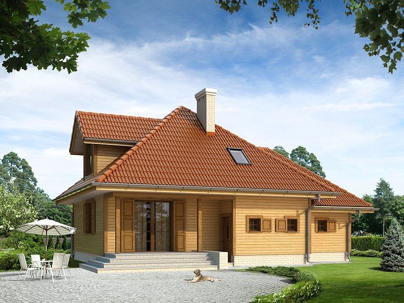 Ściany: szkielet drewniany, Stropy: belki drewniane + wełna mineralna, Dach: dachówka cementowa, kąt nachylenia 40°